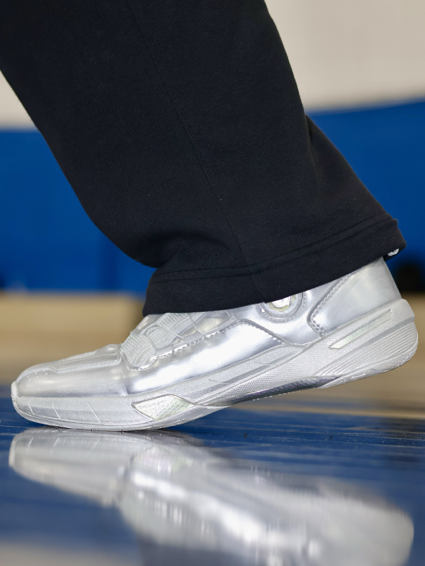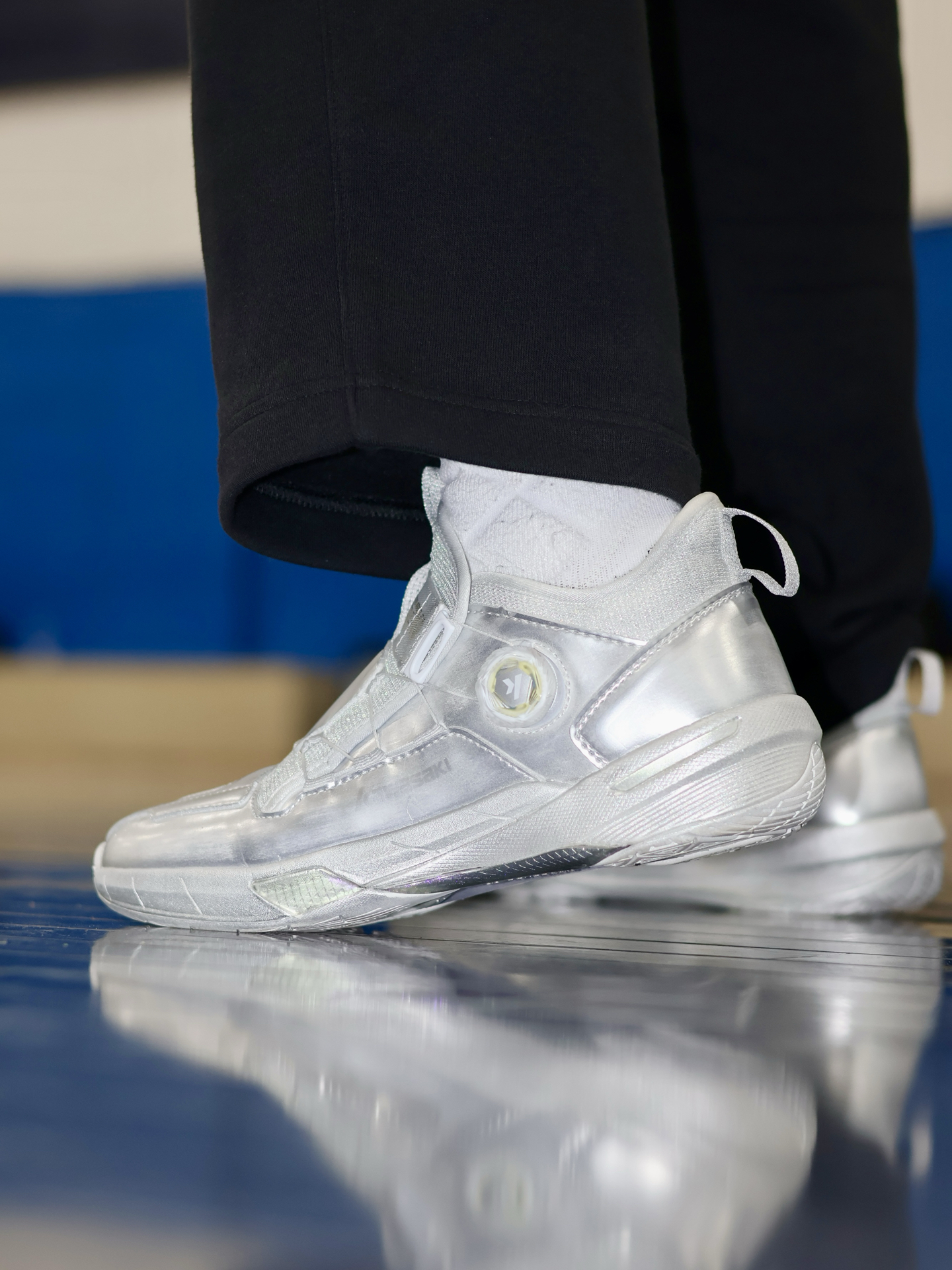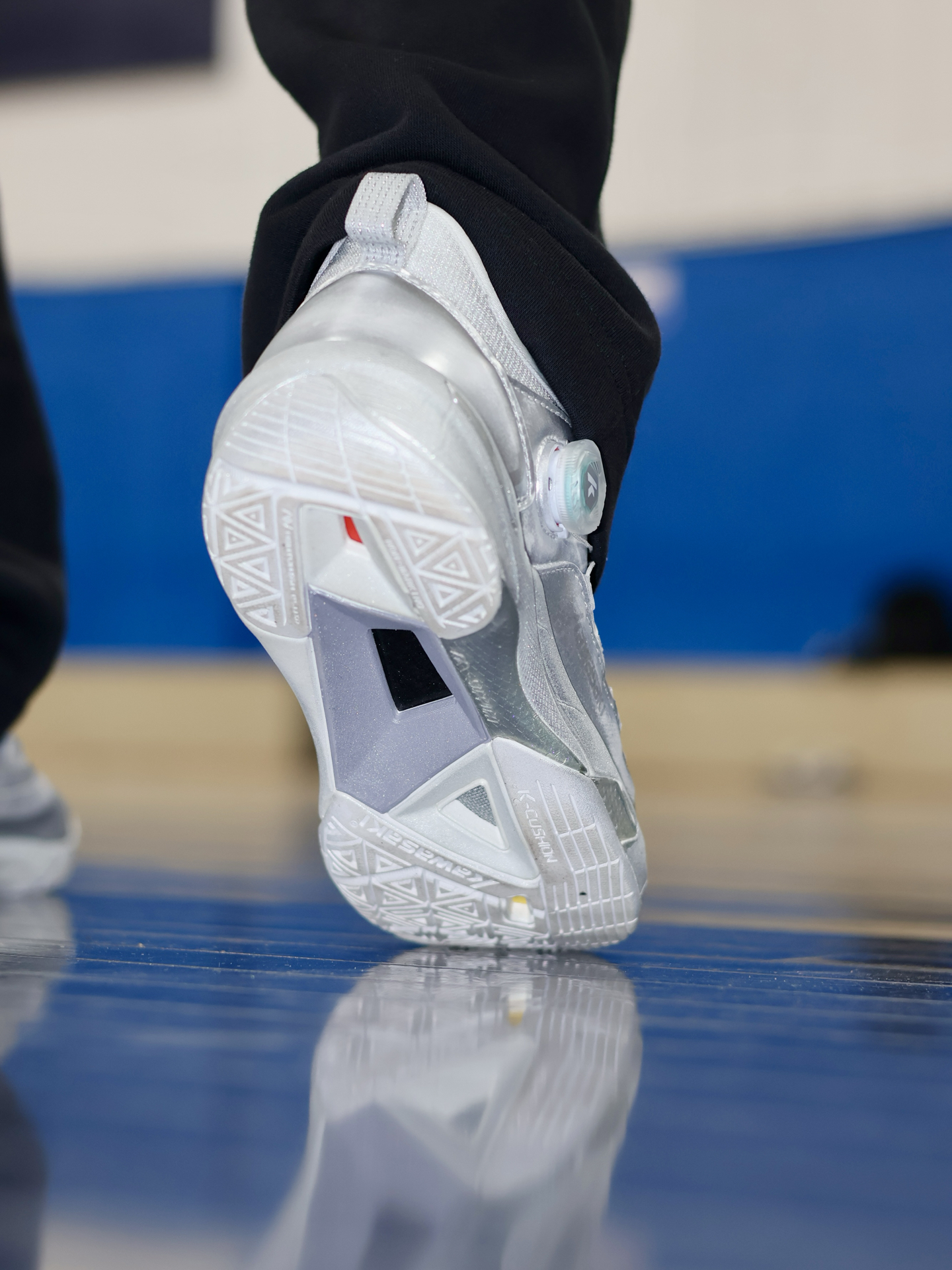 之前就有兄弟问我 羽毛球鞋是不是都是设计老土❓ 其实 很多羽毛球鞋的配置、颜值、脚感 都很前卫 比如穿越2.0 太空银🚀 通体银色的设计 视觉上的观感和立体感没得说 中帮的造型 自动纽扣鞋带 穿脱方便 一体性也强 中底偏硬 但是磨合开比较舒服 内嵌的碳板 也能起到不错的支撑和稳定作用 同时 脚感平顺 重心也比较稳 对于中上体重使用者也比较友好 但要我说 最喜欢的地方 那肯定还是银色系的外观设计...