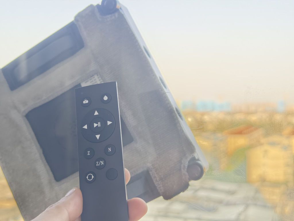 机器的操作还是比较简单的,不用连APP!贴玻璃上按遥控器“启动”就行,AI自动走Z+N字路线,边角都能擦到,碰到窗把手也能自己绕开。即便真的碰到盲区,可以通过遥控器控制绕开。