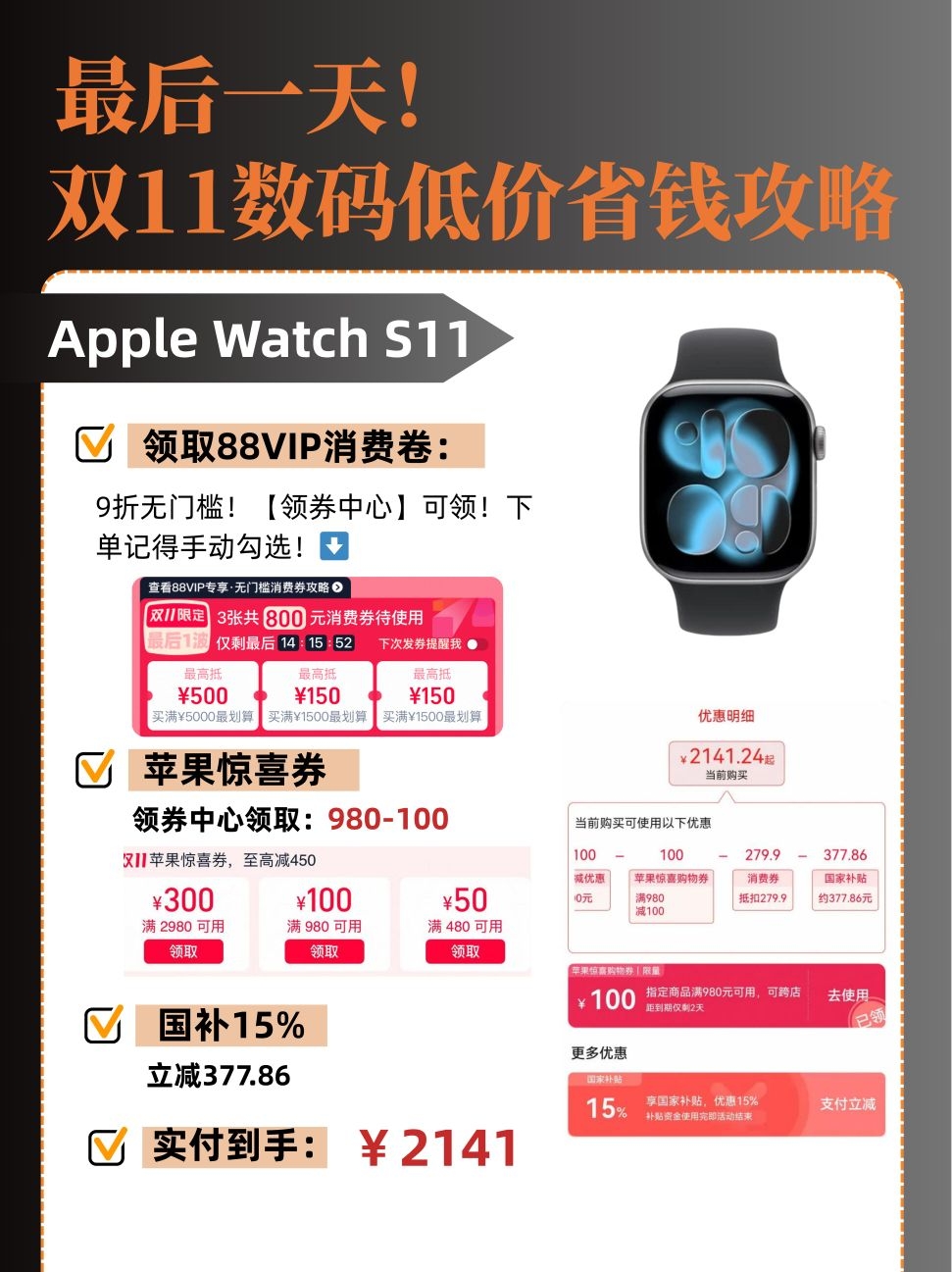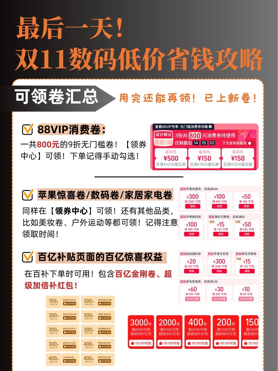 双11最后一天!数码低价捡漏速冲!||👭们!双11最后一天了!我整理了一些超值的数码产品,查缺补漏!而且现在消费卷和各种数码卷等也更新了,之前用完的姐妹还能继续领继续用!漏领的也抓紧领,错过再等一年🥹 首先给大家梳理一下各种卷: 🔸88VIP消费卷,🔍88VIP,进入会员中心就能领!一共800元的9折无门槛!下单记得手动勾选!! 🔸在领券中心,有苹果惊喜卷,家电家居卷,数码福利卷等等,按照自己...