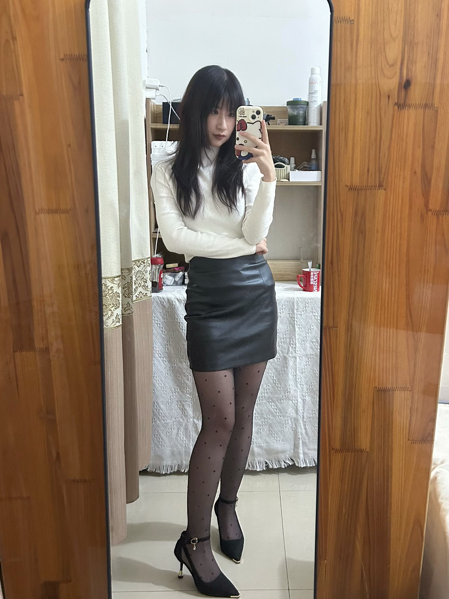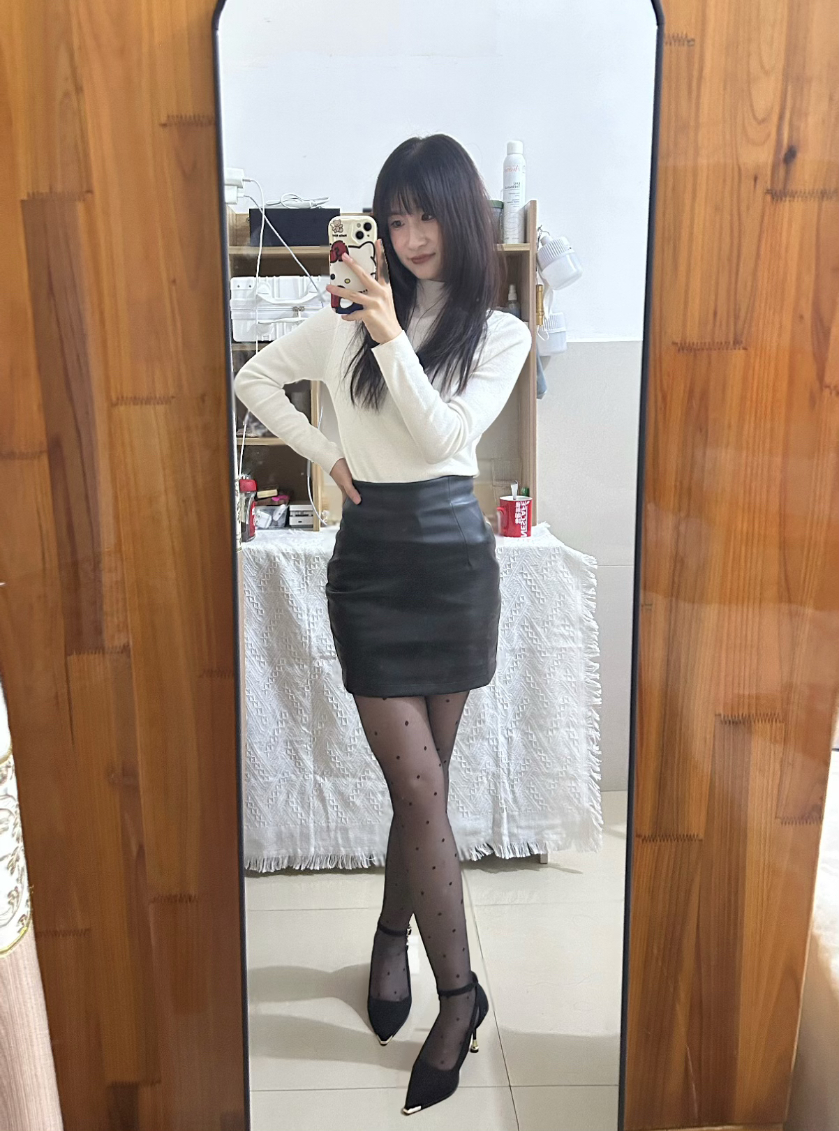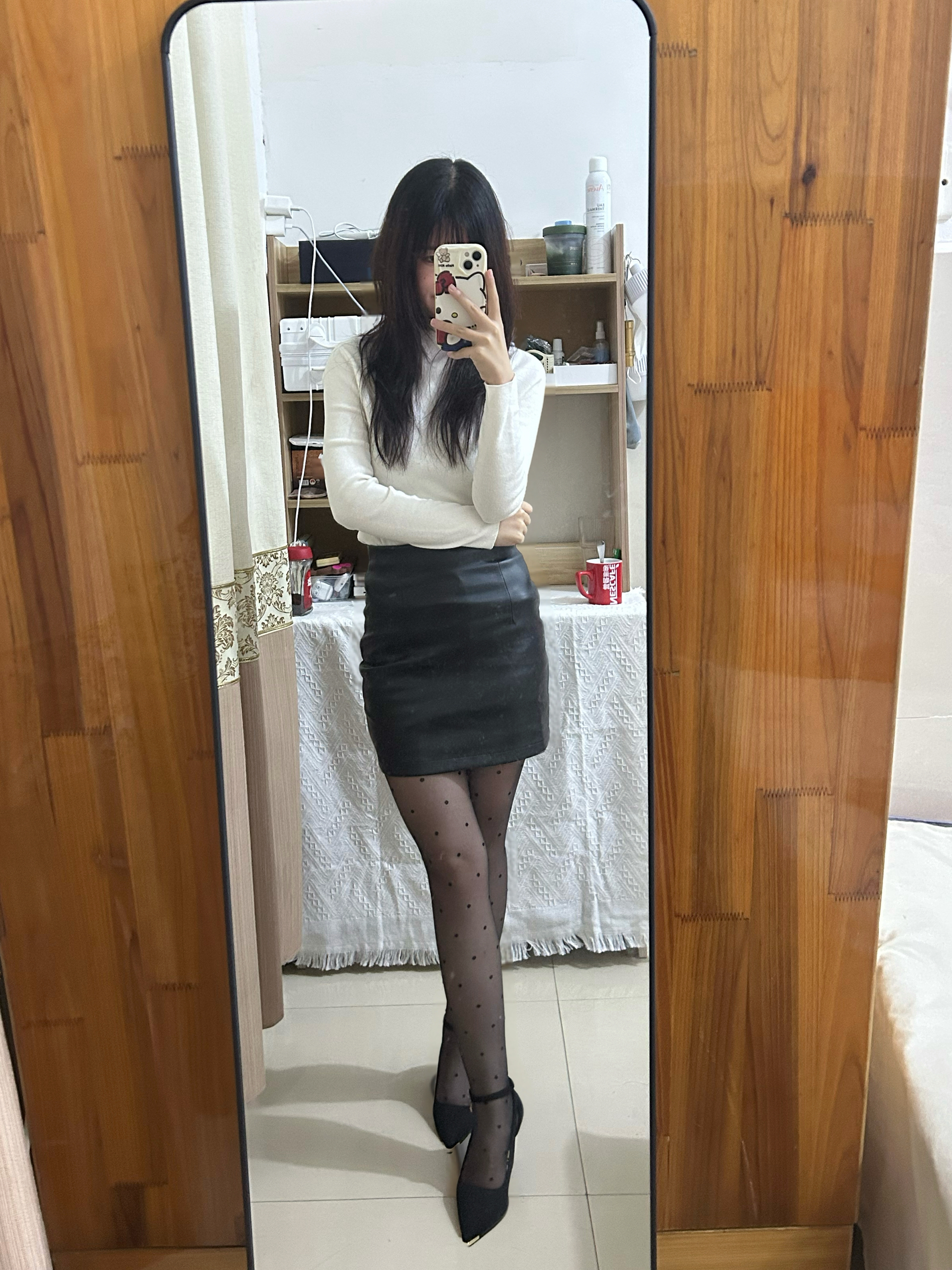 白色毛衣➕黑短裙还蛮显瘦的 穿了一双黑色高跟鞋👠 偶尔御姐风穿搭一下 给自己都是眼前一亮的感觉。