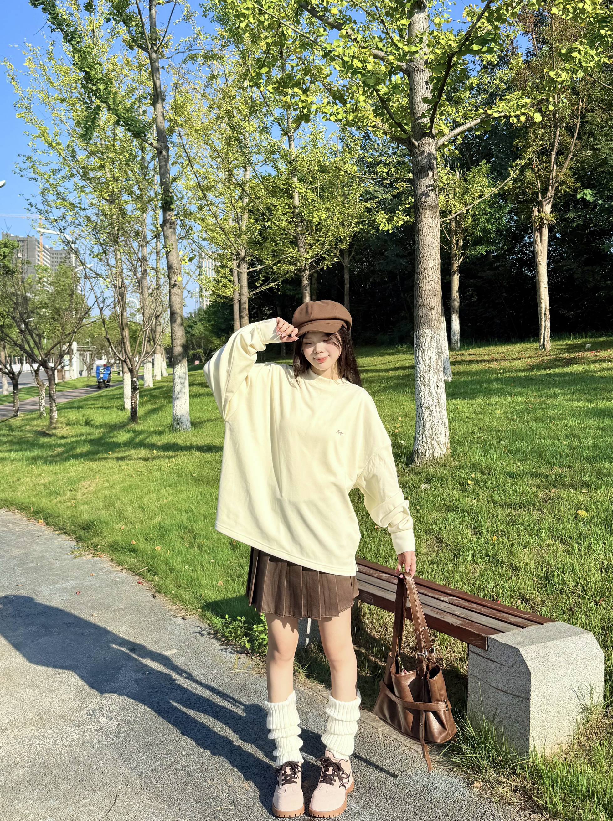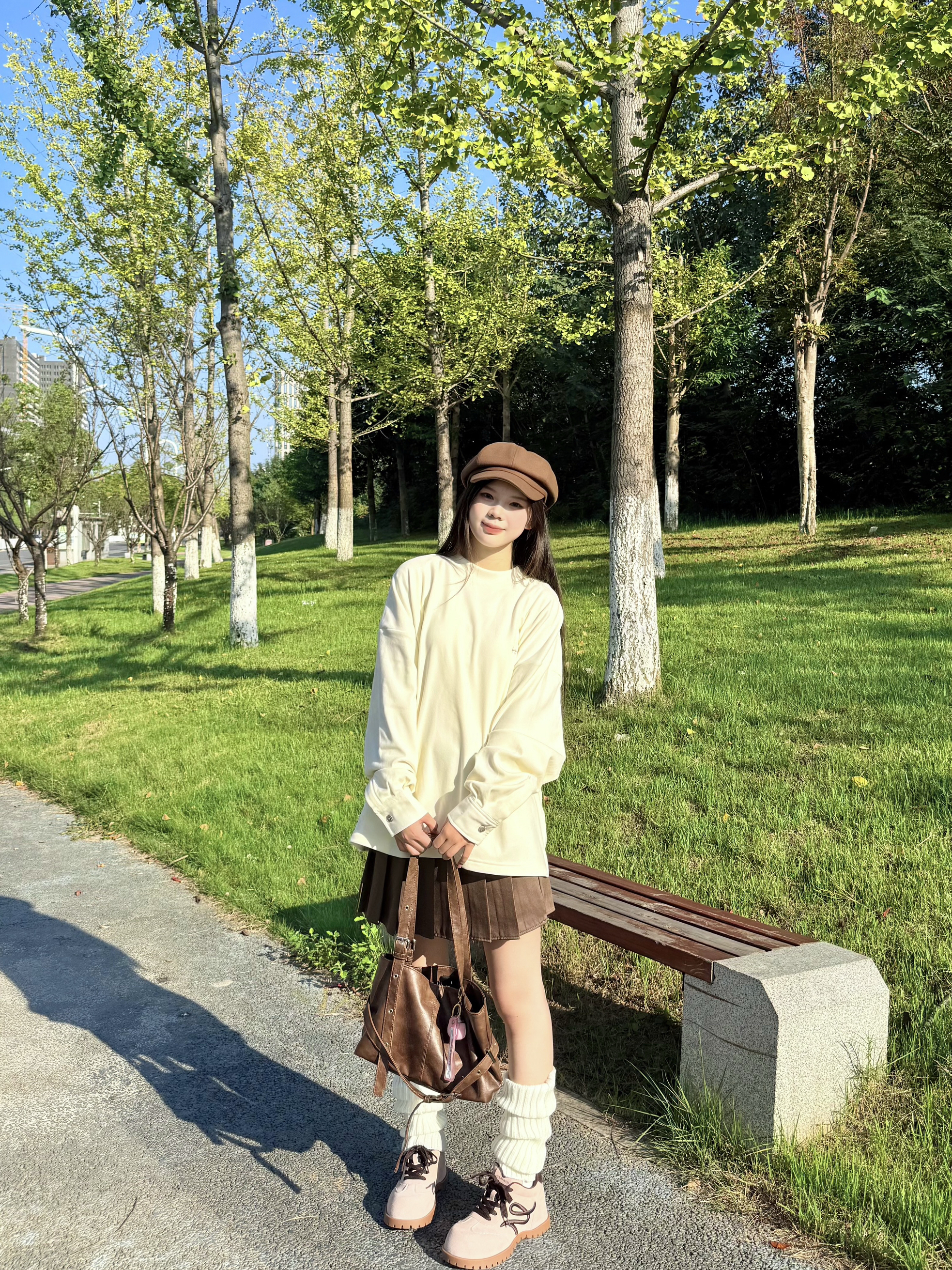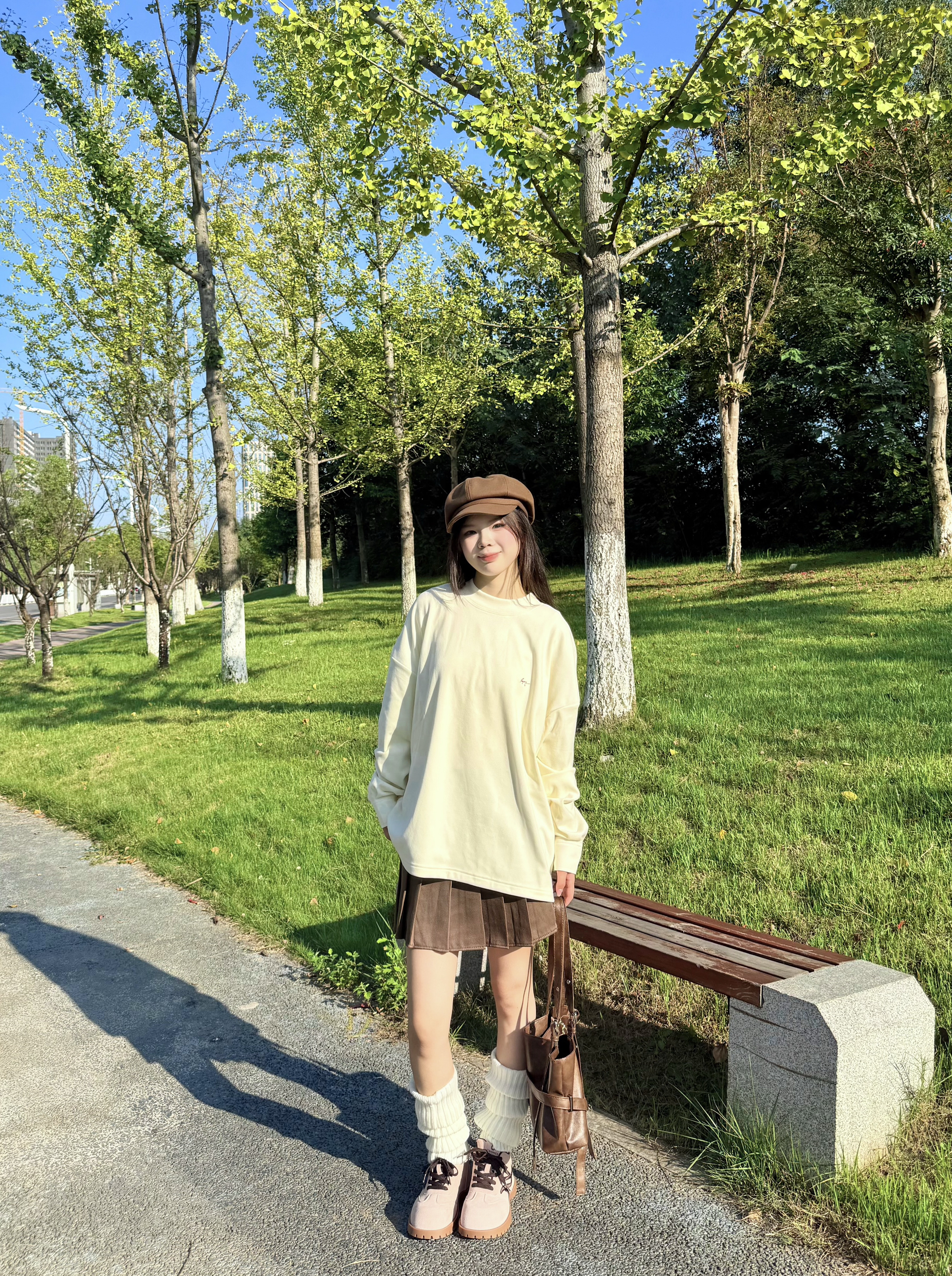 身高|体重:168|51 🧍♂️ 穿搭风格:复古慵懒风 👔 上衣:BJHG 👟 鞋子:千百度 最近挖到的这套穿搭绝绝子👍 奶黄色oversize卫衣宽松又藏肉,搭配棕色百褶裙,甜酷感拉满~ 再配上同色系报童帽和复古包包,细节感直接拉满✨ 还有这双粉色小靴子,软乎乎的巨好穿,搭配堆堆袜,走一天都不觉得累~ 这套秋日look你们爱了吗?快说说你们最近的心头好穿搭👇