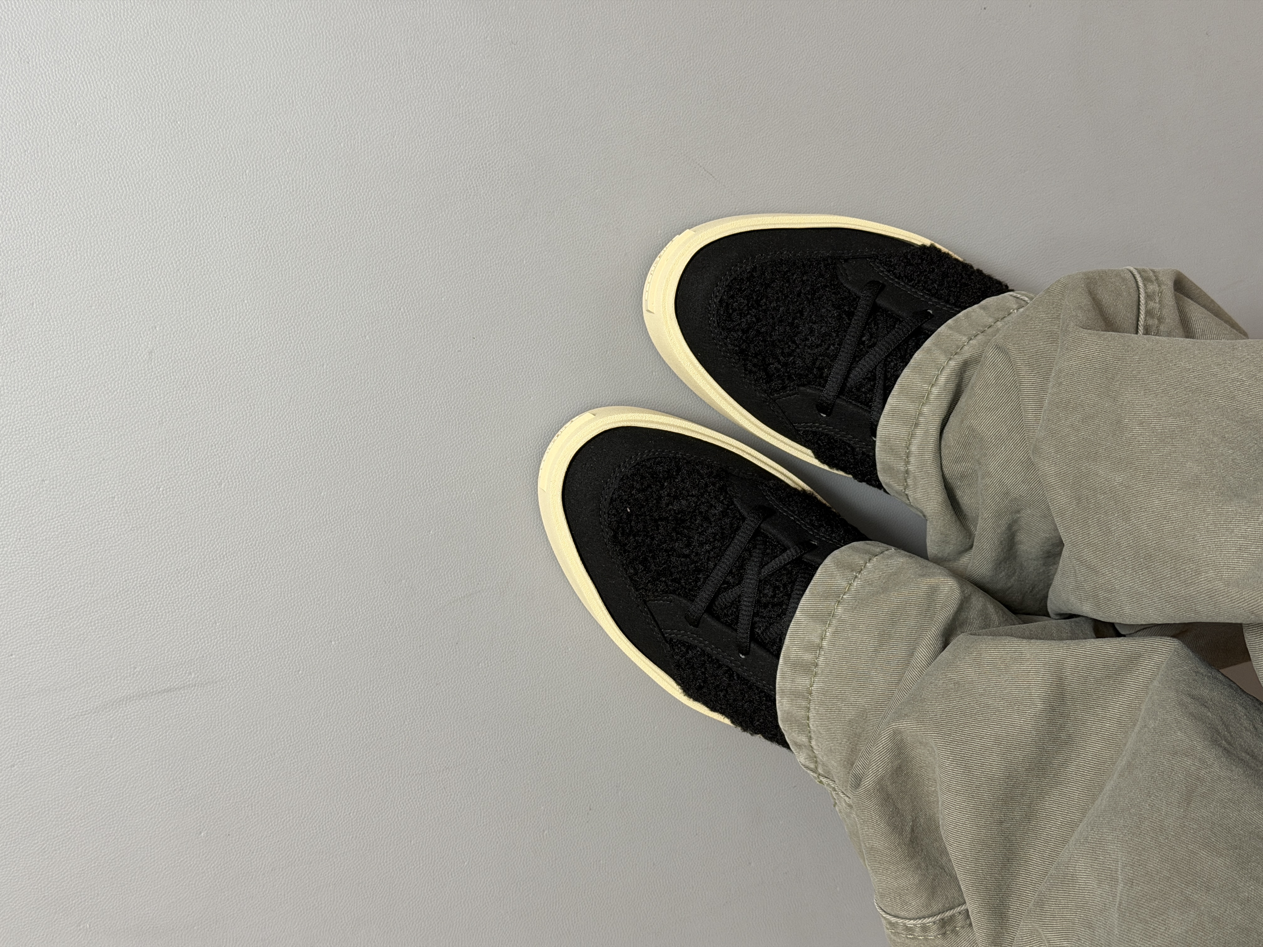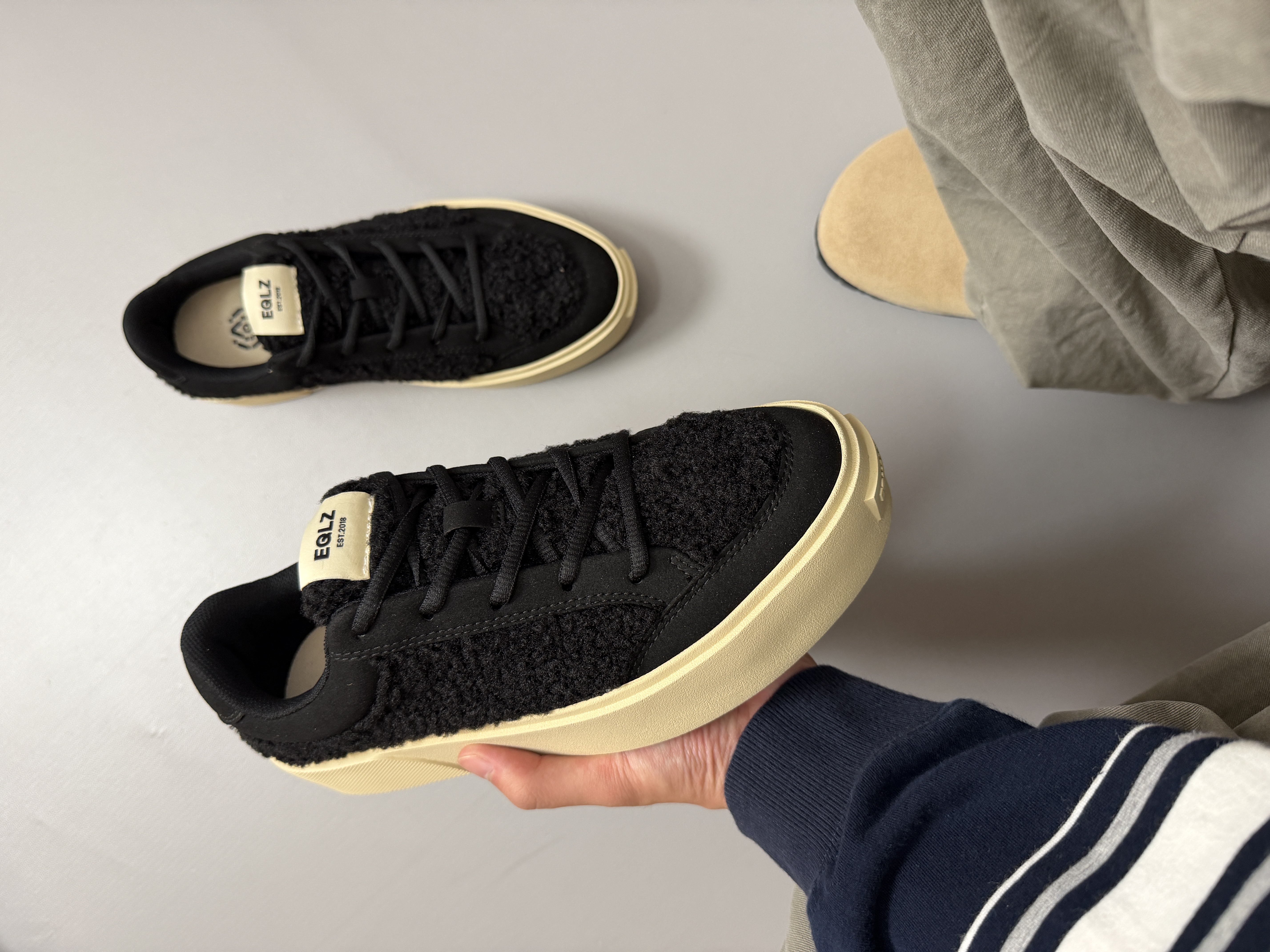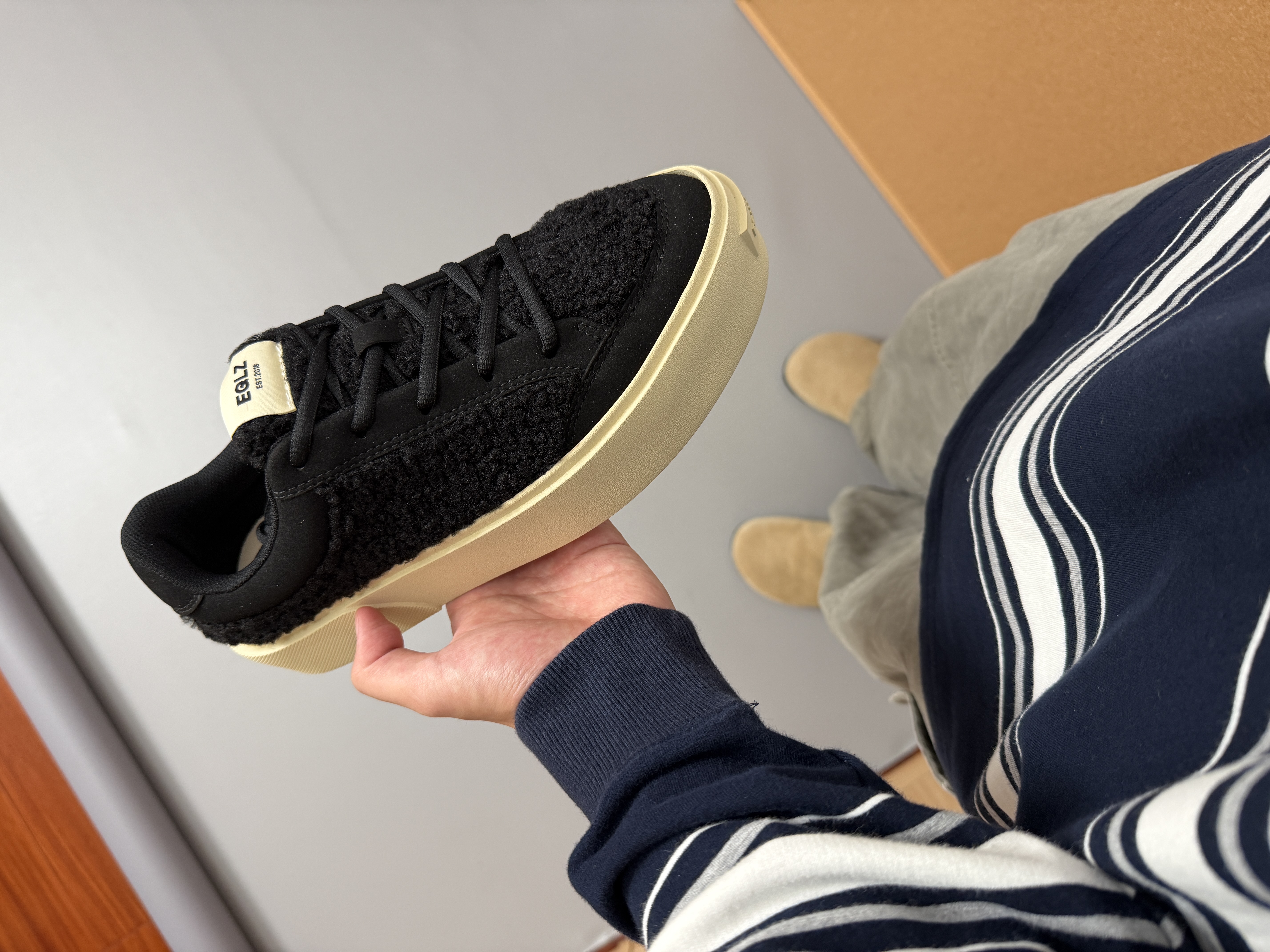 最近❤️爱上了双蛮特别的板鞋! 仿羊羔绒☁️居然出现在一双板鞋上, ✅这也太新颖太吸引人了吧~ ✅全黑的鞋面加上复古白色打底, 整双鞋看着无违和感,穿搭性也是杠杠!! ⚠️尺码参考:170/120 穿着 41 码正的‼️