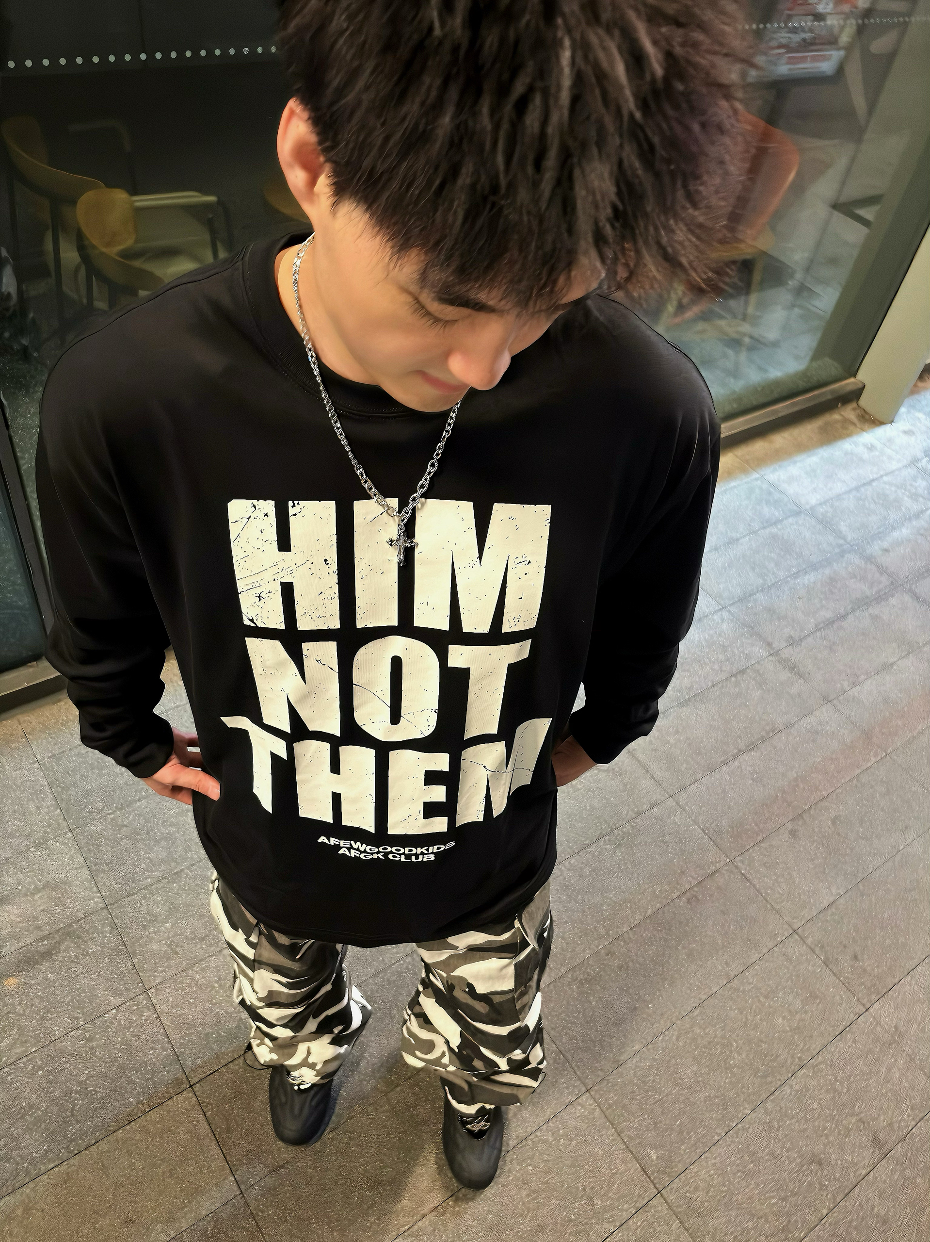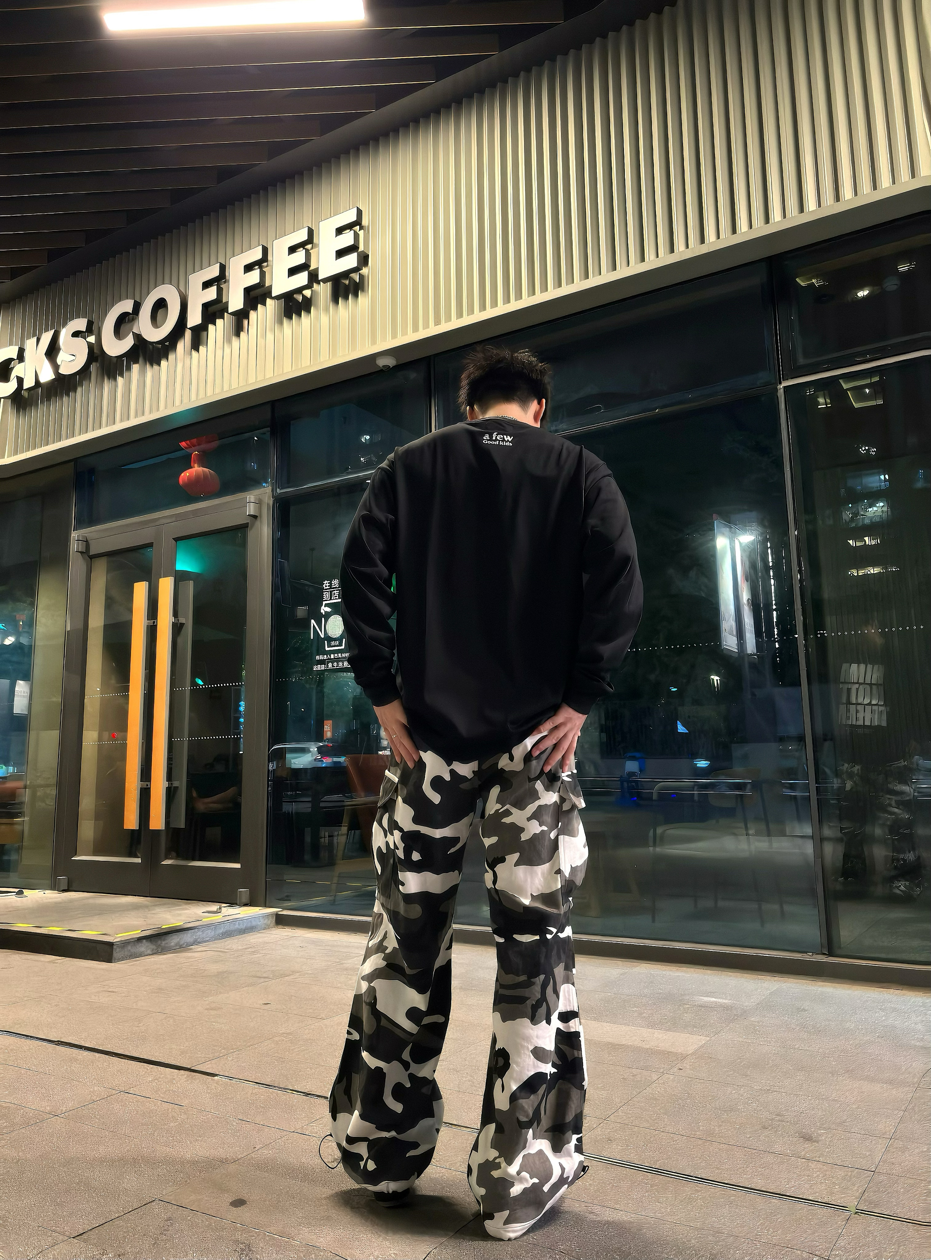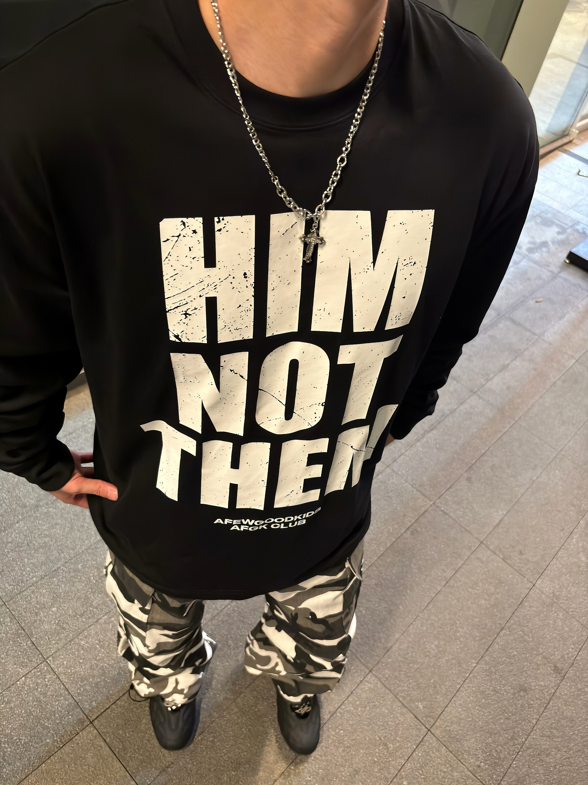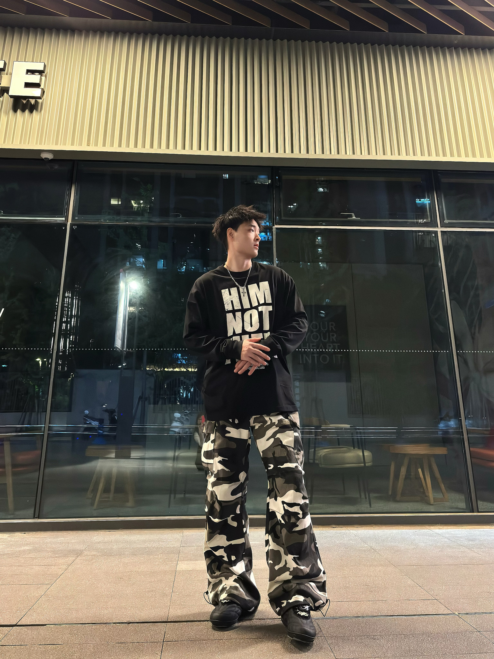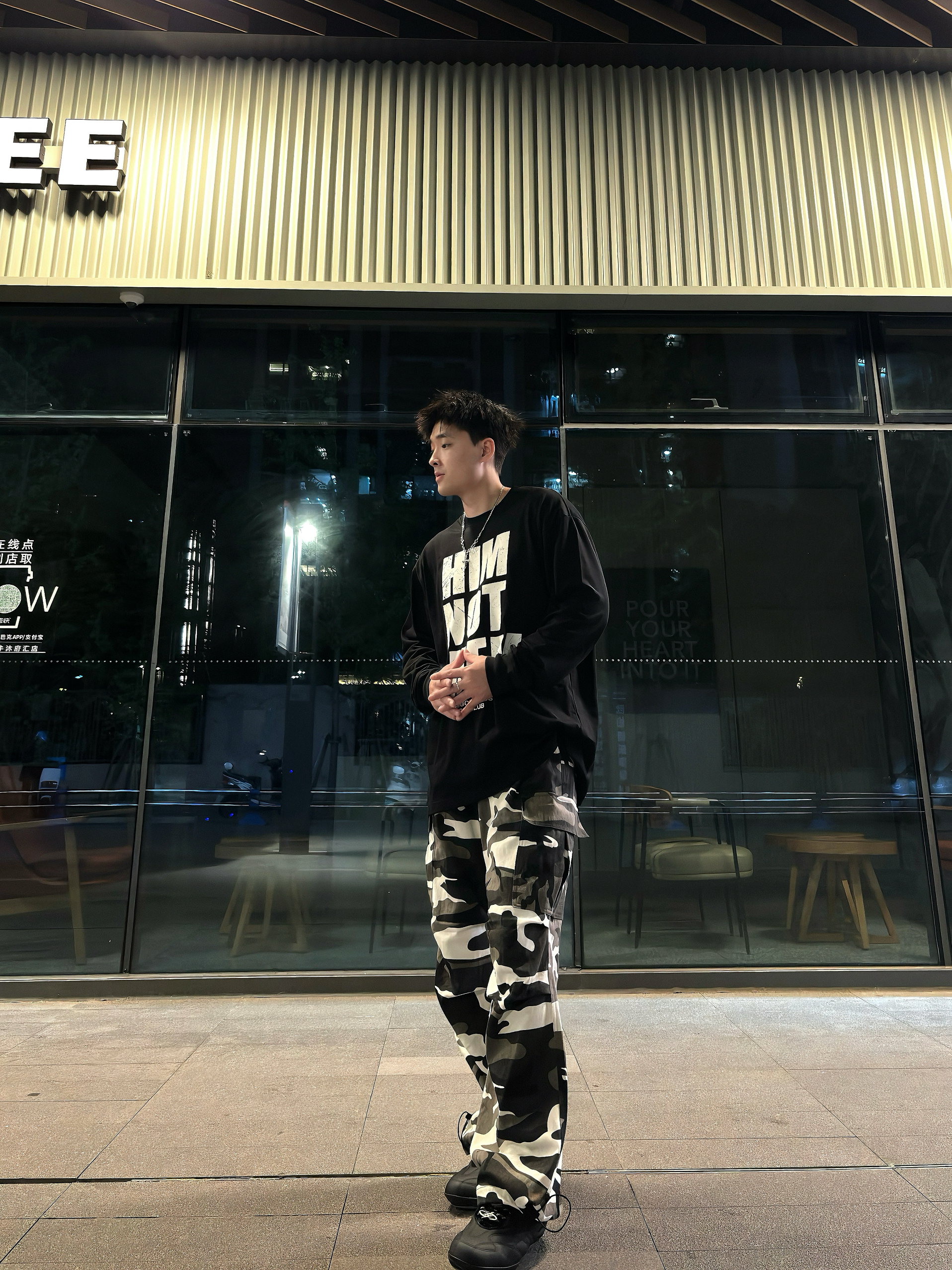 谁懂啊家人们!这套暗黑迷彩穿搭直接把街头氛围感拉满💥 ● 上衣选了AFGK的字母长袖,做旧印花+oversize版型,美式街头那味儿一下就有了,搭配银色项链,潮酷感直接叠满~ ● 下装是黑白迷彩工装裤,阔腿+束脚双设计,既能日常炸街又能适配各种风格,走路带风的既视感谁穿谁知道! ● 再踩一双黑色老爹鞋,整个造型从街头酷盖到潮流达人无缝切换,出街回头率直接拉满💯 日常出街不知道穿啥的兄弟,这种...