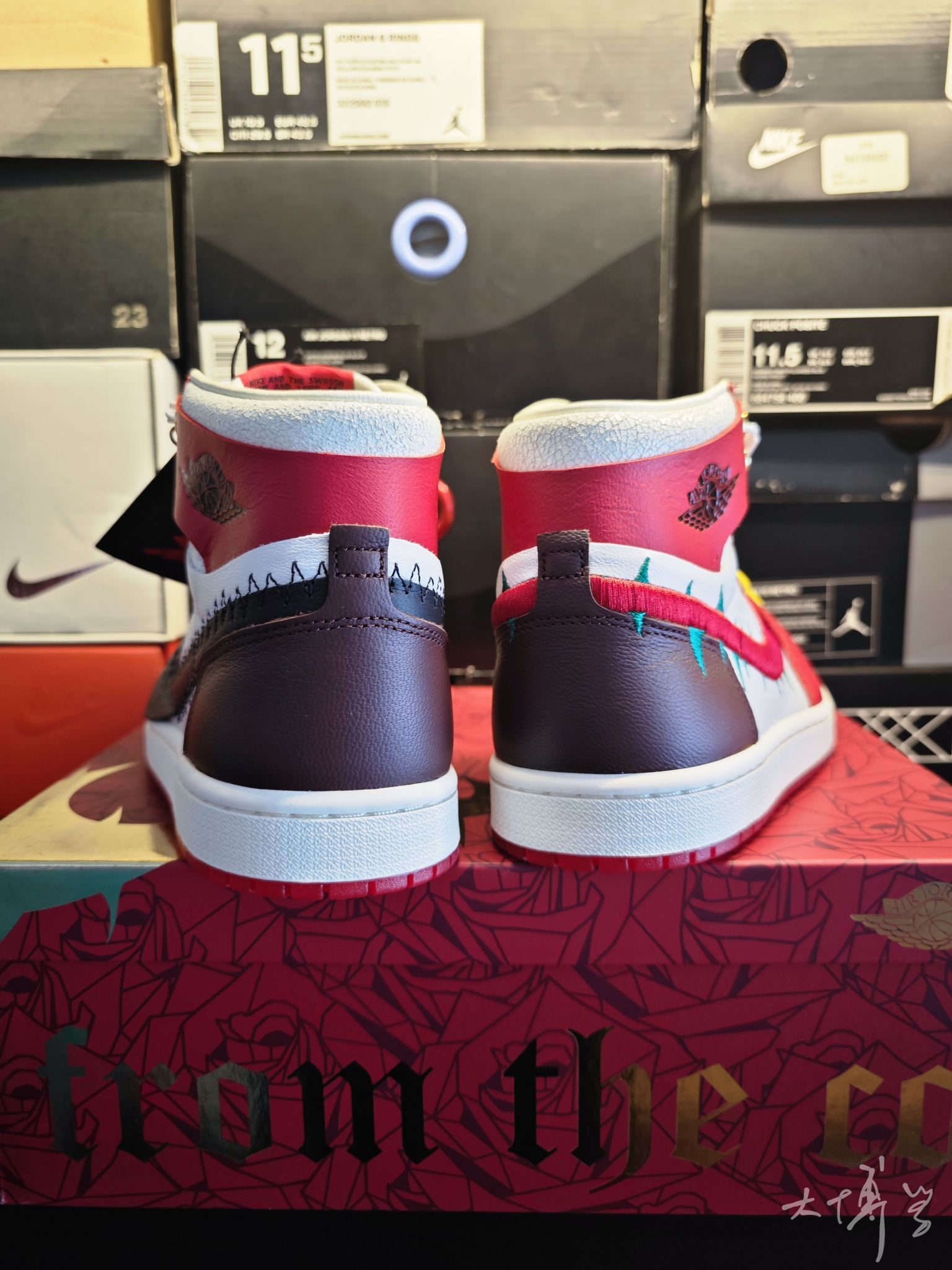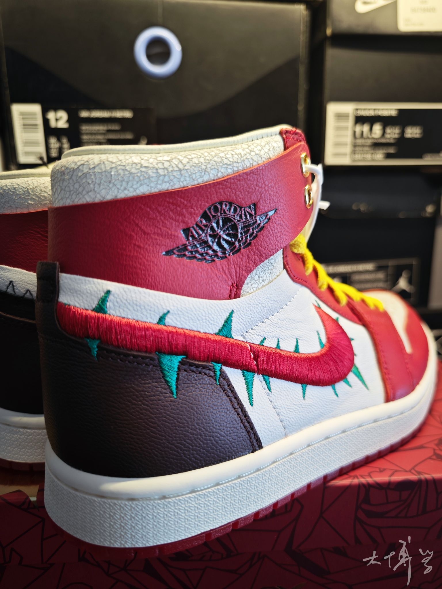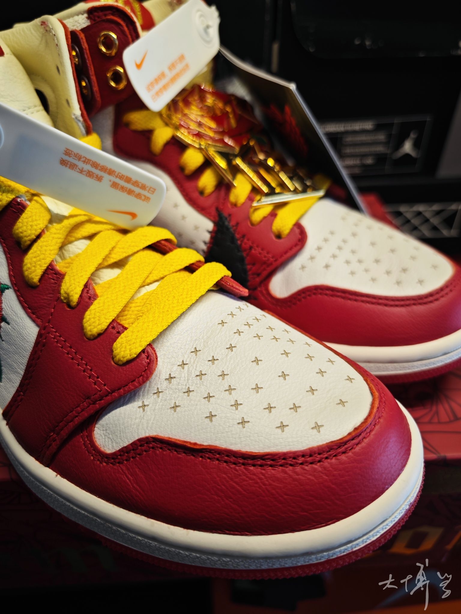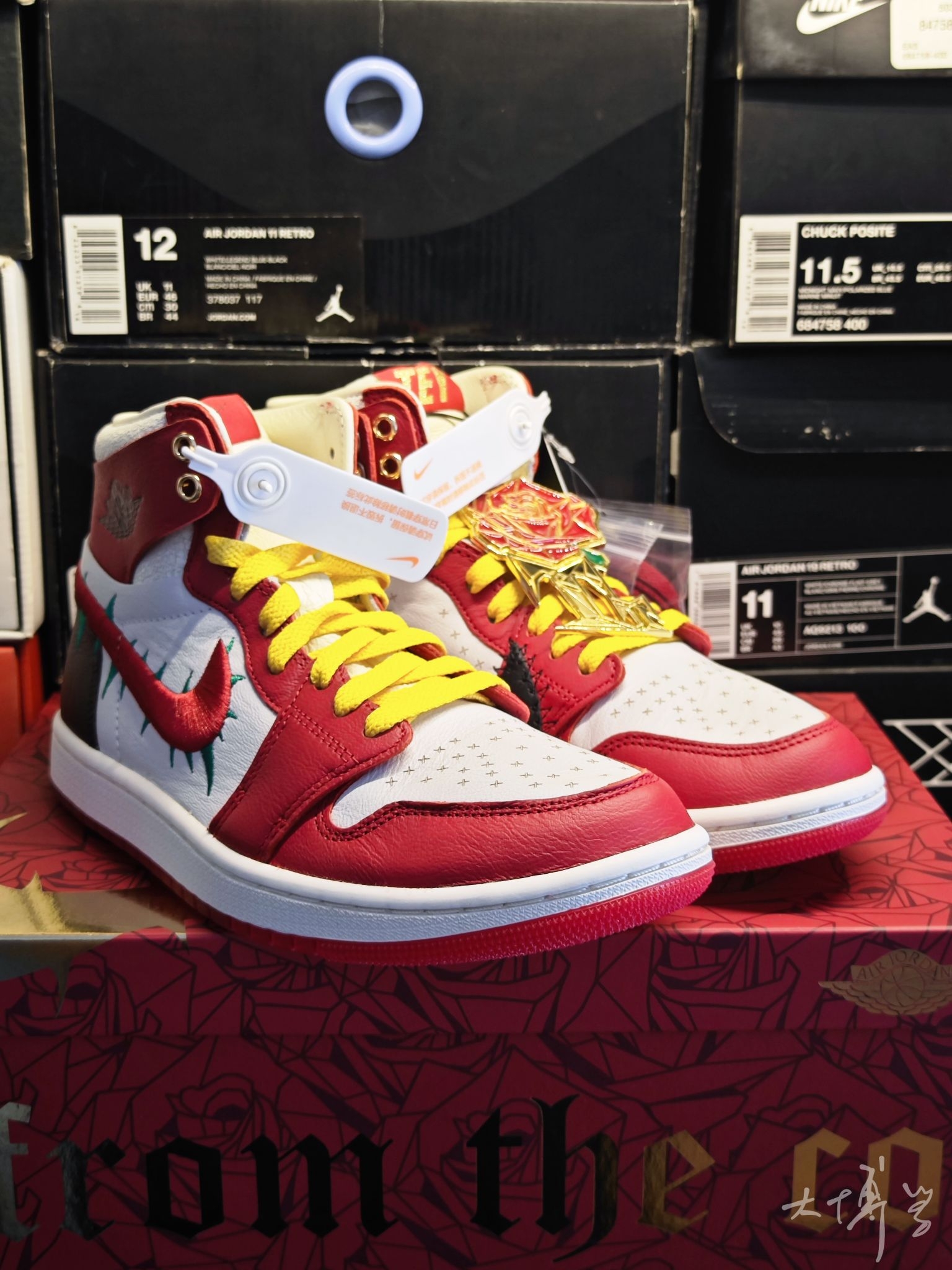 一双联名的AJ1 我对这款的评价很高 总结一下就是细节到位 鸳鸯造型:左脚是黑色解构风Swoosh(边缘用粗犷缝线装饰,藏有“the last rose”彩蛋) 右脚是红色荆棘刺绣Swoosh(搭配绿色尖刺细节) 采用细腻皮革+荔枝皮+光面皮拼接 鞋帮处做了龟裂皮质处理 鞋头透气孔换成了十字雕花(模拟荆棘纹理) 鞋盒还印满玫瑰图案,附赠金属玫瑰别针+多副鞋带 鞋舌分印“TEY”缩写和荆棘Logo...
