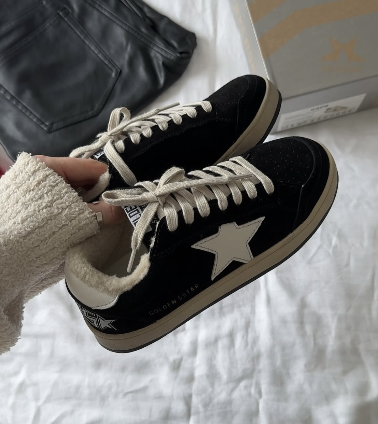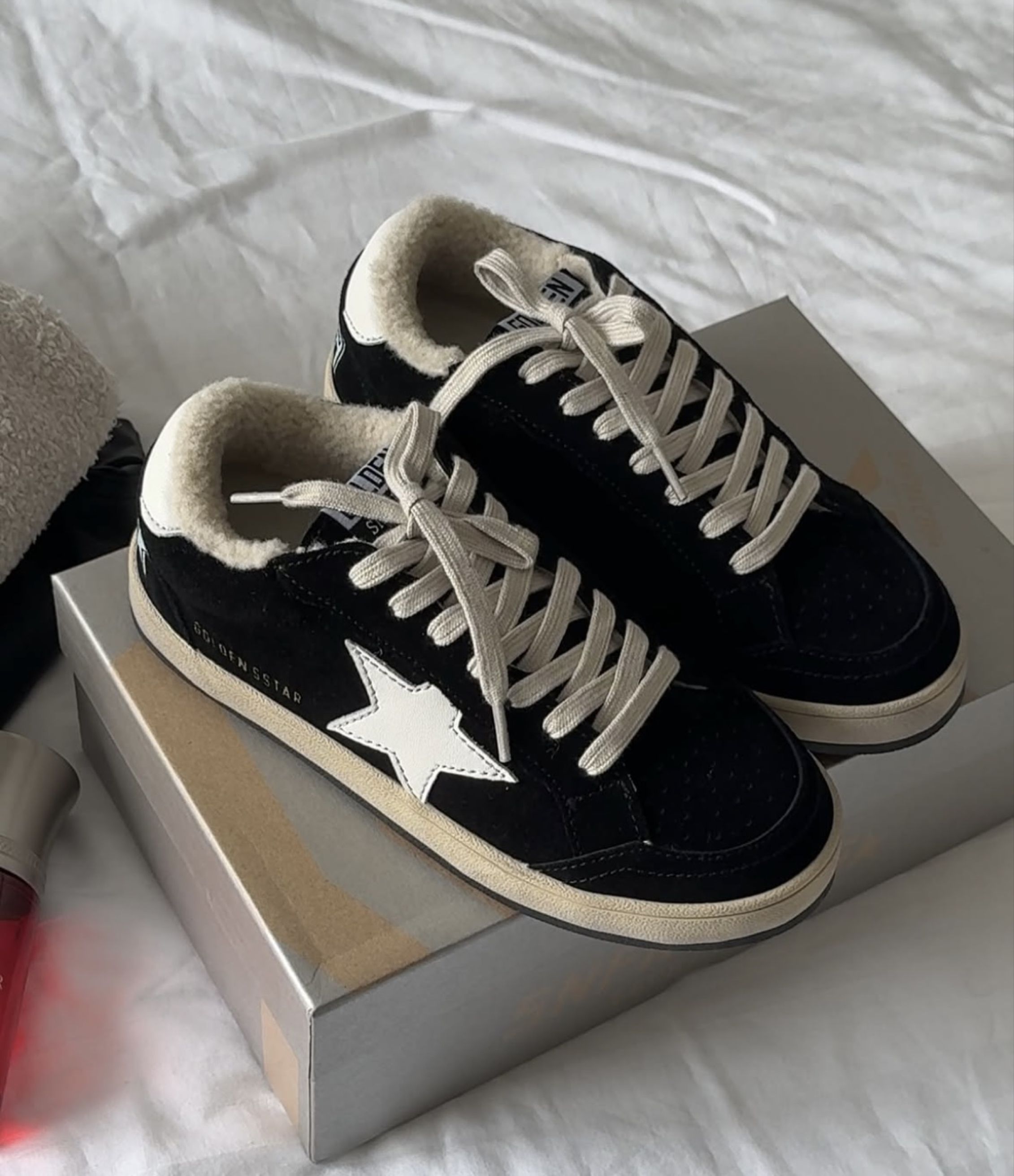 是谁的秋冬鞋架还缺一双“氛围感选手”? 黑绒面+奶白五角星+做旧鞋边,复古感直接拉满✨ 鞋里裹满软乎乎的绒毛,脚冷星人终于能体面过冬了! 配牛仔裤是随性松弛感,搭小裙子又甜又酷, 这双“Golden Star”,目测要承包我整个冬天的穿搭~