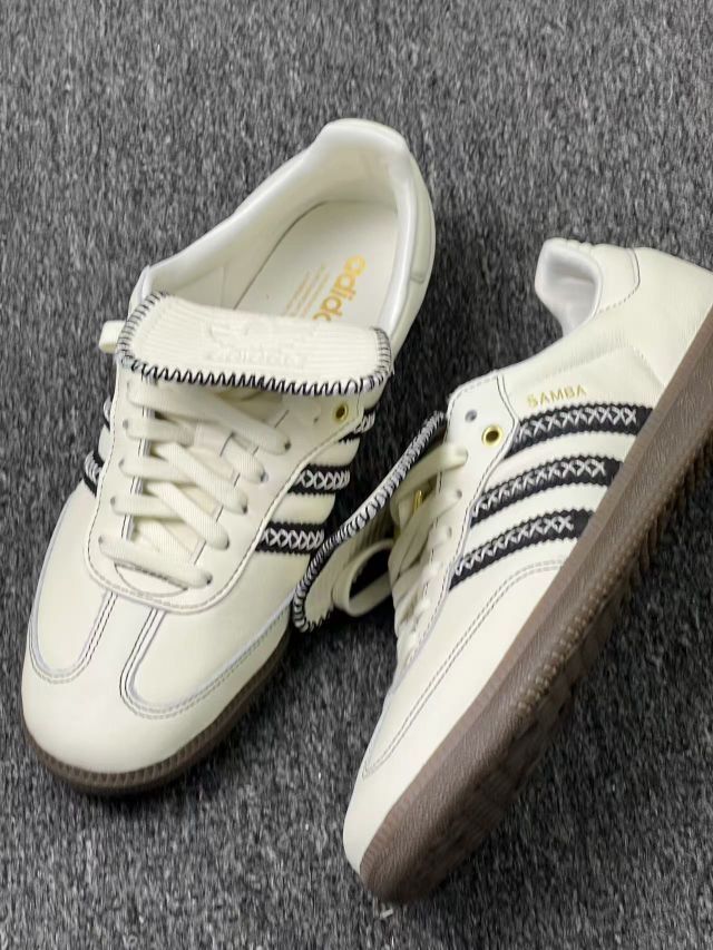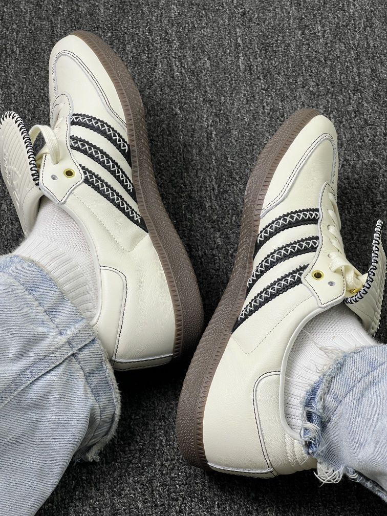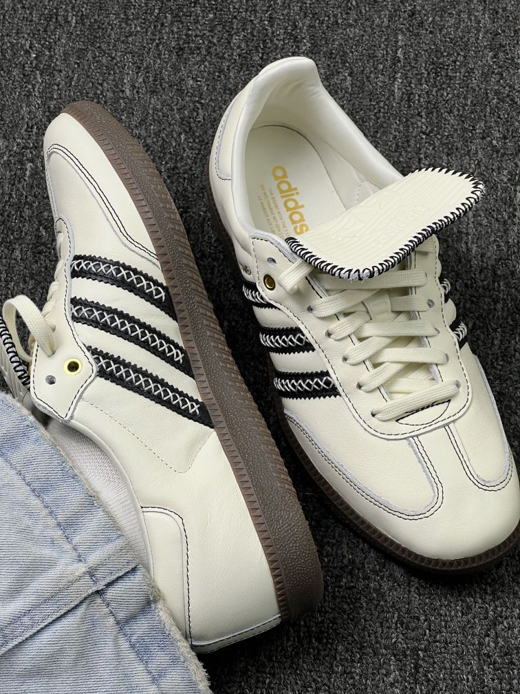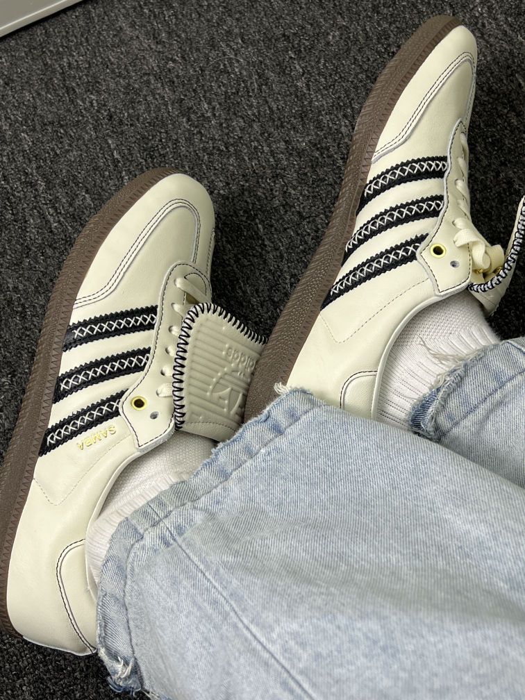 这双Adidas Samba上脚快一周,先讲实际感受: 鞋型是真的贴脚,配浅蓝牛子裤视觉上很顺👖,但刚穿头两天后跟磨脚踝——得配厚点的袜子缓冲下,光脚穿是真不行。 皮质摸着手感软,但米白色太娇气,昨天踩了点灰印子,拿湿纸巾擦完有点泛白,得专门买鞋乳打理,懒人慎选😅。 生胶底看着复古,实际走光滑地砖有点“黏”,步子快了容易卡一下;不过踩地毯或者水泥地还行,脚感偏硬但不硌,长时间走路会有点累,...