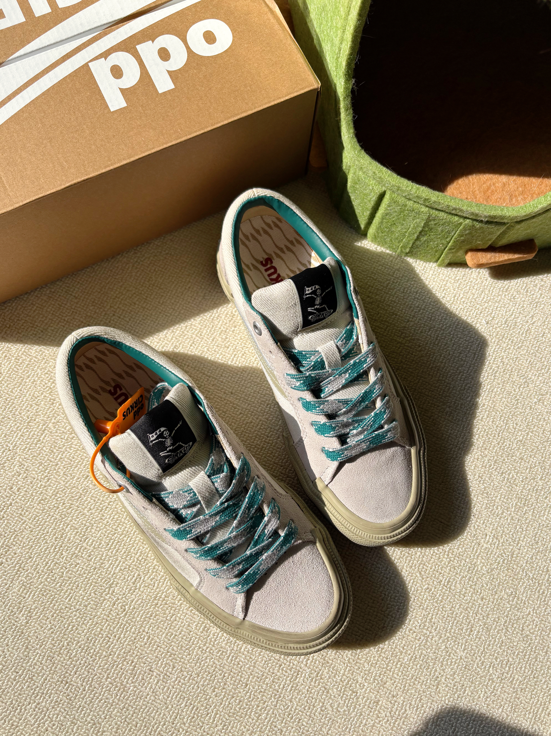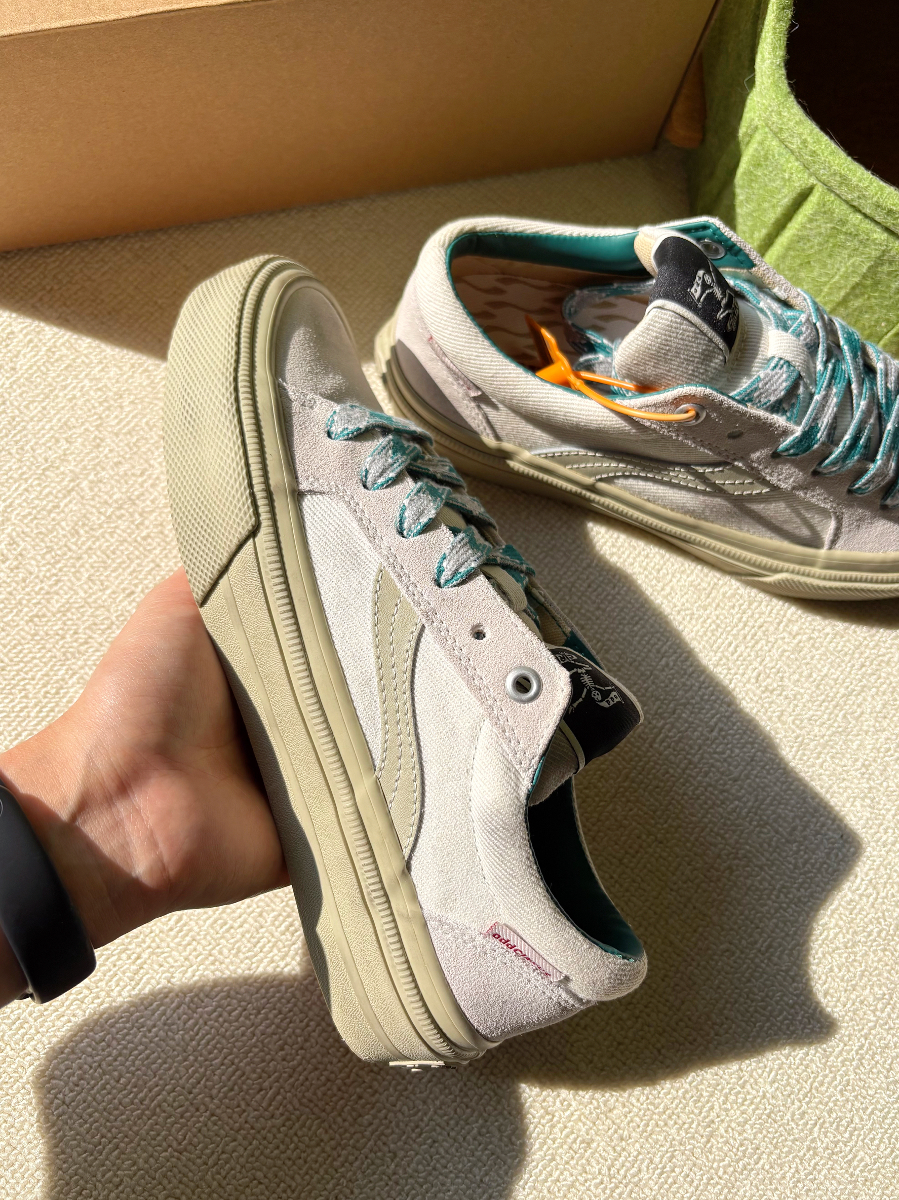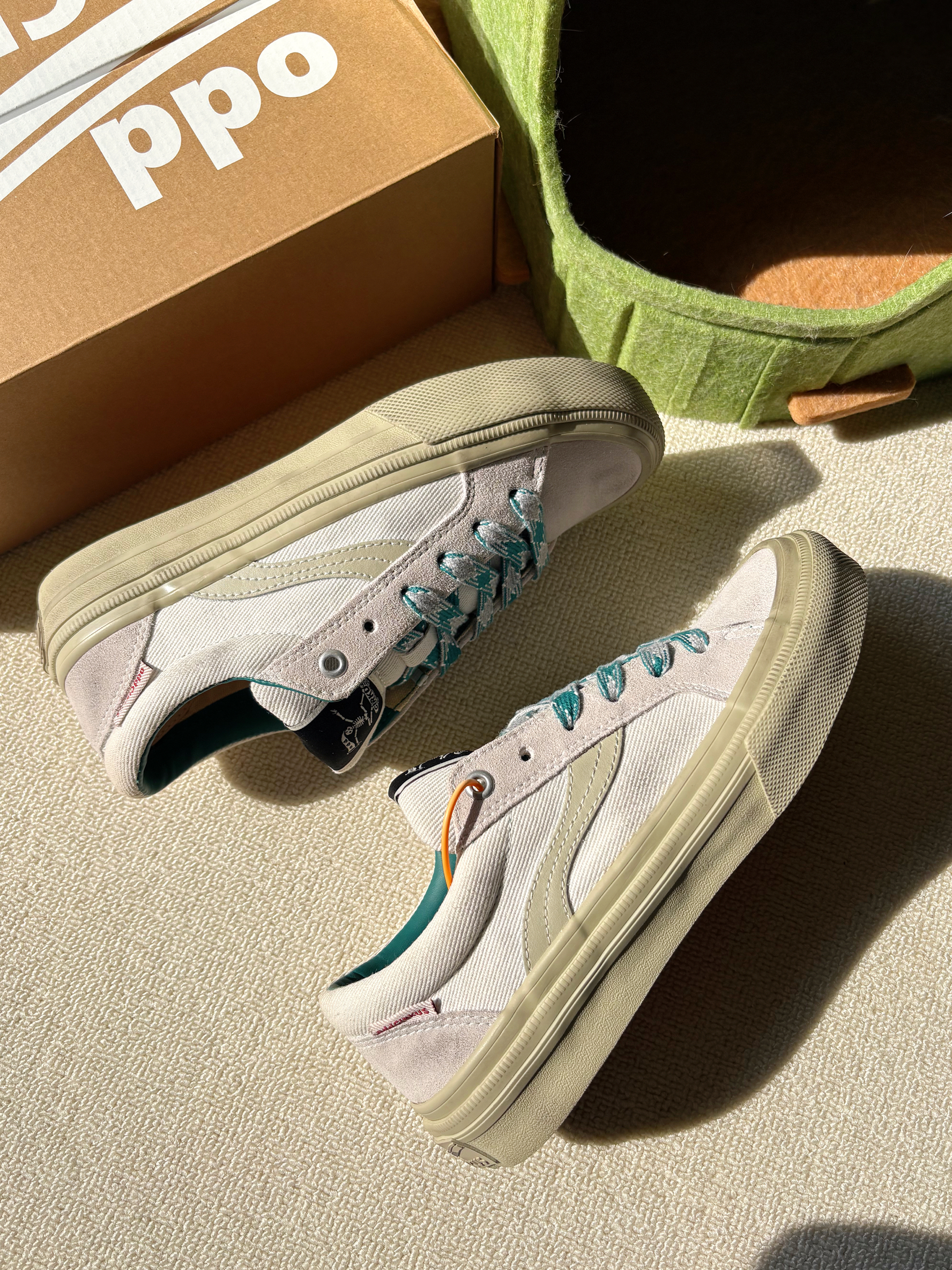 脏脏滑板鞋好特别✨ 鞋头、后跟和大底都有擦脏的设计! 这双水泥白配色真的是一见钟情💘 搭配灰绿色的格纹鞋带真的绝了~