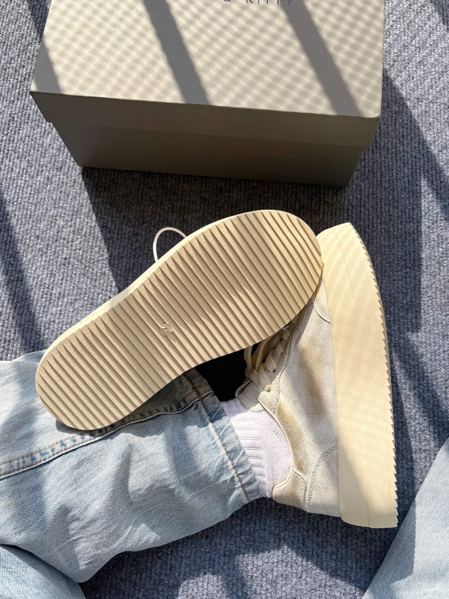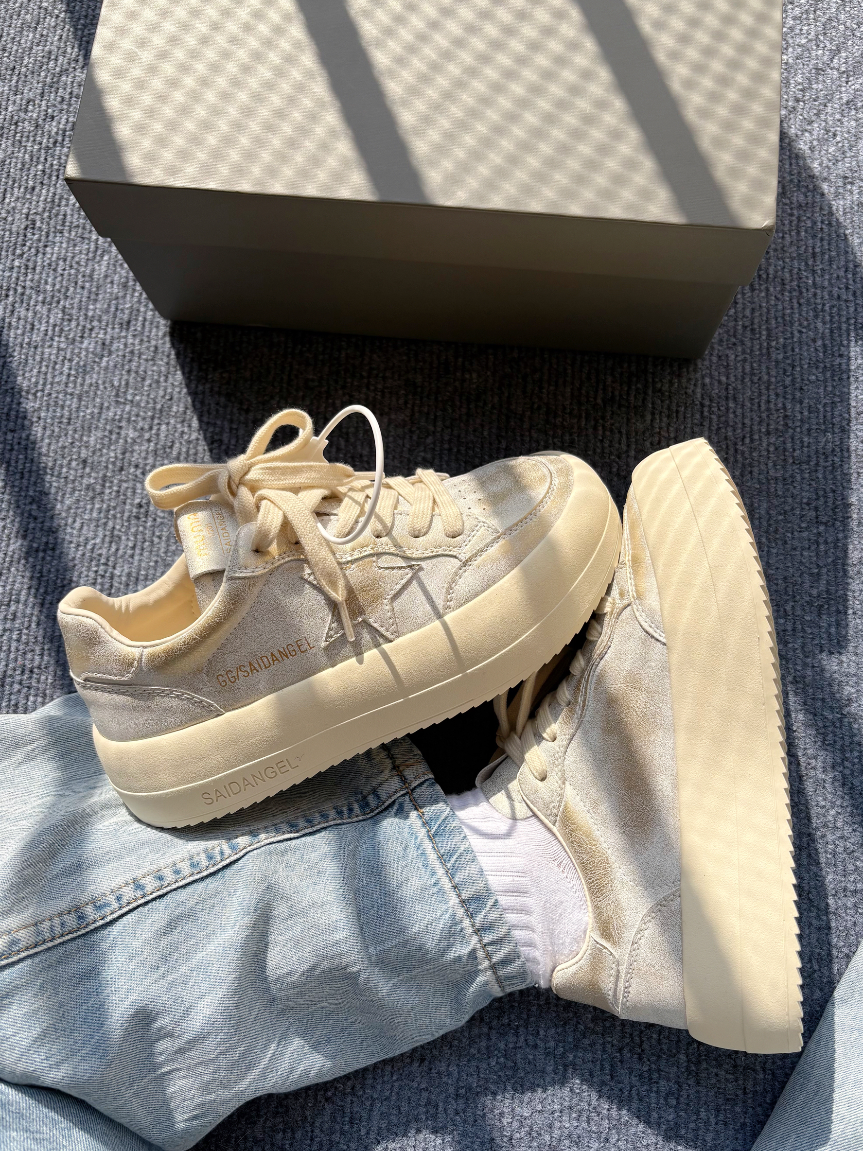 米白色配色很温柔,做旧工艺也超有质感。 韩系氛围就靠这双星星鞋!