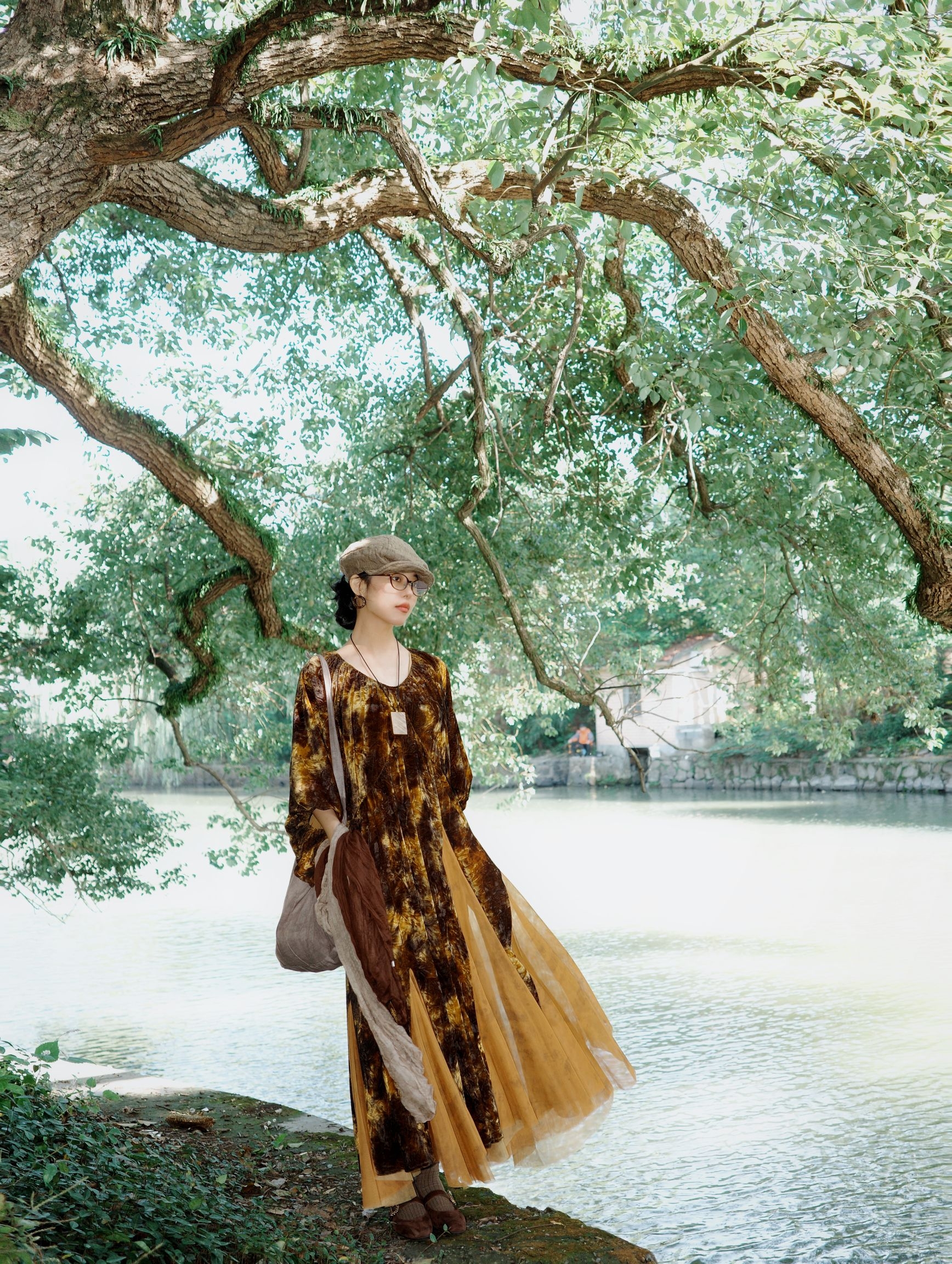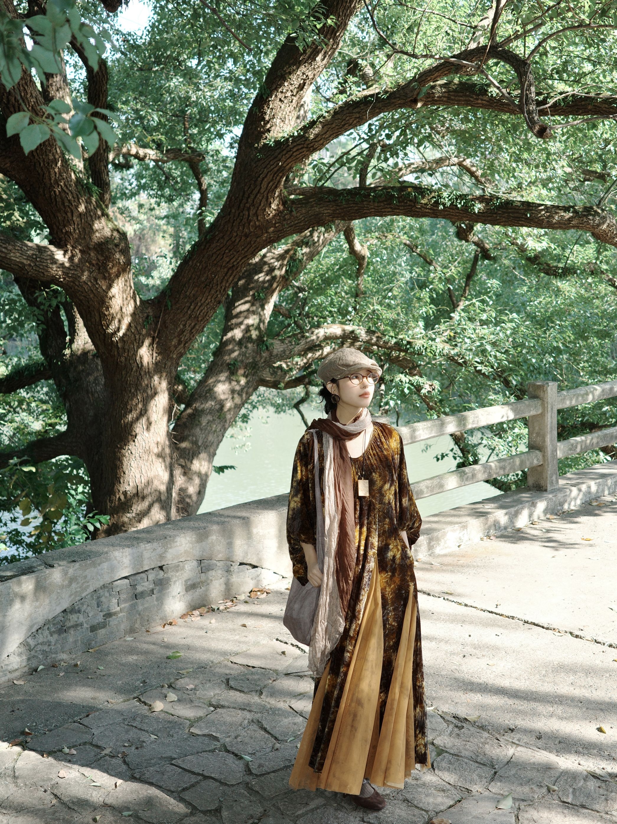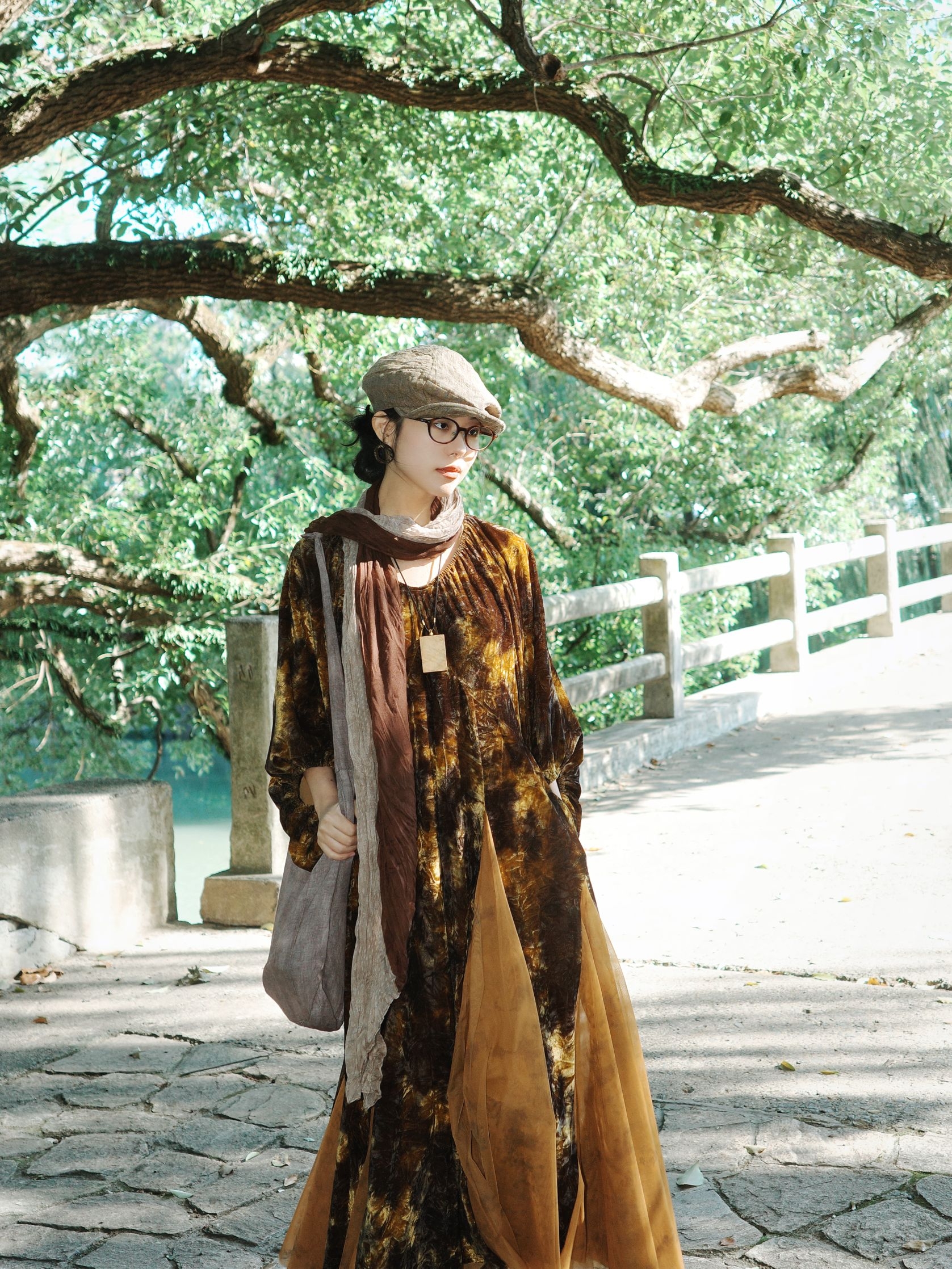 秋日出游穿这一身,新中式文艺感精准戳中我! 扎染棕黄调的连衣裙太有艺术感了~新中式宽松版型穿起来舒服到不想脱,薄纱裙摆风一吹飘起来,氛围感直接拉满! 配上复古报童帽,复古那味儿一下拿捏到位~再搭个软乎乎的大容量包包和简约吊坠,往水边老树下一站,整个人都裹着秋天的温柔,文艺又松弛的感觉太妙了!