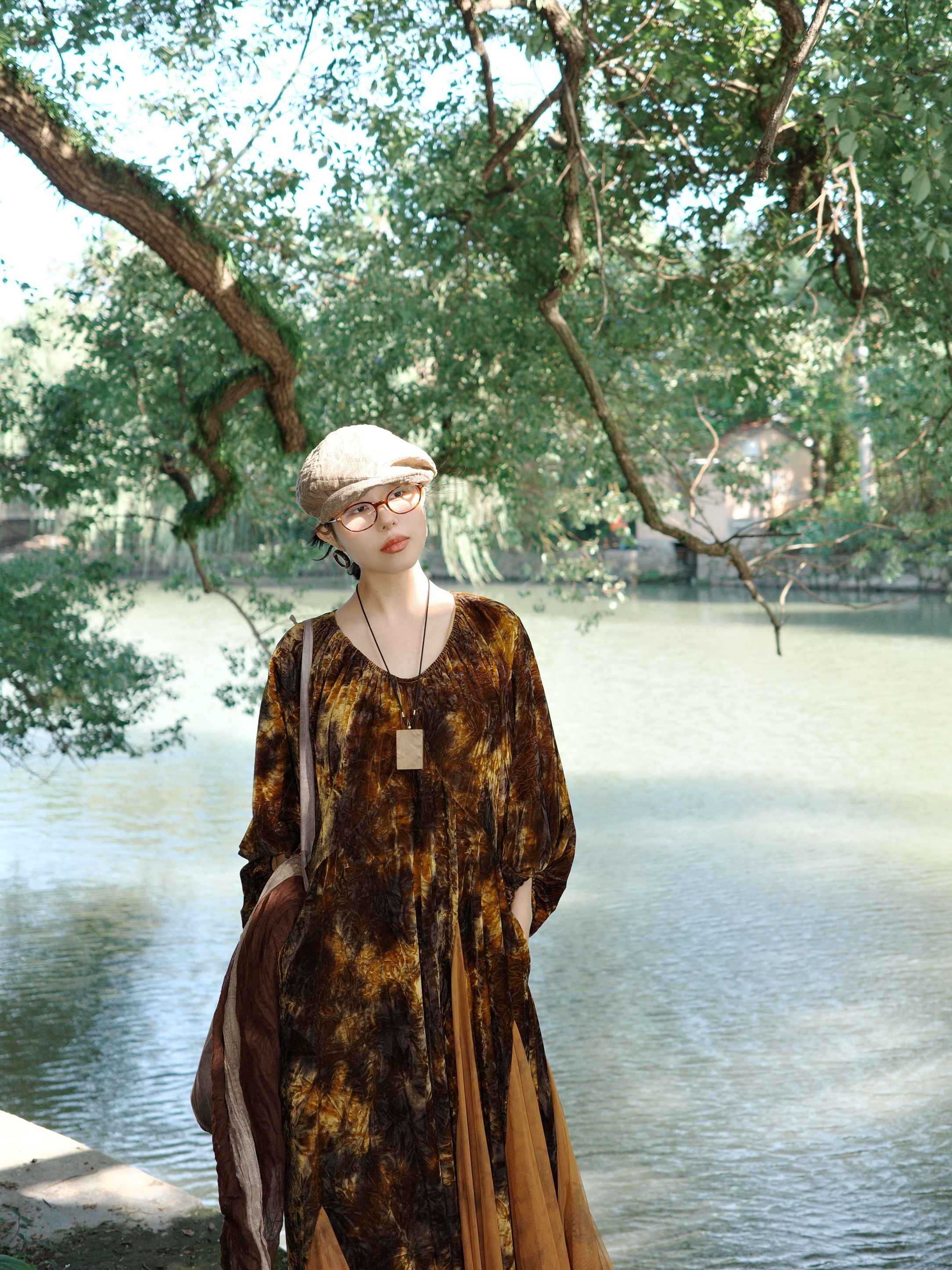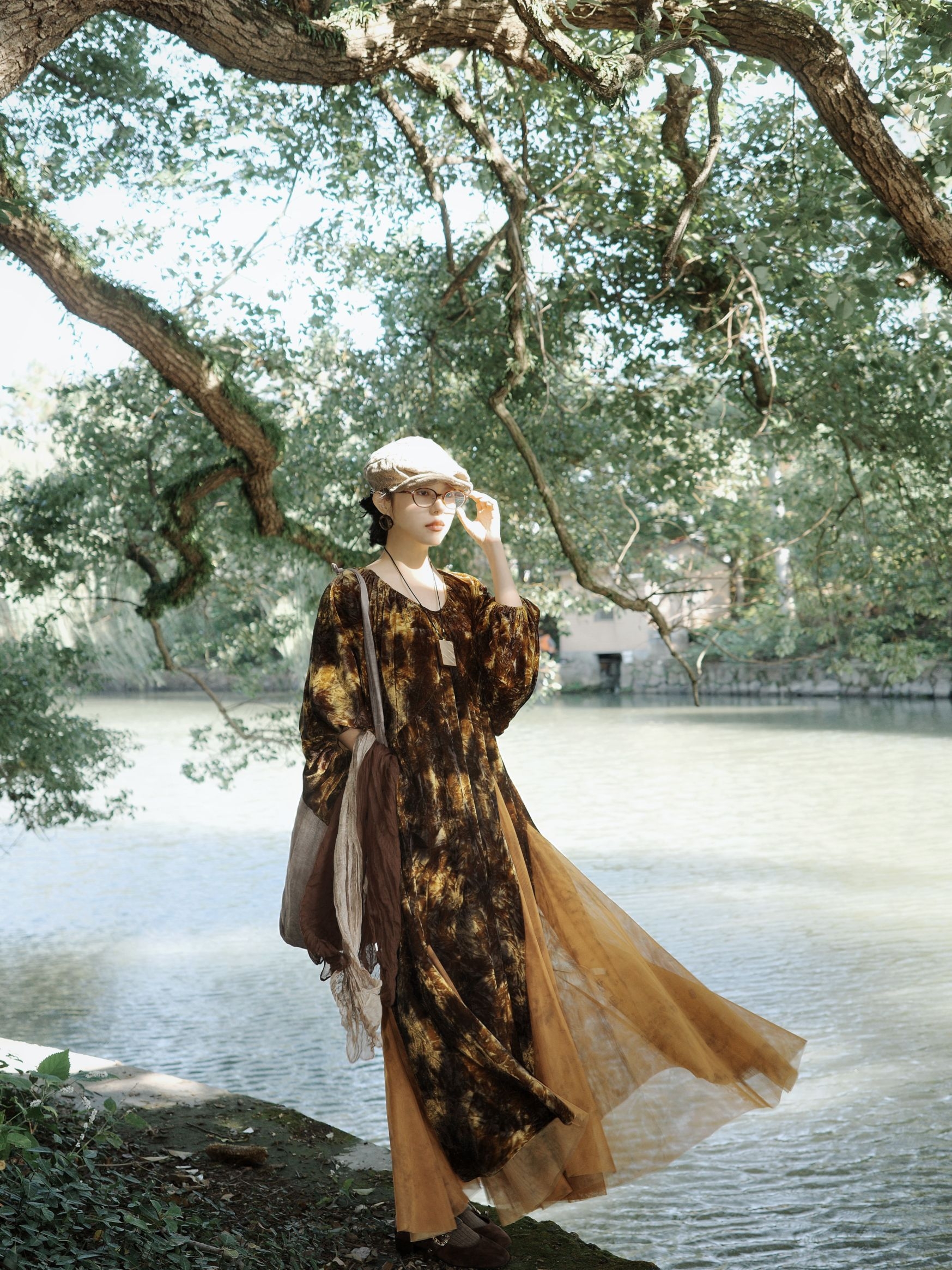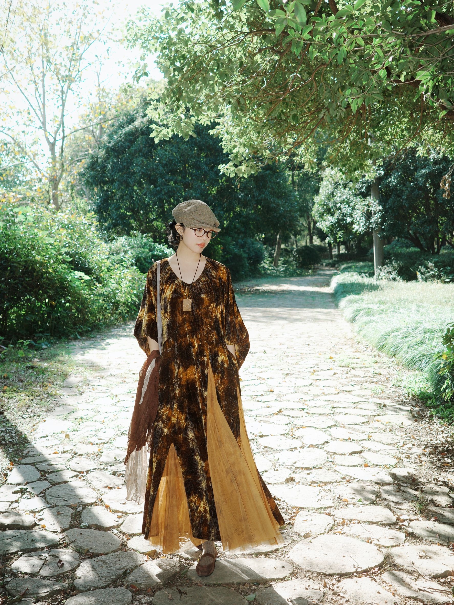秋日出游穿这一身,新中式文艺感精准戳中我! 扎染棕黄调的连衣裙太有艺术感了~新中式宽松版型穿起来舒服到不想脱,薄纱裙摆风一吹飘起来,氛围感直接拉满! 配上复古报童帽,复古那味儿一下拿捏到位~再搭个软乎乎的大容量包包和简约吊坠,往水边老树下一站,整个人都裹着秋天的温柔,文艺又松弛的感觉太妙了!