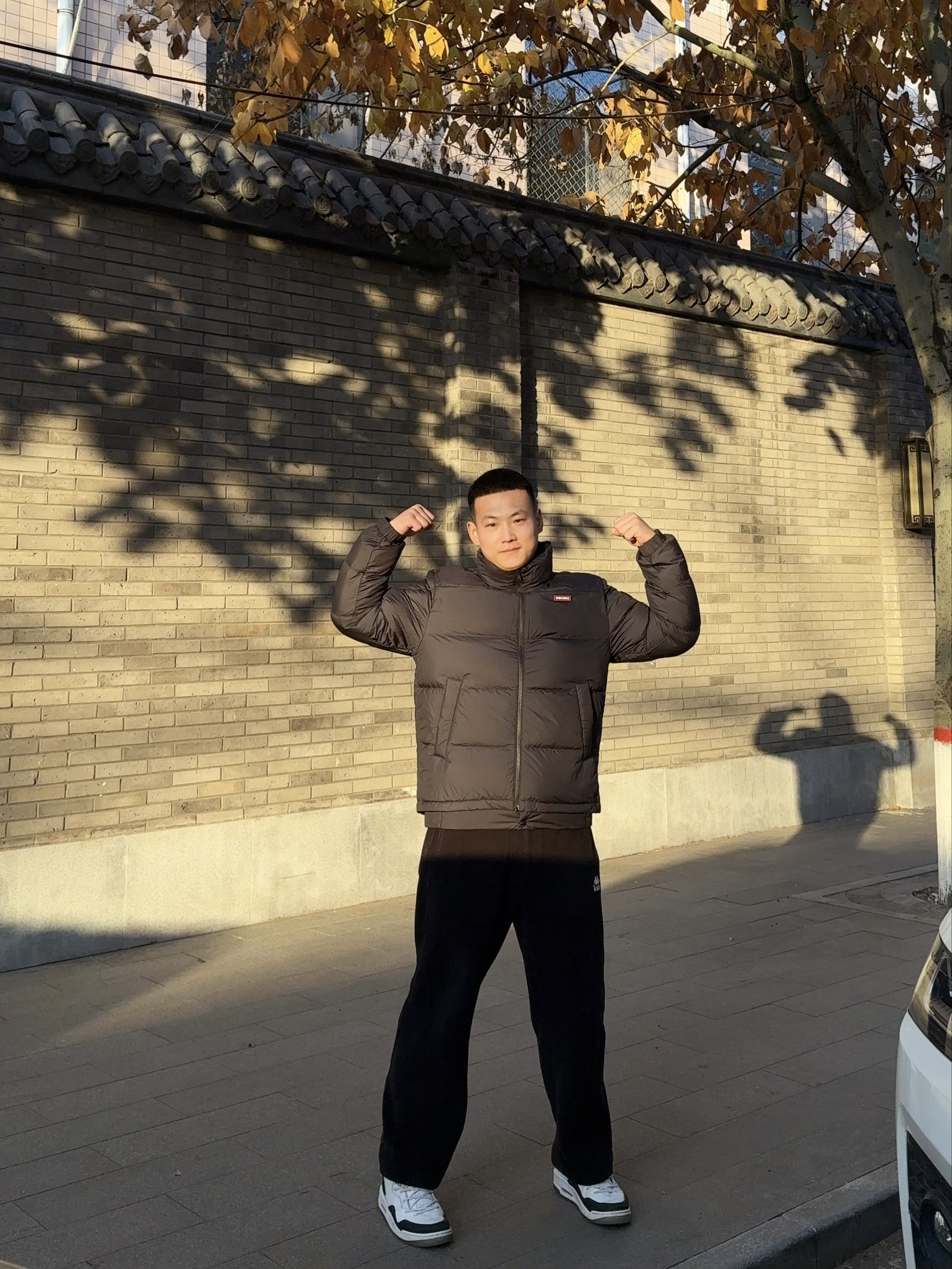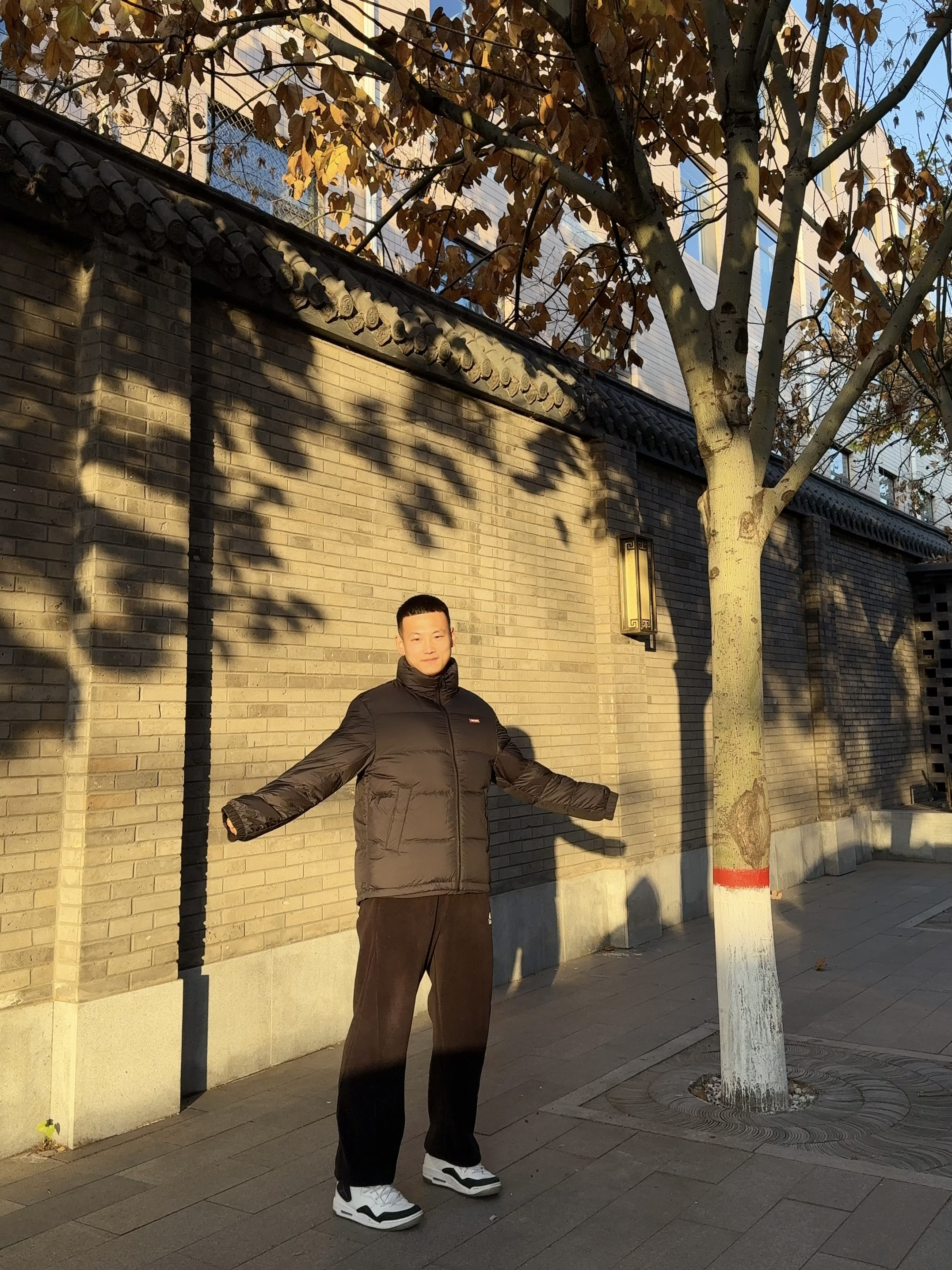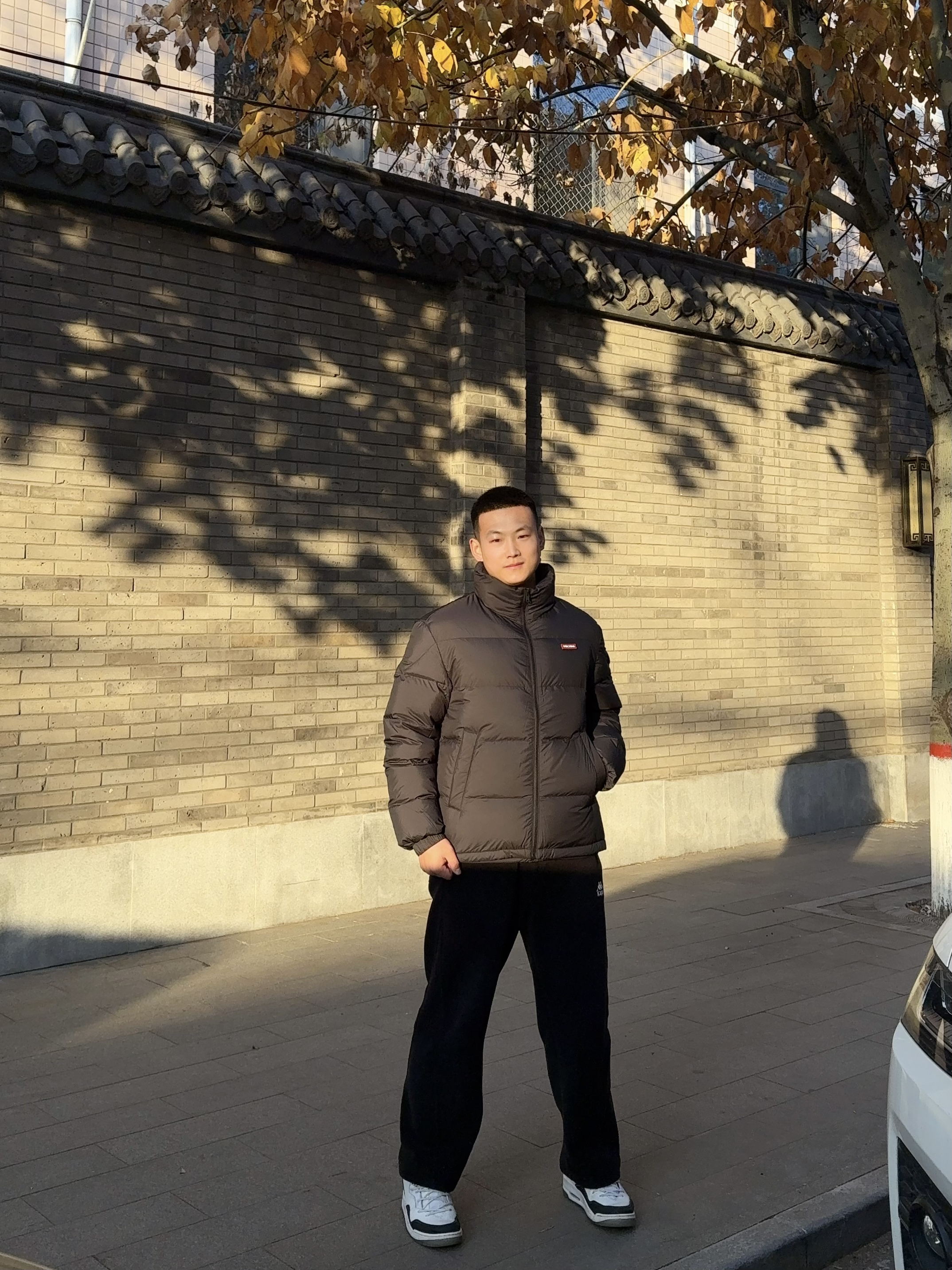 今天出门被这阳光勾住了,老墙+落叶的光影也太衬这衣服的棕调了。 这件羽绒服是真的“膨胀”,套上直接跟寒风说拜拜,但意外的是这种软乎乎的蓬松感,配个宽腿裤居然不臃肿——暗棕+深黑的低饱和配色,连我这种不会搭的人都能穿出点随性的味儿。 最绝的是领口刚好卡在下巴,手插口袋的时候,整个人像裹在暖乎乎的被子里