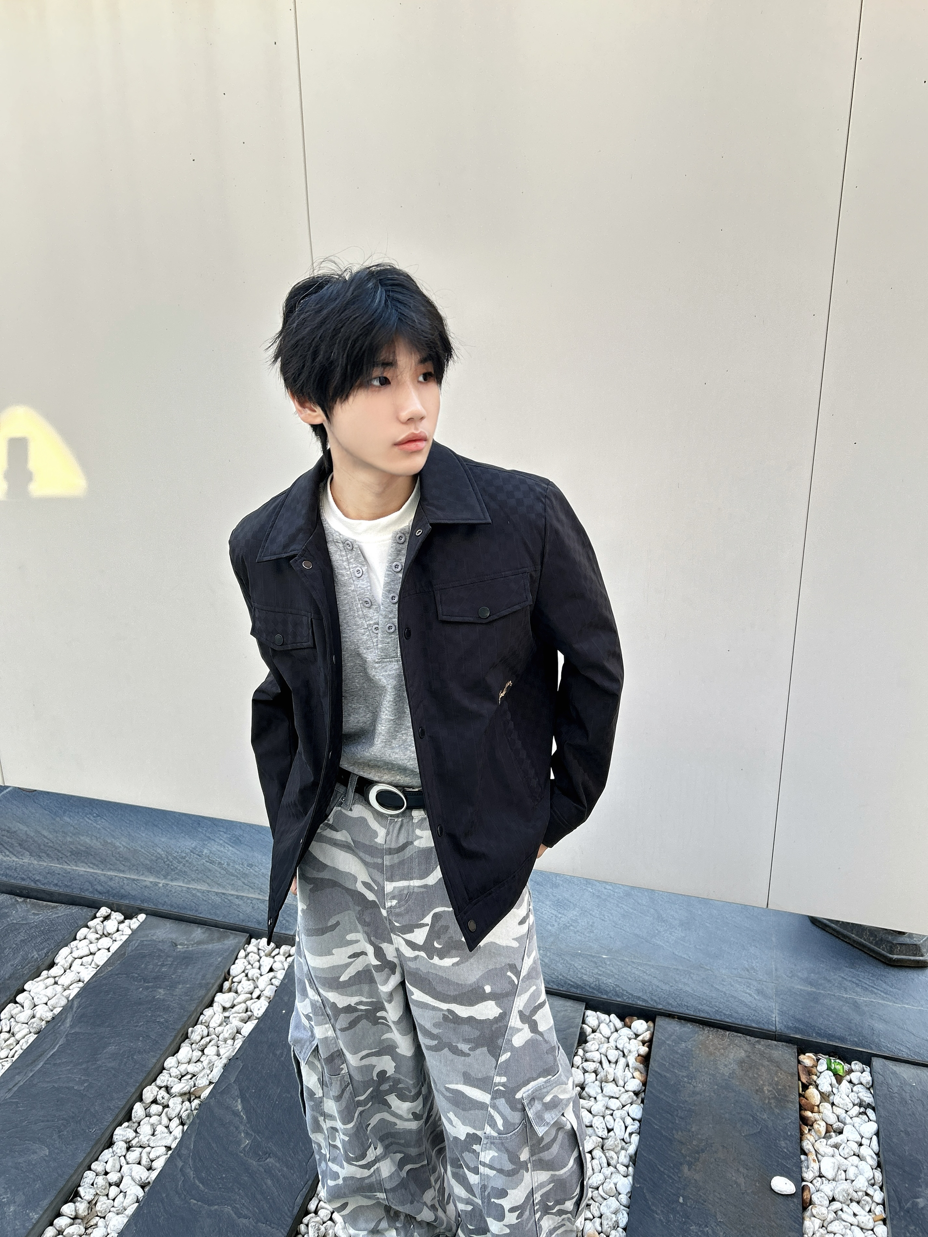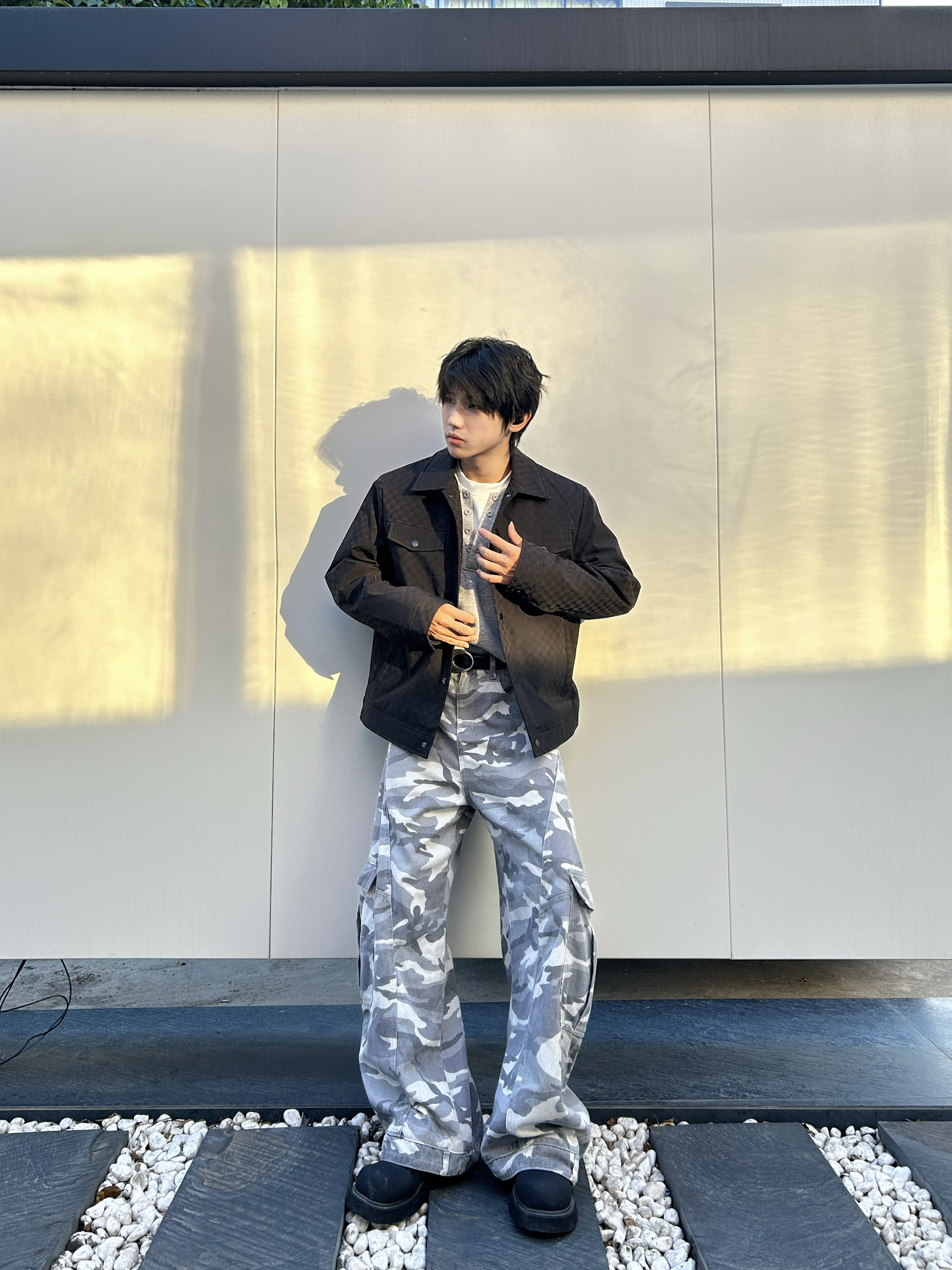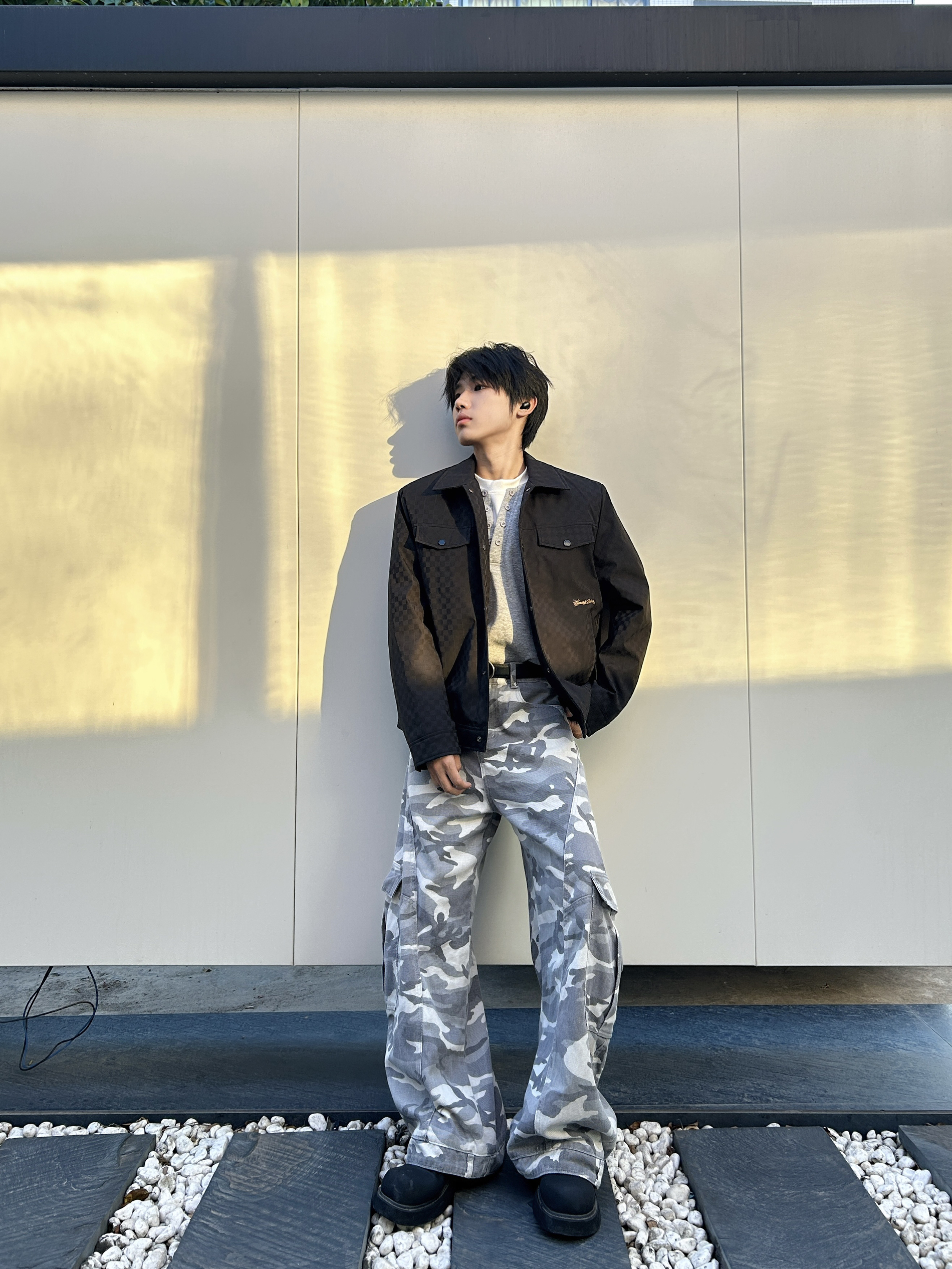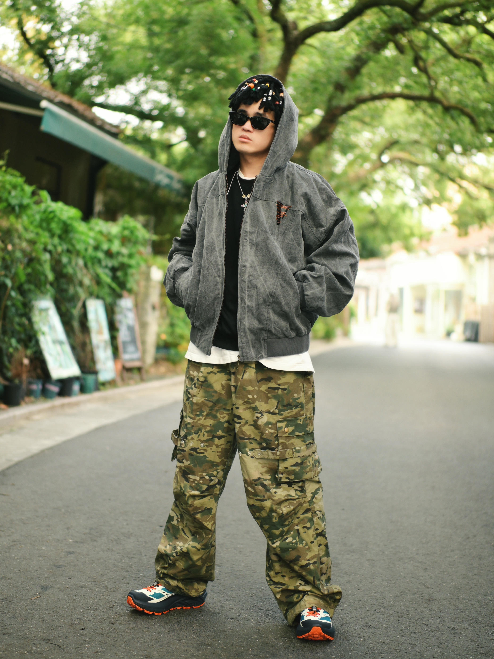 傍晚的风裹着冷意 低饱和的灰黑调像把街头感揉得刚好 黑夹克压稳秋冬氛围 内搭浅灰亨利领露边衬出层次 迷彩阔腿裤抢足视觉重点 厚底鞋坠住版型 暗色调里掺点痞帅纹理 街头感和舒适感直接焊死