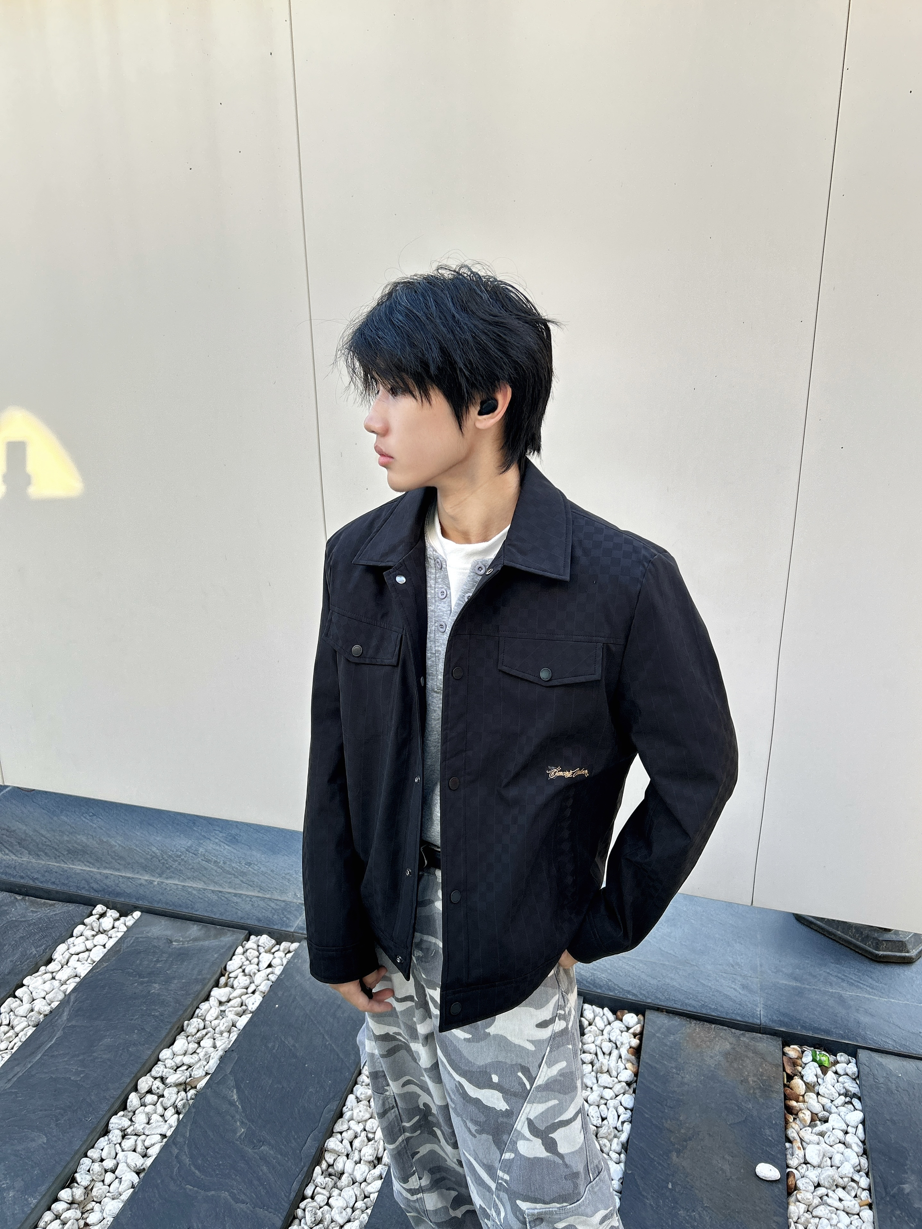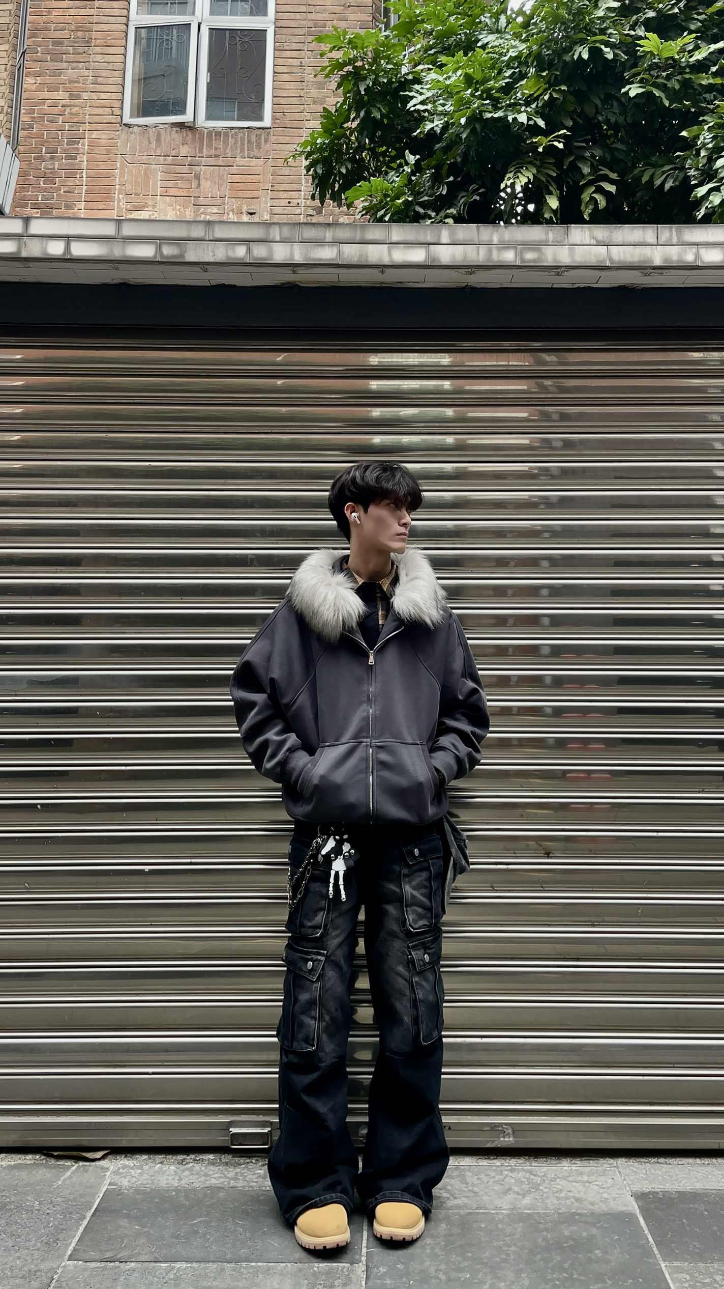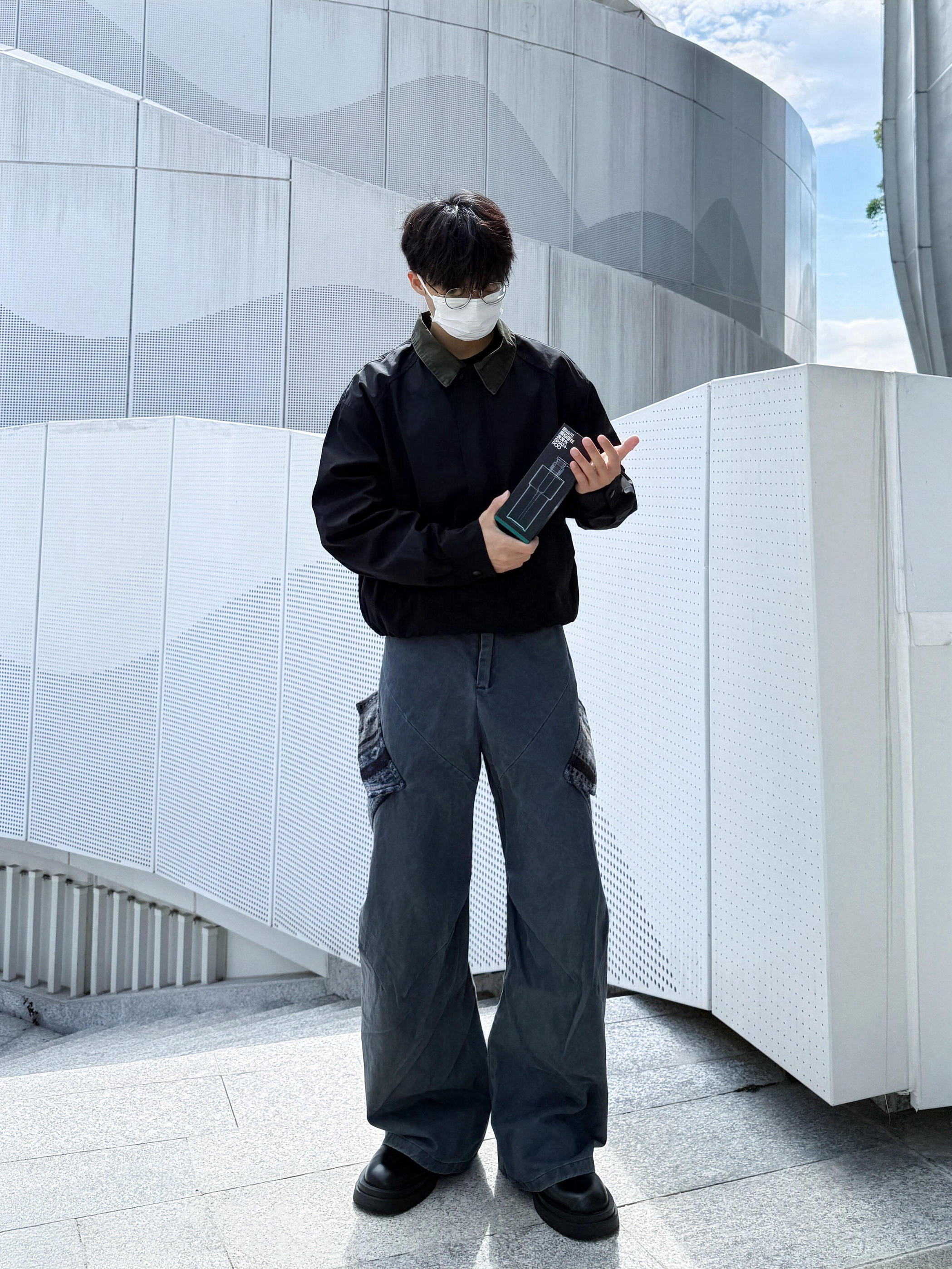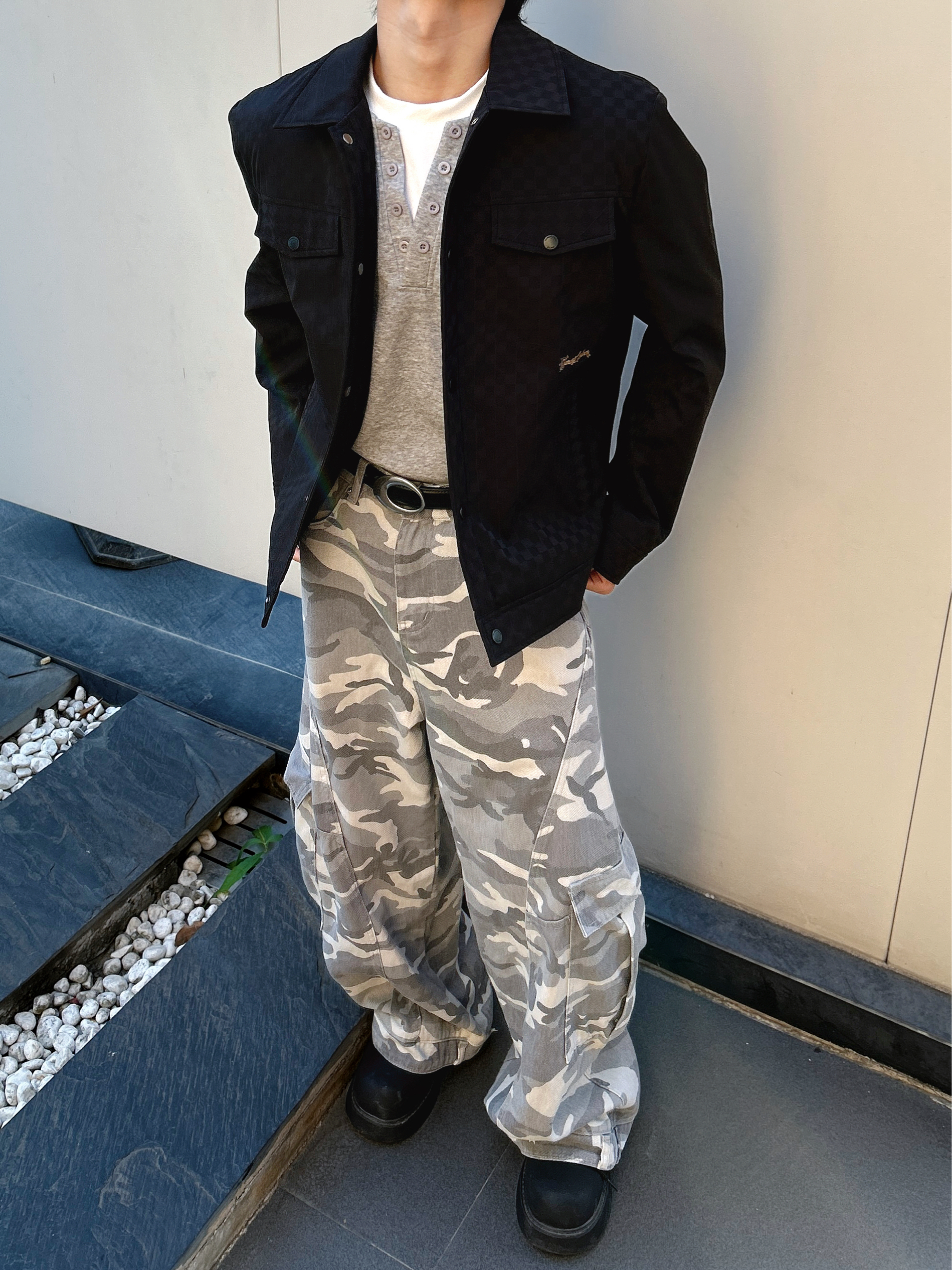 傍晚的风裹着冷意 低饱和的灰黑调像把街头感揉得刚好 黑夹克压稳秋冬氛围 内搭浅灰亨利领露边衬出层次 迷彩阔腿裤抢足视觉重点 厚底鞋坠住版型 暗色调里掺点痞帅纹理 街头感和舒适感直接焊死
