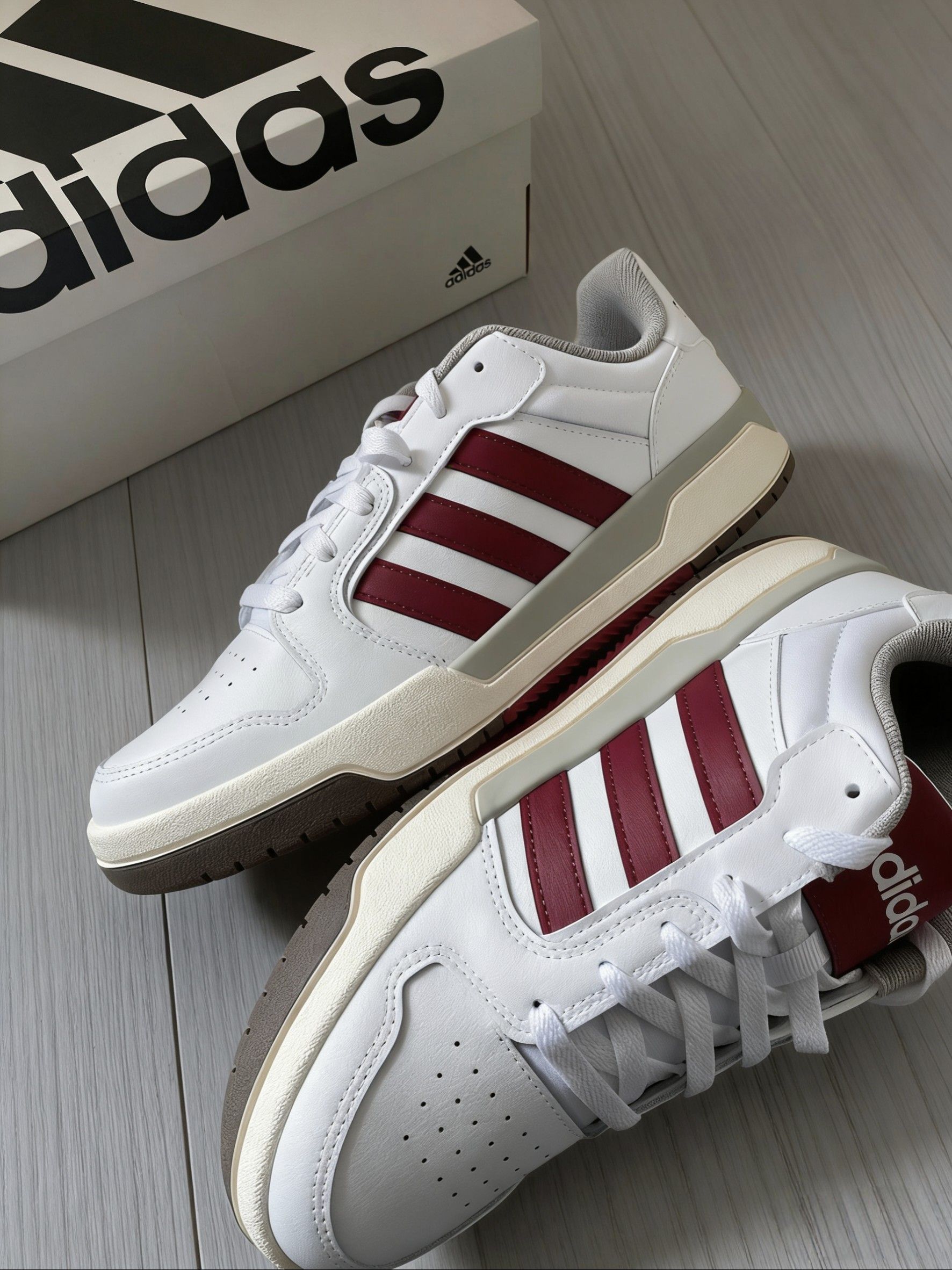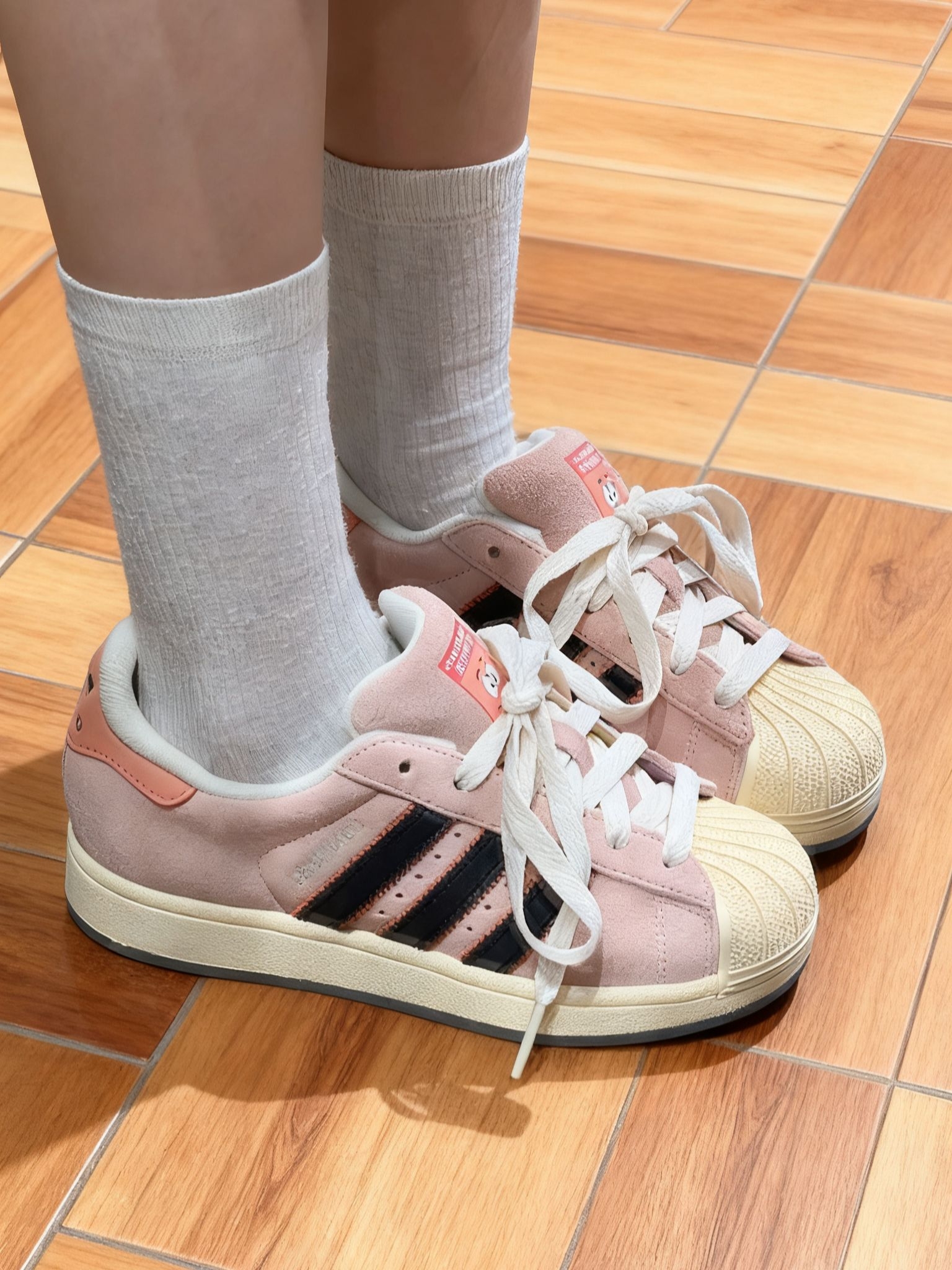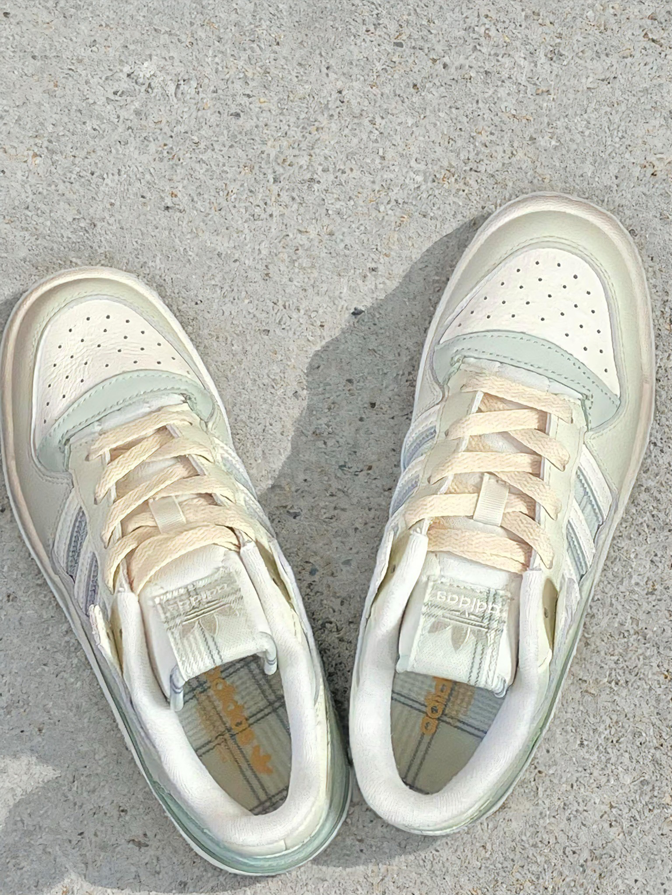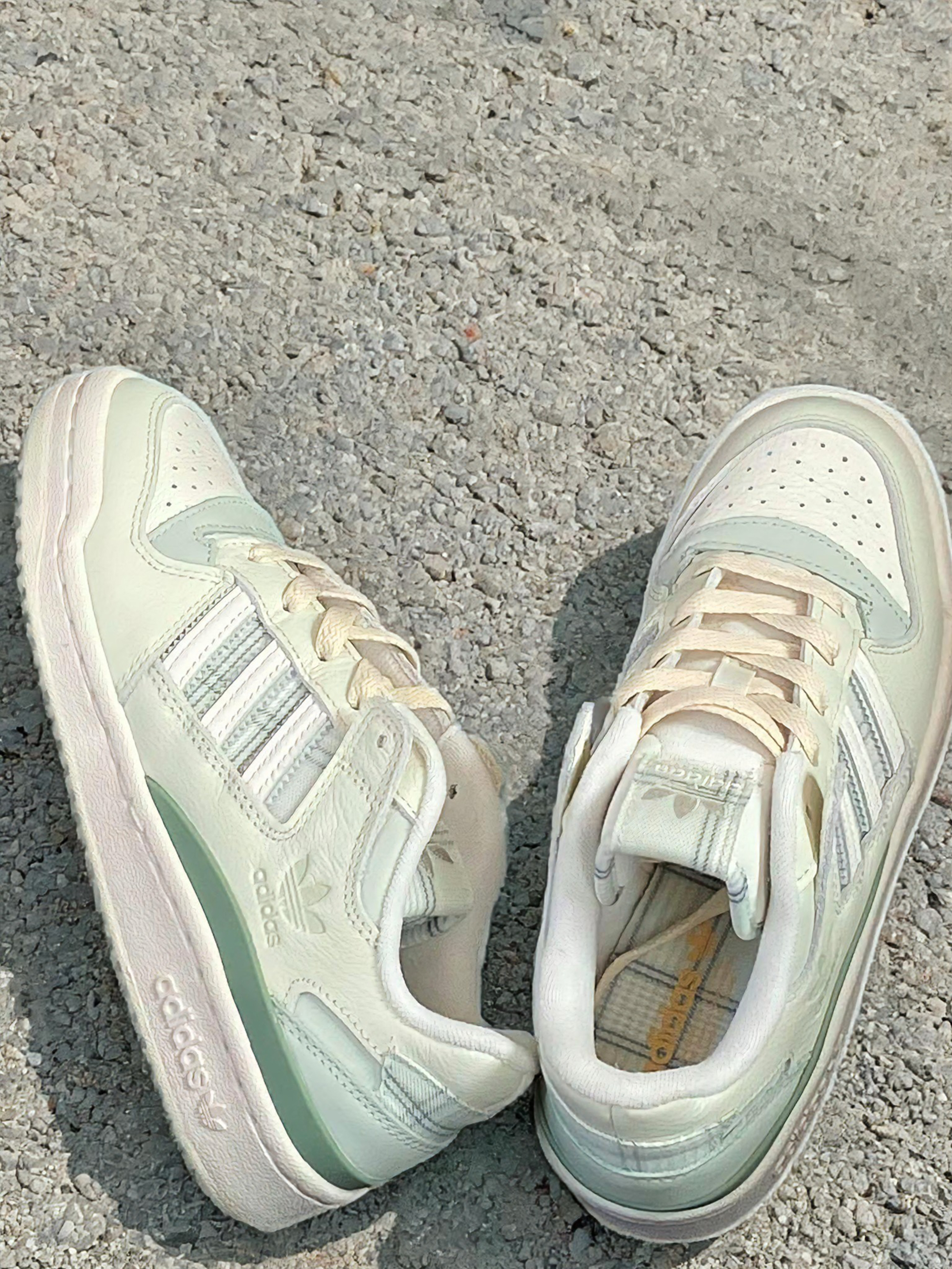 奶fufu的色调混着淡薄荷绿,穿上脚就像把春天那种柔柔的感觉裹在脚上,还挺奇妙的。皮质摸起来软软糯糯,但鞋型能撑住,不是软塌塌没型的那种,质感看着是在线的。 三叶草标和侧边条纹带点复古感,但整体又很清爽,完全不显老气,还挺好搭的。平时随便配条牛仔裤、休闲裤就能出门,套件卫衣或者毛衣,看着也舒服,不用费脑子想搭配。 上学、逛街我穿得最多,走路还算舒服,逛一天下来也没觉得累脚。上次在阳光下拍了张照...