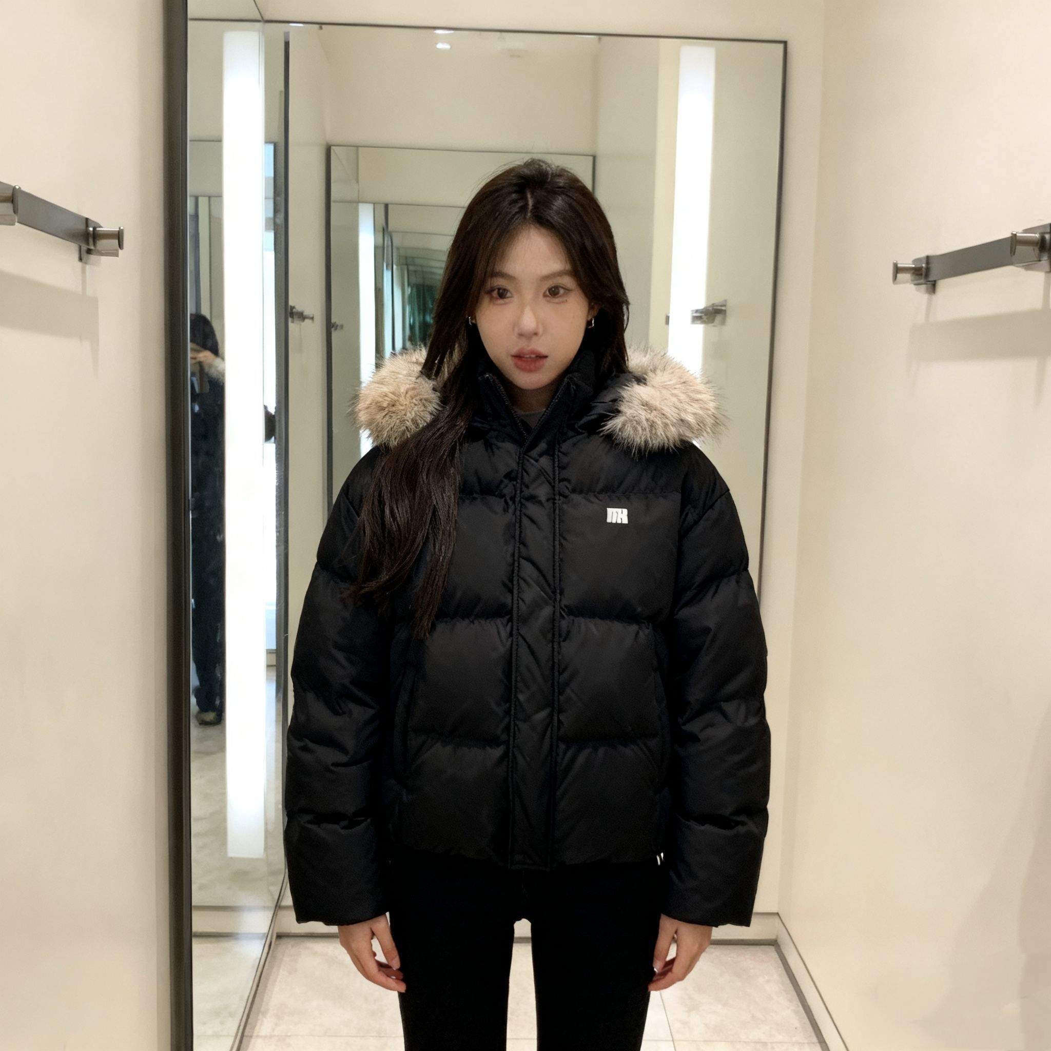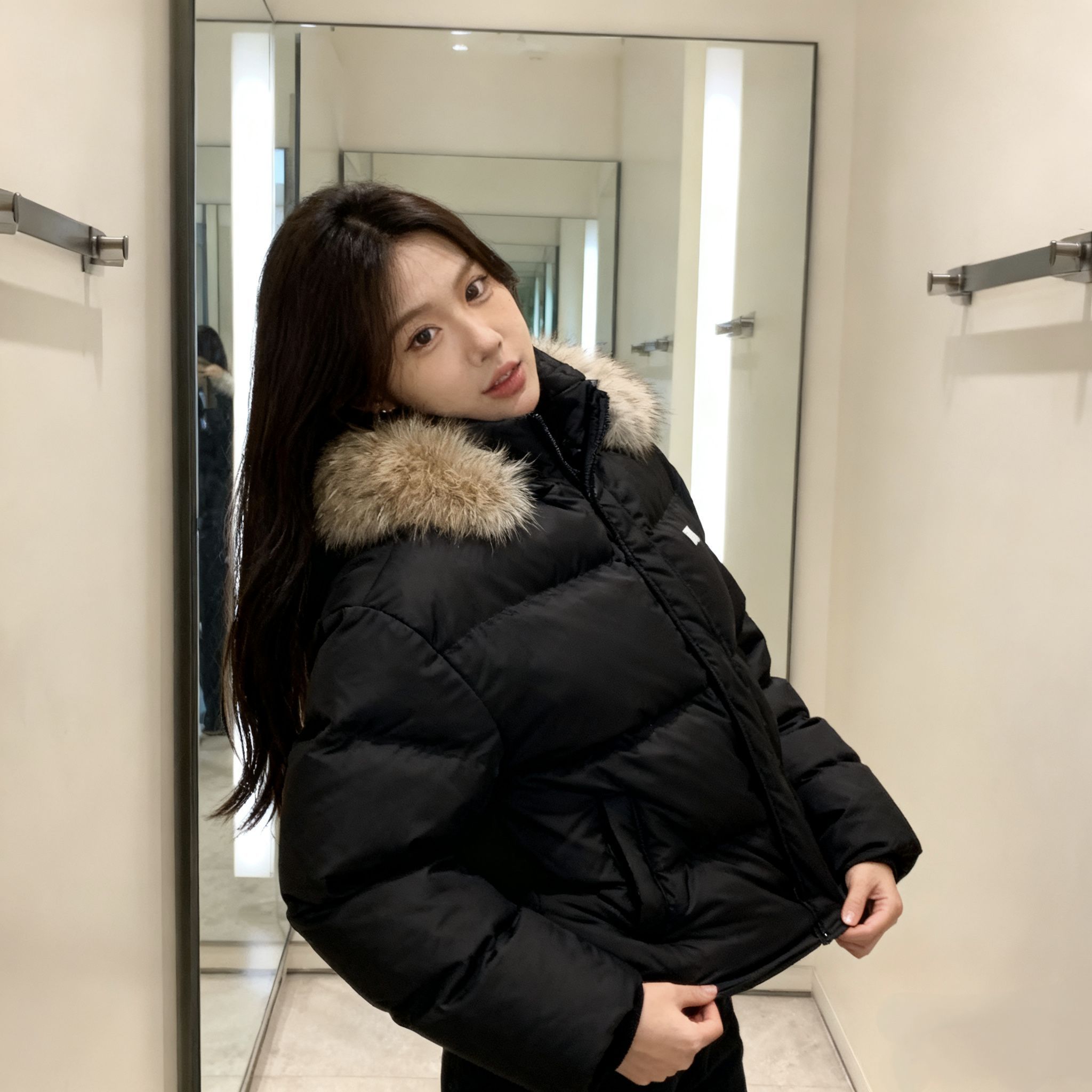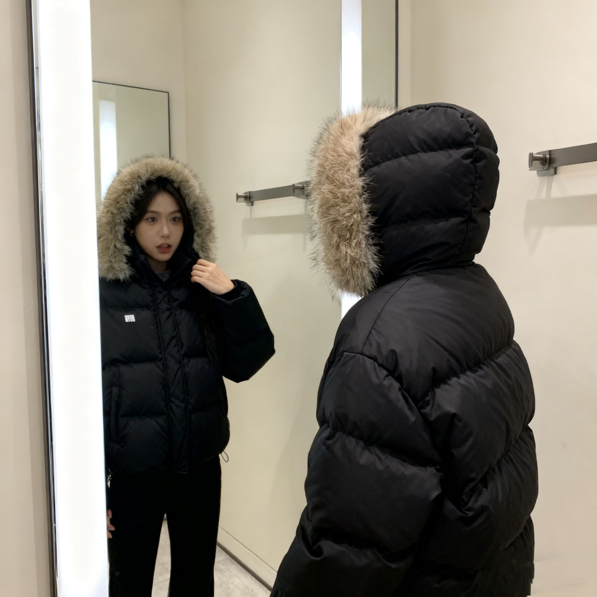 这羽绒服我真的一眼爱上!今天在商场试了直接拿下,黑面包服+大毛领巨显脸小,穿上就是韩系女高本人! 充绒很足但不压身,连帽款防风又暖,口袋够大能揣手机钥匙~得物入的质感没话说,这个毛领软乎乎的贼舒服,配卫衣牛仔裤都好看,冬天保命又出片!
