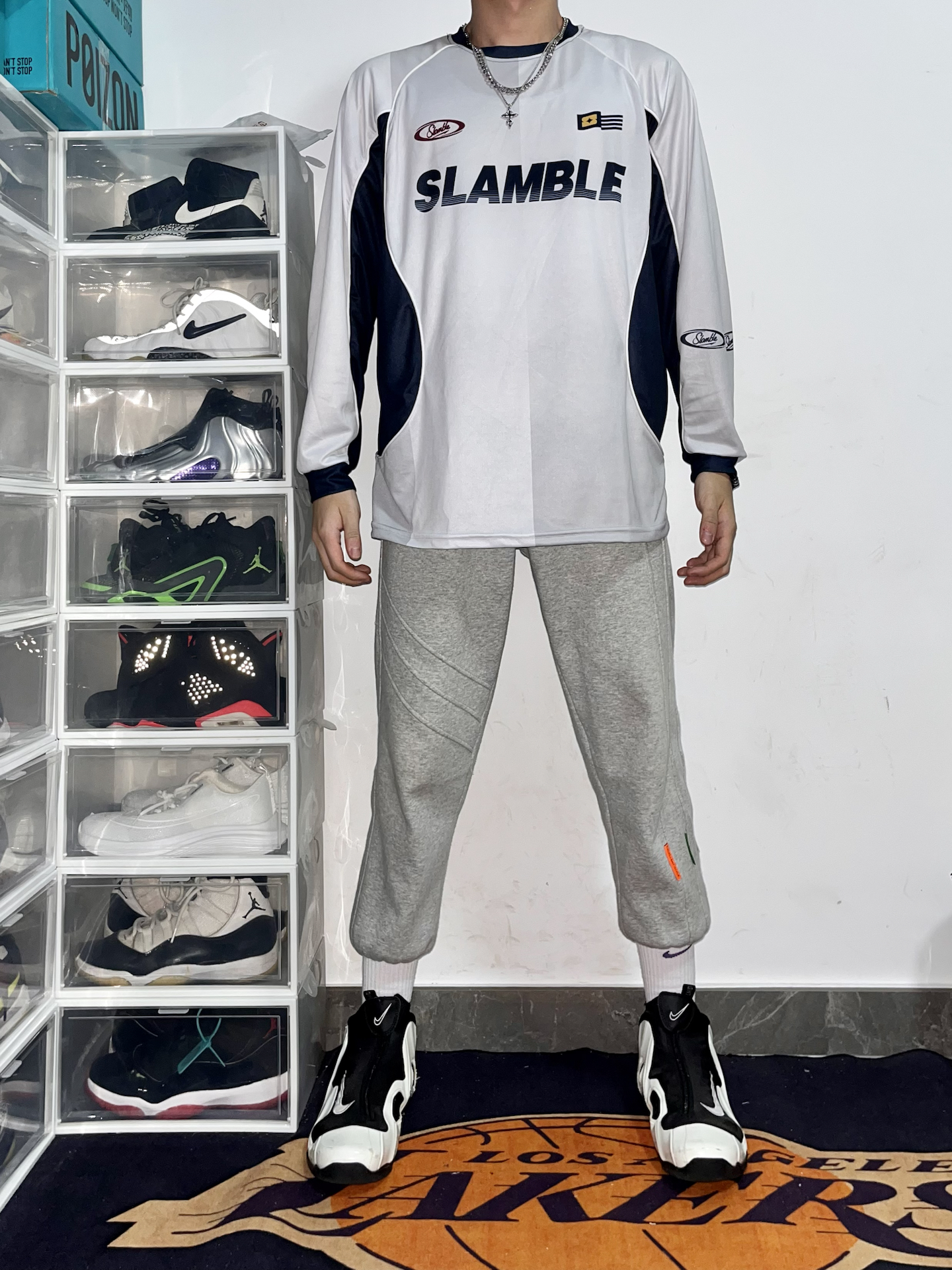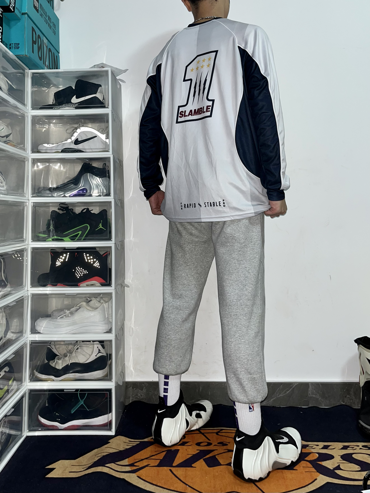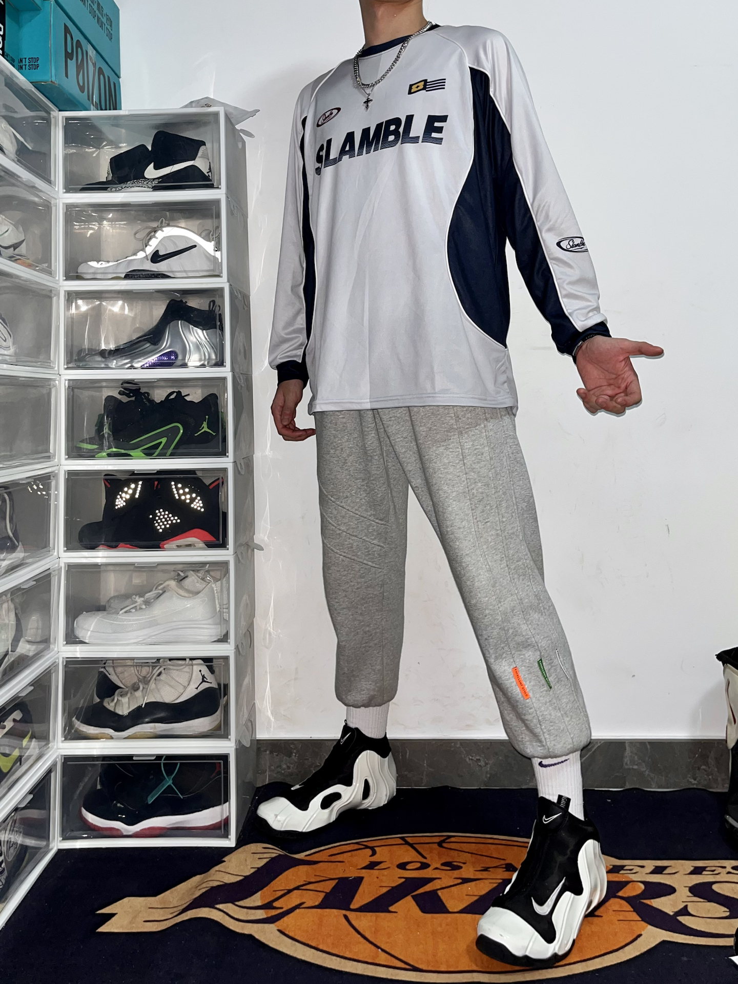 👕上衣: #slamble 主题长袖(白蓝拼接+字母印花,运动感穿在身上,面料轻薄透气不闷 👖裤子:浅灰束脚卫裤(软乎乎的面料,宽松版型藏肉又舒服,小标点缀细节很加分 👟鞋:黑白风一来情绪(鞋型偏修长和整体运动风适配度 随便往鞋架旁一站都像刚打完球的松弛感,日常出街或球场晃悠都能穿,舒服又有范儿🤙 #运动风天花板 #篮球生冬日穿搭 #slamble #Slamble运动长袖 #篮球运动长...
