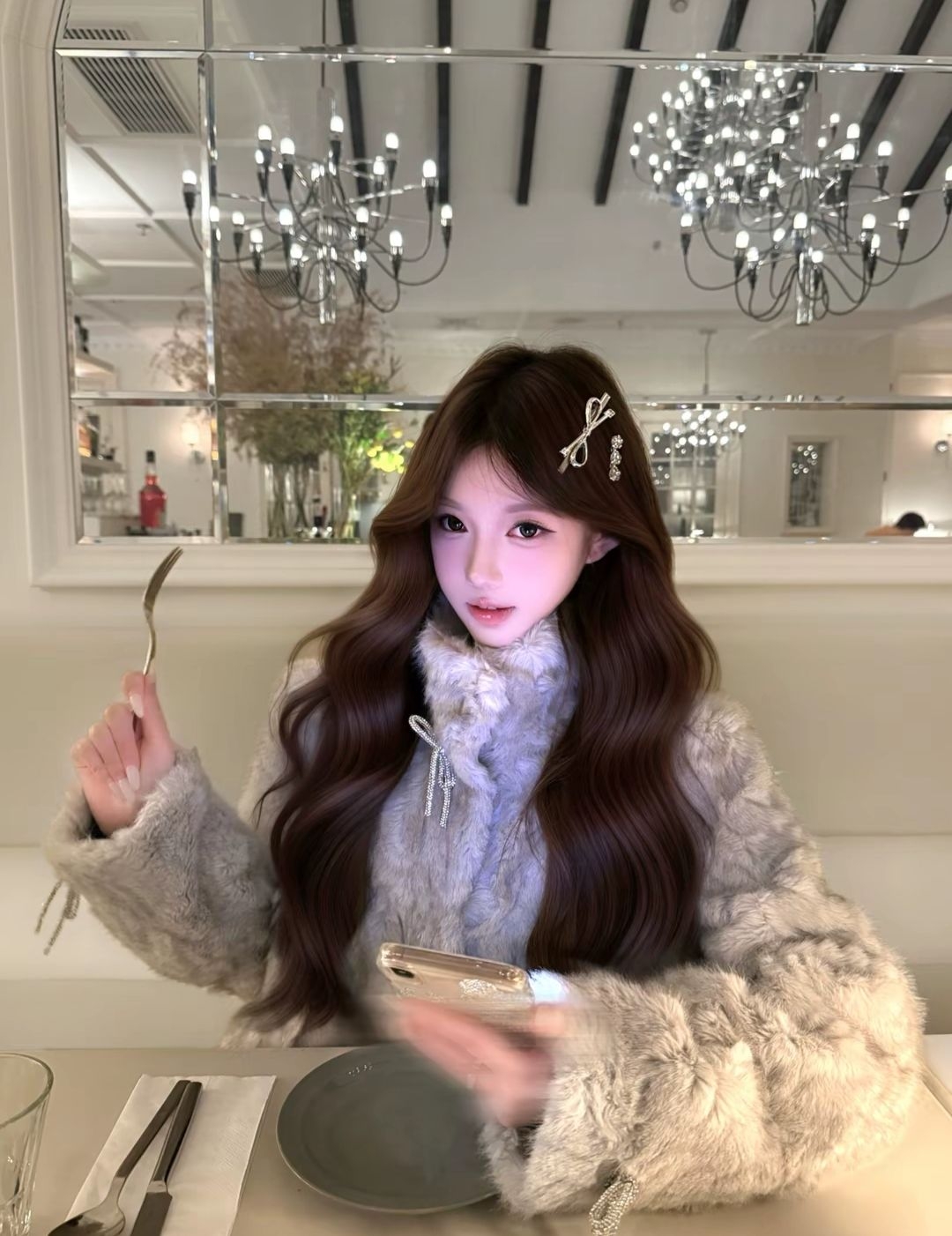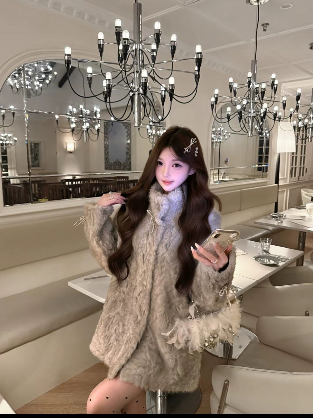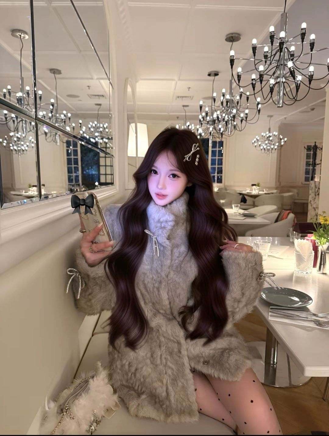 灰色卷毛毛绒外套好可爱呀 袖口和领口都有蝴蝶结点缀 闪闪的 搭配同色系的一身很显质感
