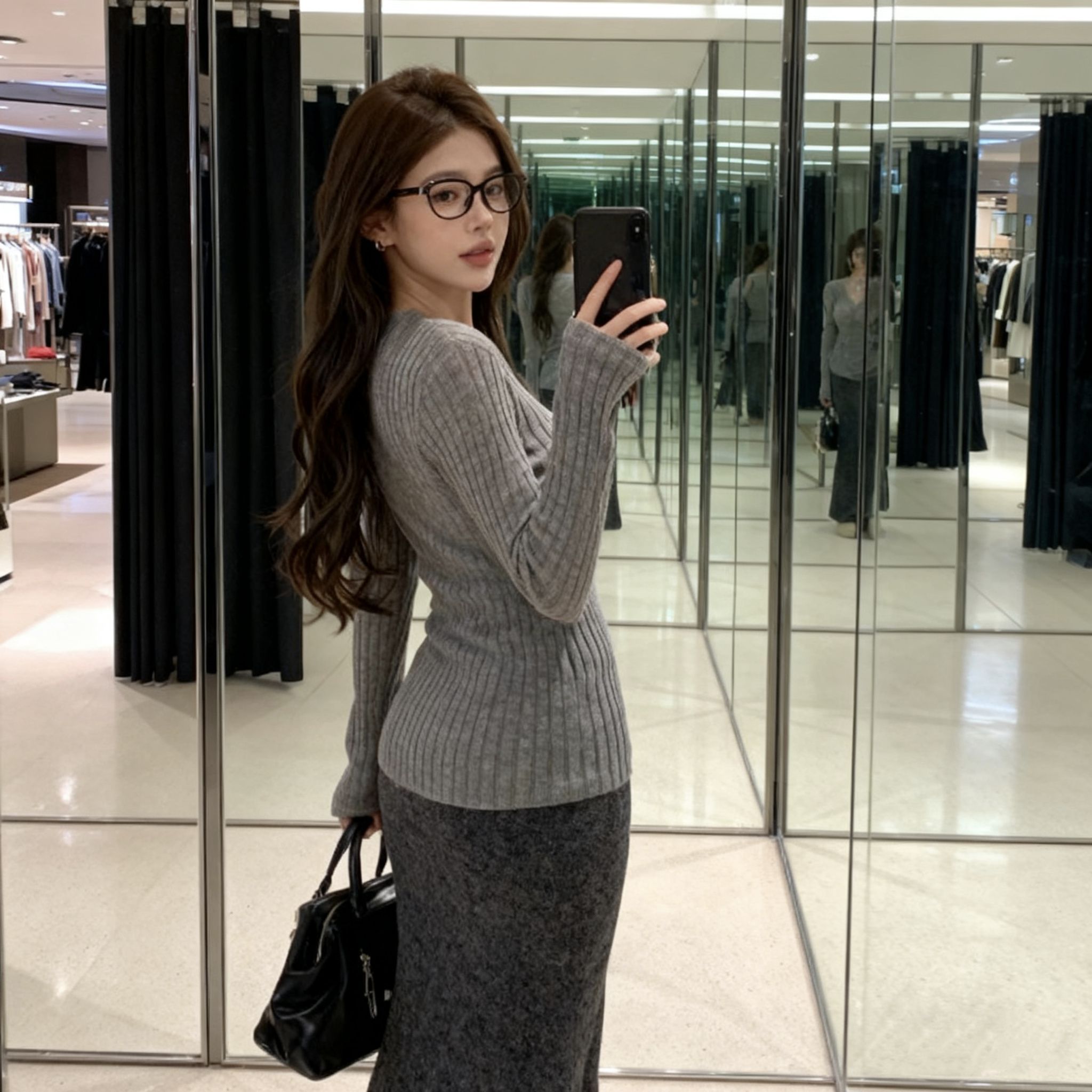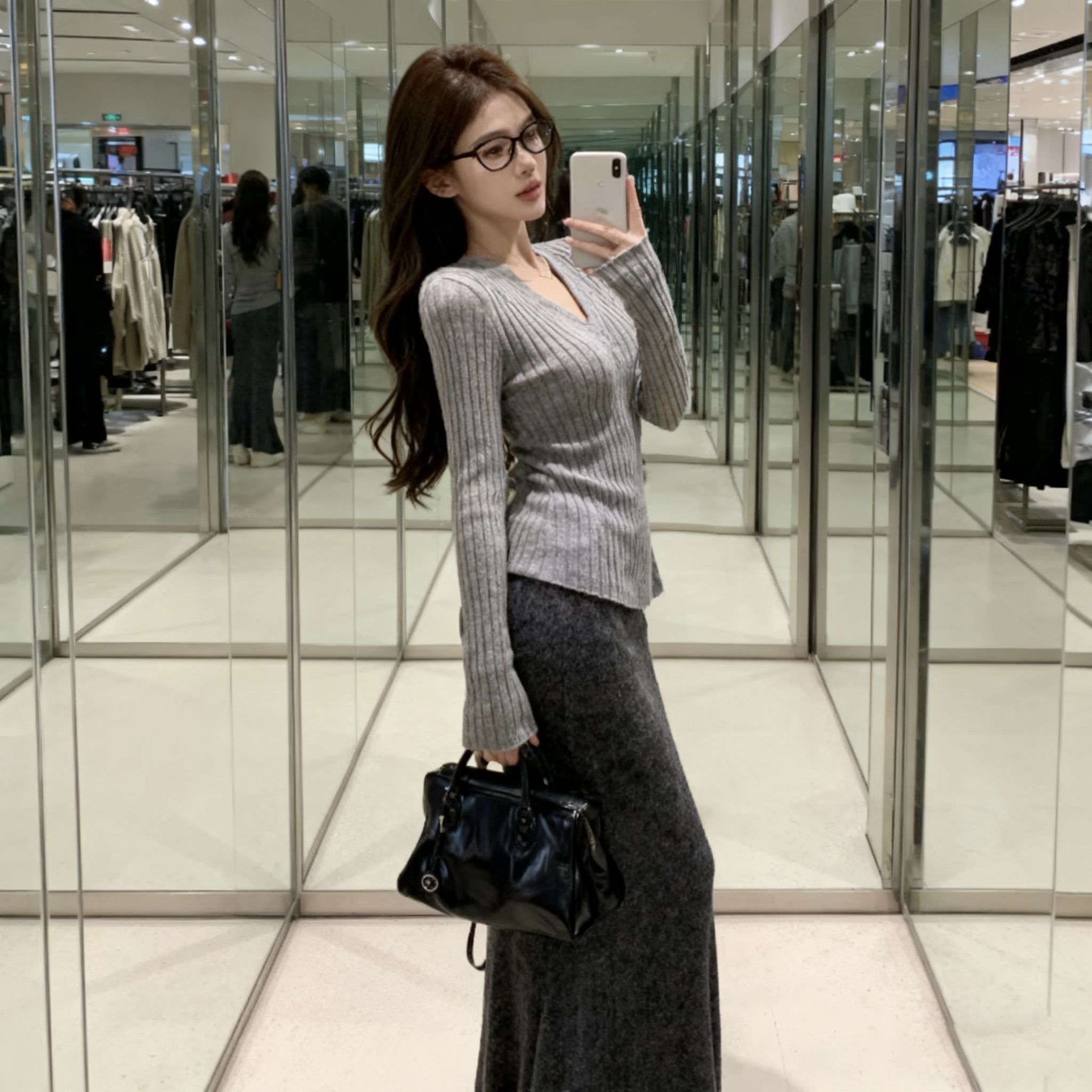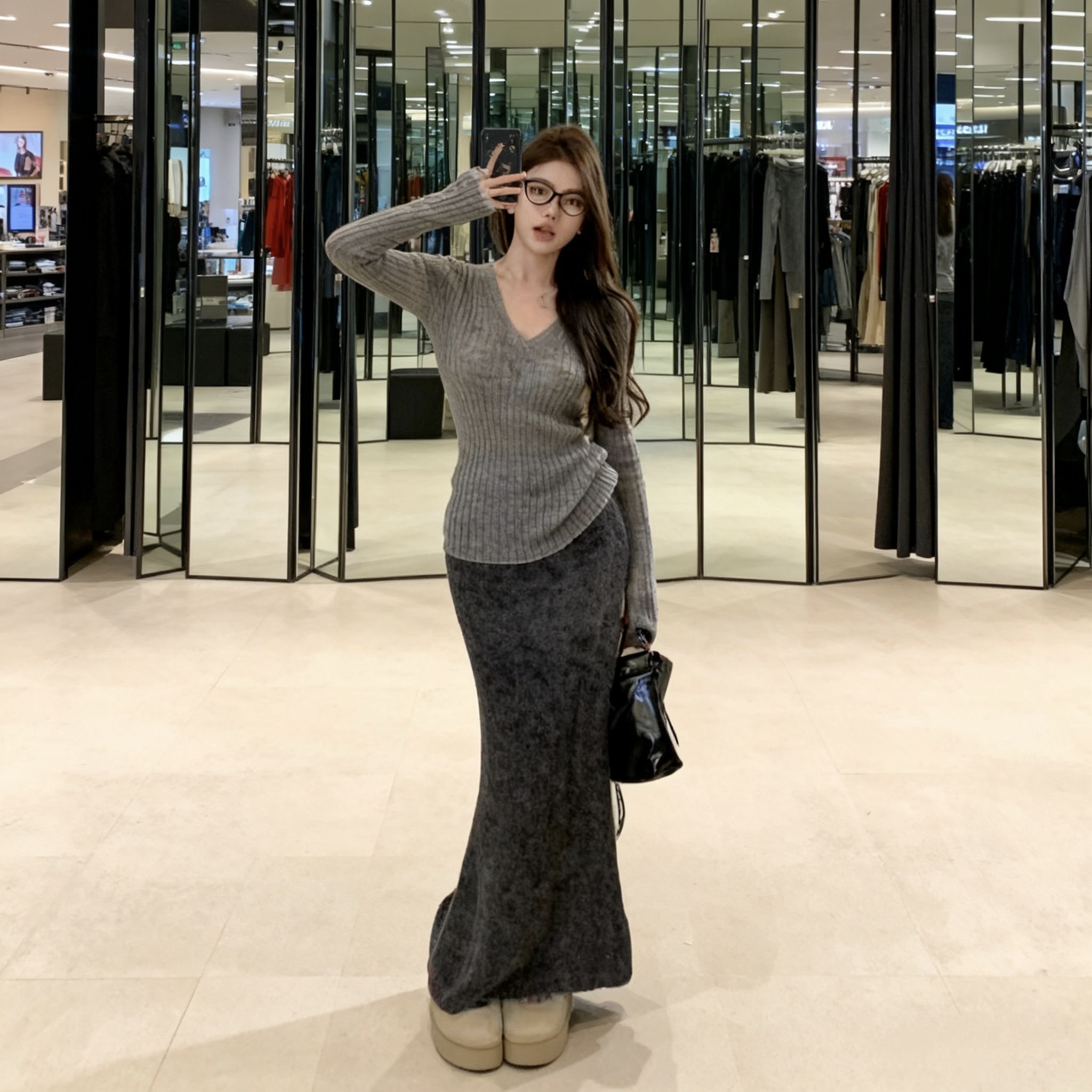 谁懂啊!这套灰调针织套装我直接焊在身上了!V领针织衫是软乎乎的羊绒混纺,贴身穿完全不扎,紧身款刚好勾勒腰臀比,抬手露一点腰头巨显瘦;鱼尾长裙是那种带点杂色的深灰,垂感真的绝,走路带风还把我这种假胯宽遮得严严实实,长度到脚踝刚好露出厚底鞋边,显高又不压个子! 昨天穿去商场逛,刚进电梯就被隔壁姐妹问链接,搭了个黑色小方包,韩系松弛感直接拉满!秋冬穿这套,温柔又有点小女人味,冷了披件大衣也巨搭,梨形...