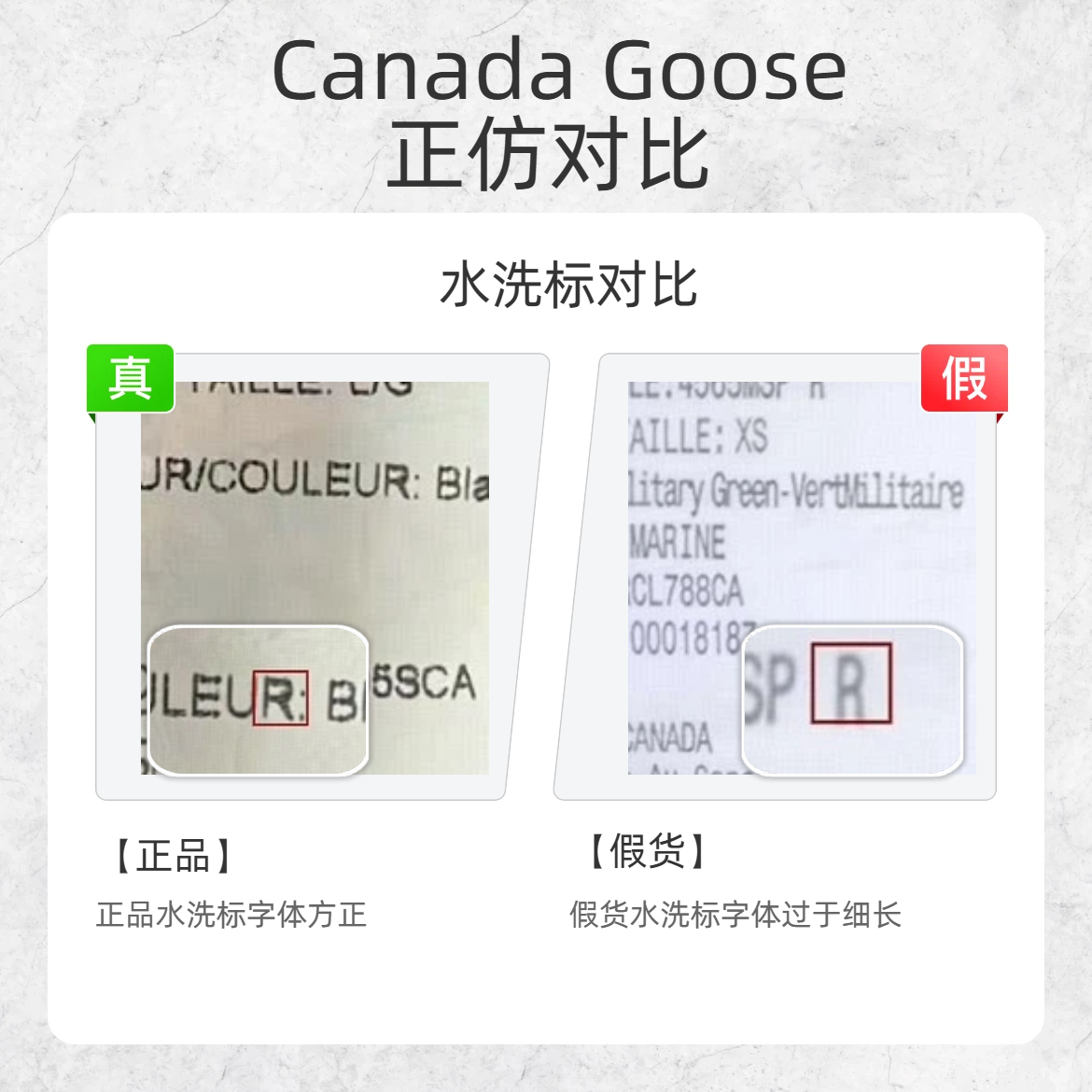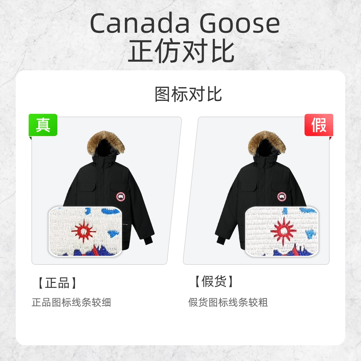 谁懂啊!花大几千买件 Canada Goose 结果是假的真的会心梗… 整理了 3 个超直观的鉴别点,看完秒变鉴假达人👇 1️⃣ 图标细节:细 vs 粗 ✅正品:品牌标志性的枫叶图标刺绣线条更纤细,针脚紧密精致 ❌假货:图标线条明显加粗,刺绣质感粗糙廉价 2️⃣ 拉链质感:哑光 vs 反光 ✅正品:拉链是低调的哑光金属质感,不会油亮反光 ❌假货:拉链表面发亮反光 3️⃣ 水洗标字体:方正 v...
