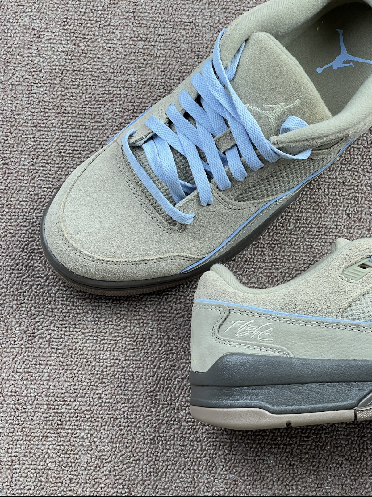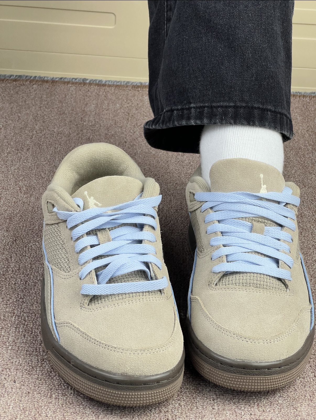 这双AJ的浅卡其配色上脚挺温柔,浅蓝鞋带刚好中和了沉闷感,搭深色牛仔裤看着很舒服👟 但穿了两天发现,麂皮+网布的拼接面有点“麻烦”:麂皮部分沾点灰就显脏,网布孔隙容易卡小绒毛,得拿粘毛器来回滚。鞋身比普通板鞋重一点,逛一小时街脚腕会有点沉,宽脚穿鞋头略挤,得把鞋带松半格才舒服🙂↕️🙂↕️。 脚感倒是还行,鞋垫软度刚好,日常通勤踩点不硌脚;鞋口包边够软,不会磨后跟。不过鞋底的浅棕边容易蹭...