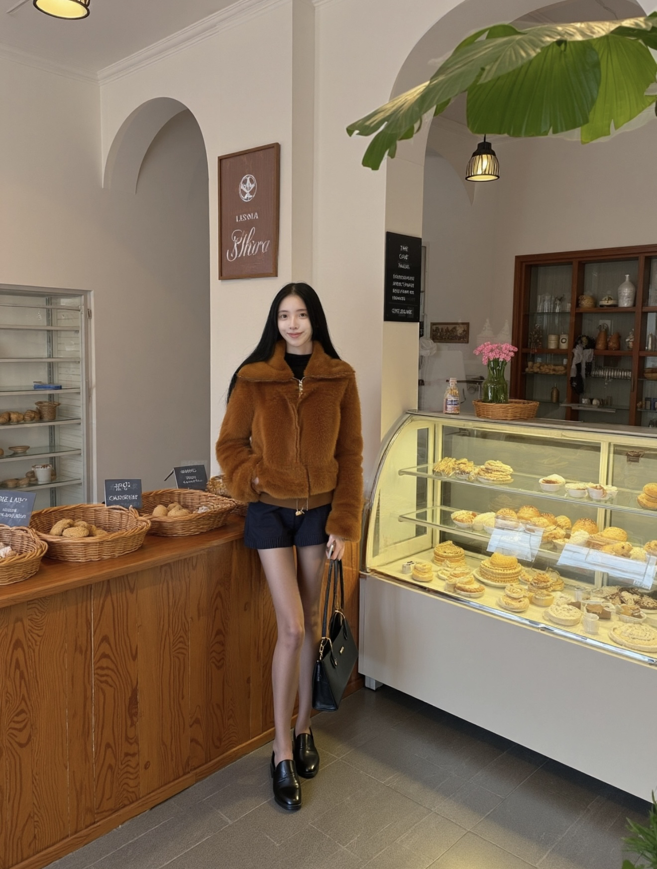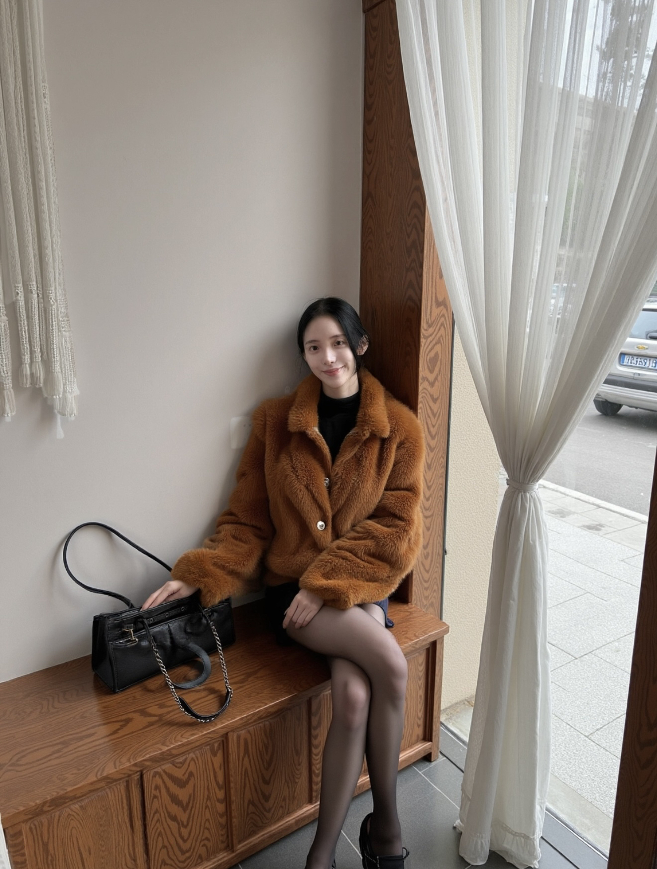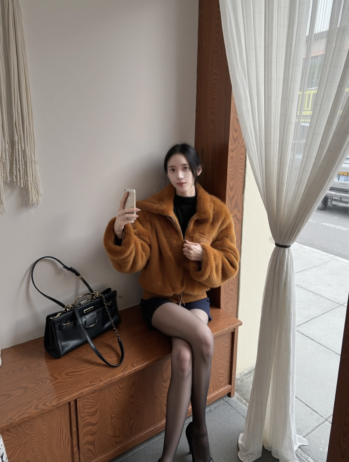 棕毛绒外套摸着手感软,裹着暖乎乎的~😌 拉链拉上不钻风,版型松快不压身✨ 黑包皮质挺润,链条背着不勒肩~ 黑丝贴腿不勾丝,穿久也不闷汗~ 高跟鞋跟稳,踩久了脚也没那么累~