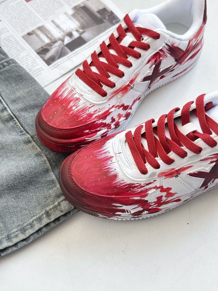 这双鞋脚感是板鞋常规水平,不软不硬,走半小时路没磨脚,但鞋底略薄,踩石子会有点硌。 鞋面是皮质,沾了点灰拿湿纸巾一擦就掉,这点还挺省心。就是鞋带容易松,出门得多系两圈😅 日常搭牛仔裤不突兀,就是红墨边缘有点轻微掉屑,可能得少蹭粗糙的东西。 要不要我帮你补充点具体的上脚搭配参考?