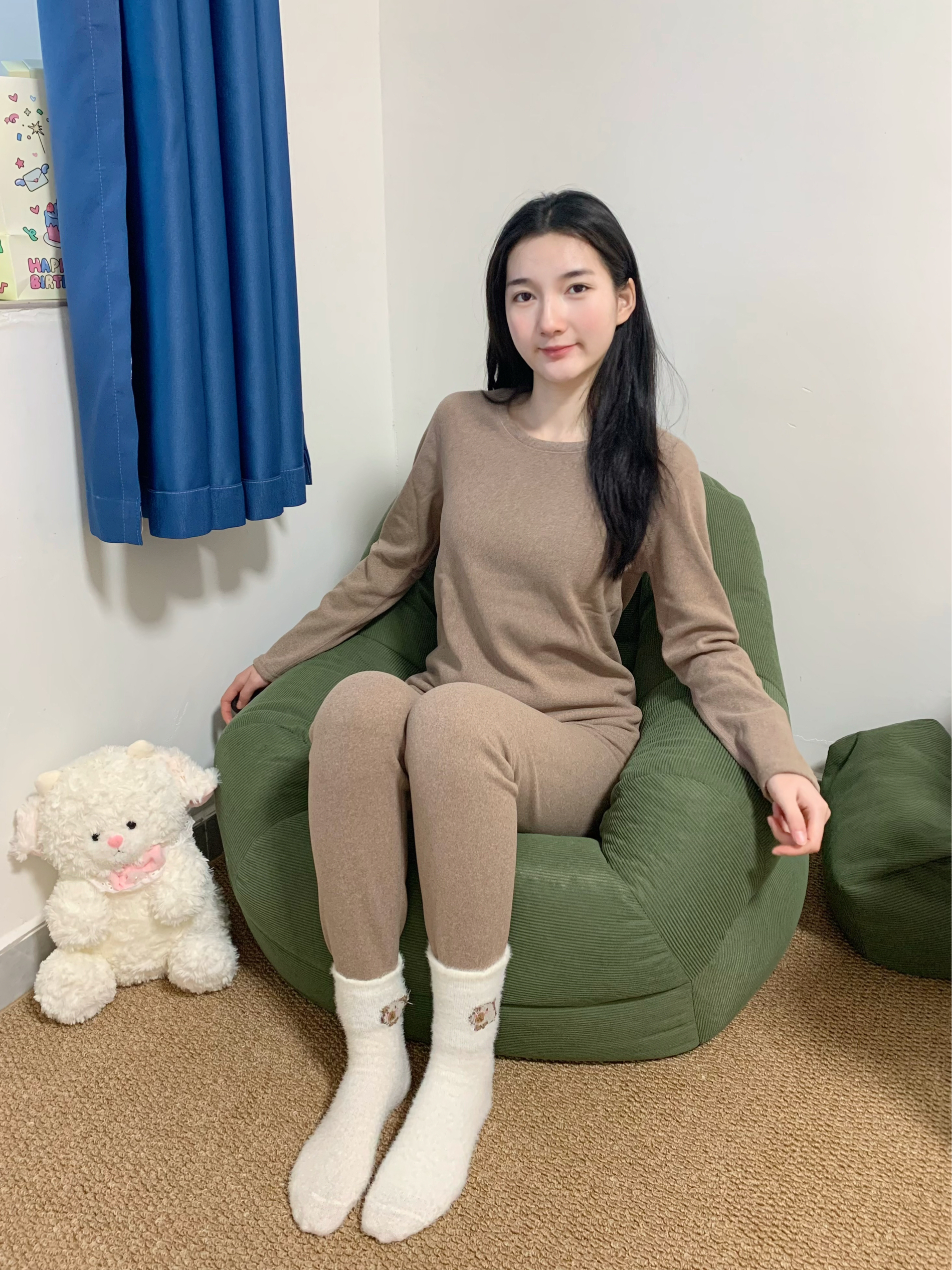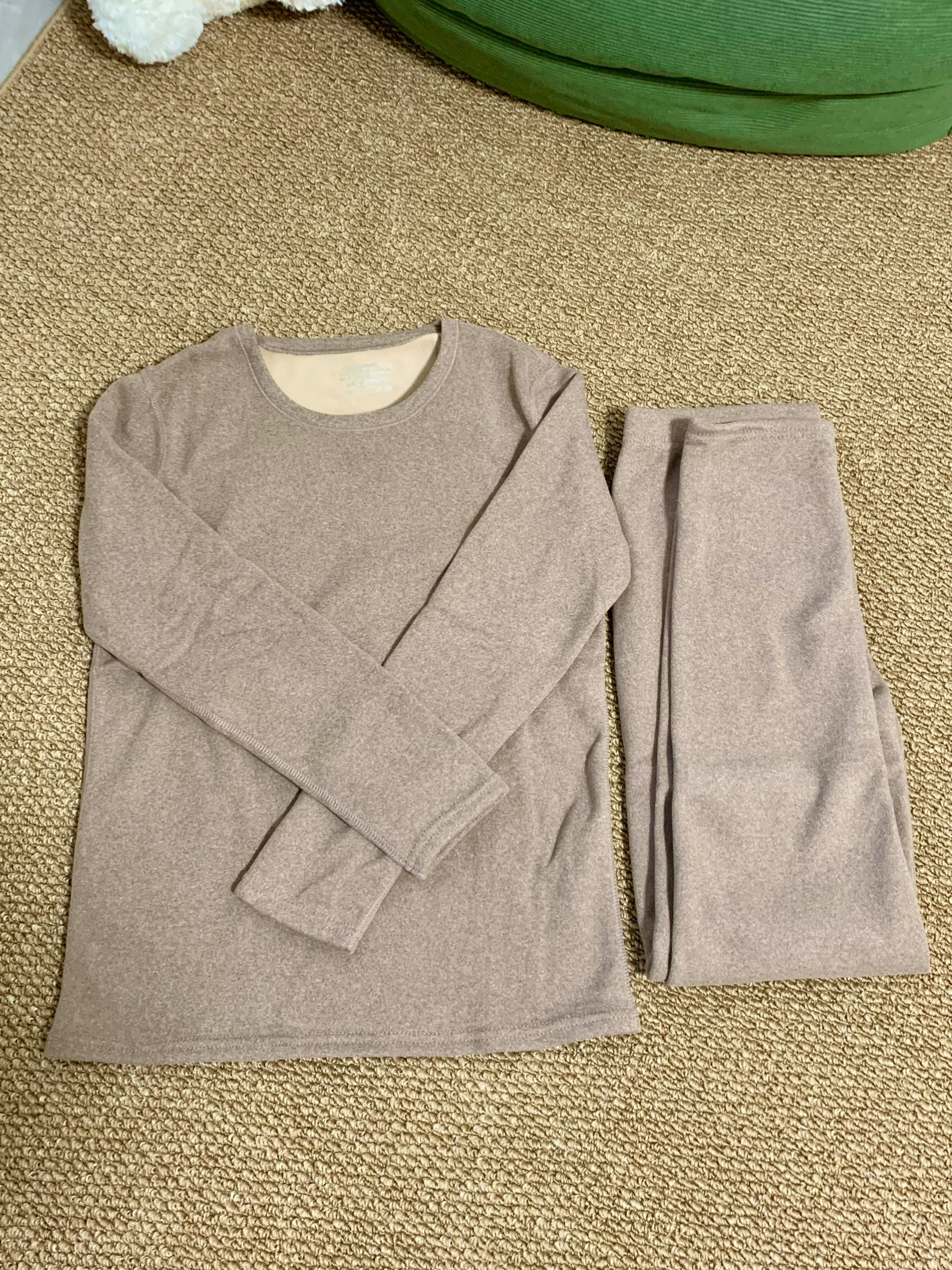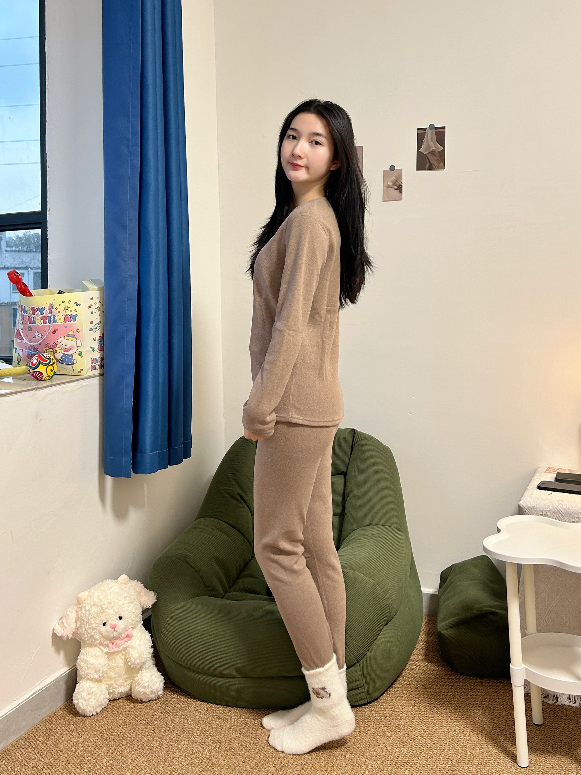 哈喽👋今天穿超暖和的保暖套装 里面是羊羔绒的 加绒加厚超级暖和❤️🔥 外面是磨毛质感 贴身穿巨舒服 弹力很大 又暖又不臃肿 圆领的设计 非常的百搭👍 居家单穿 当内搭都可以~ 我163/90斤穿的L码滴