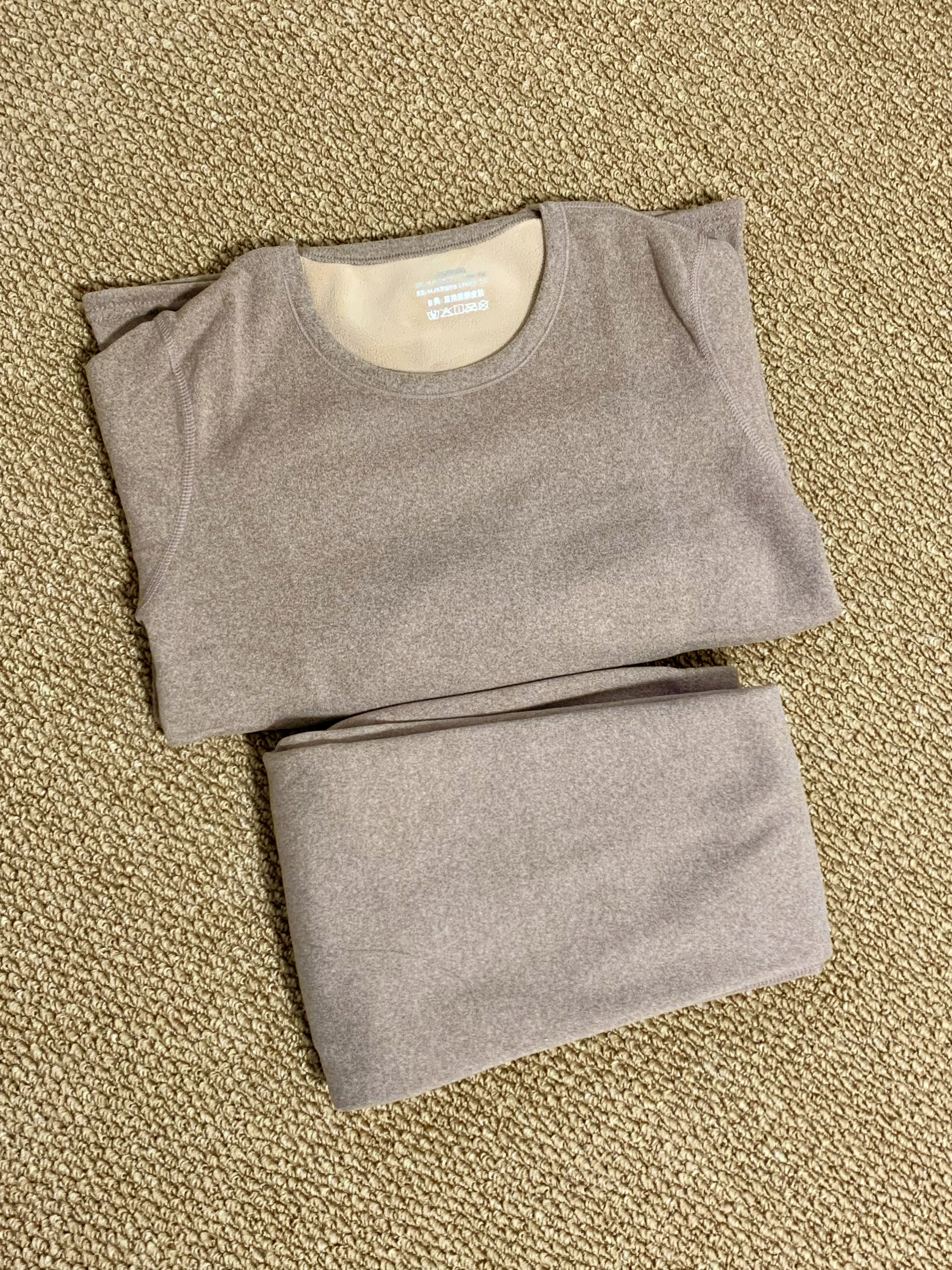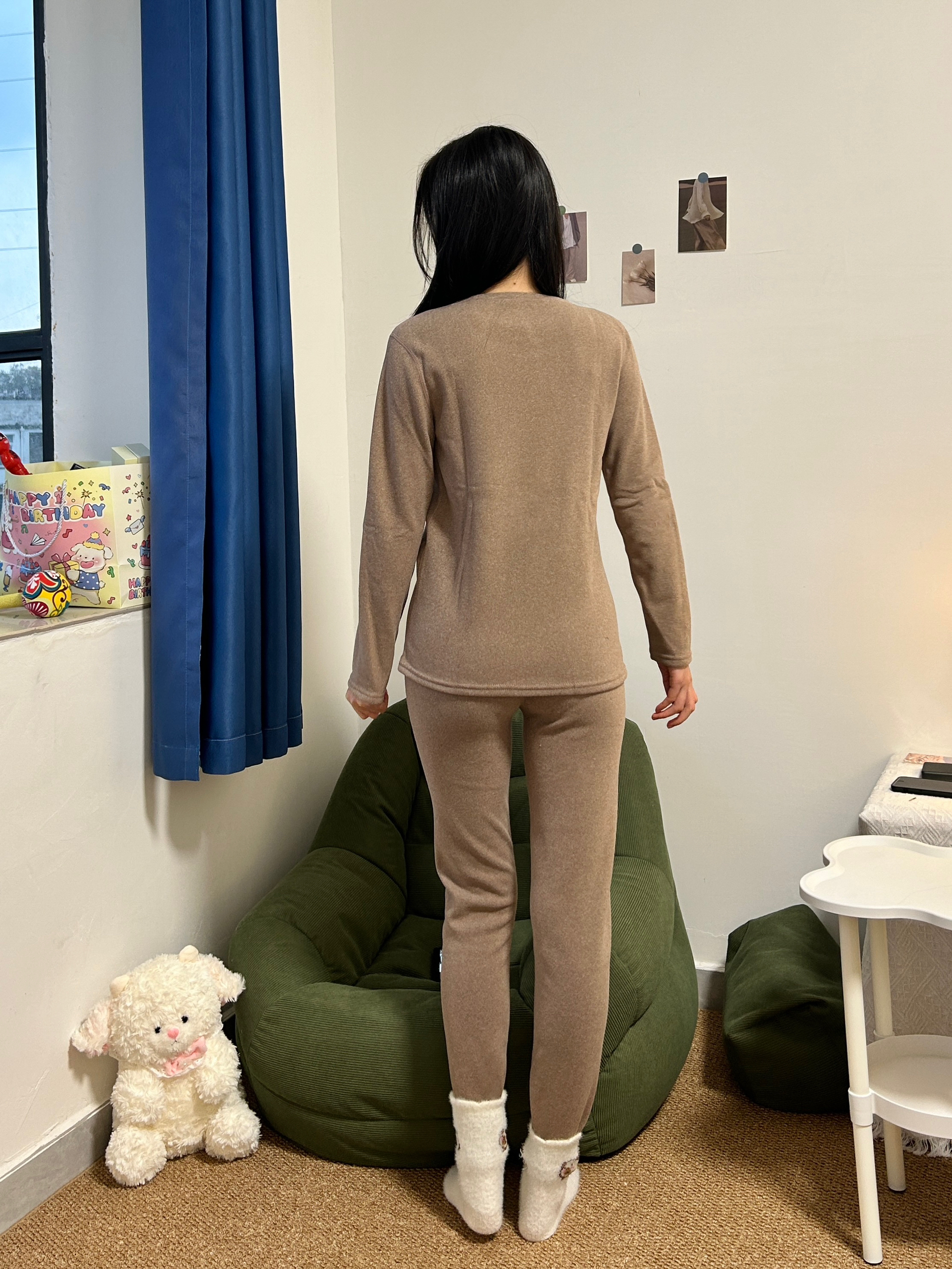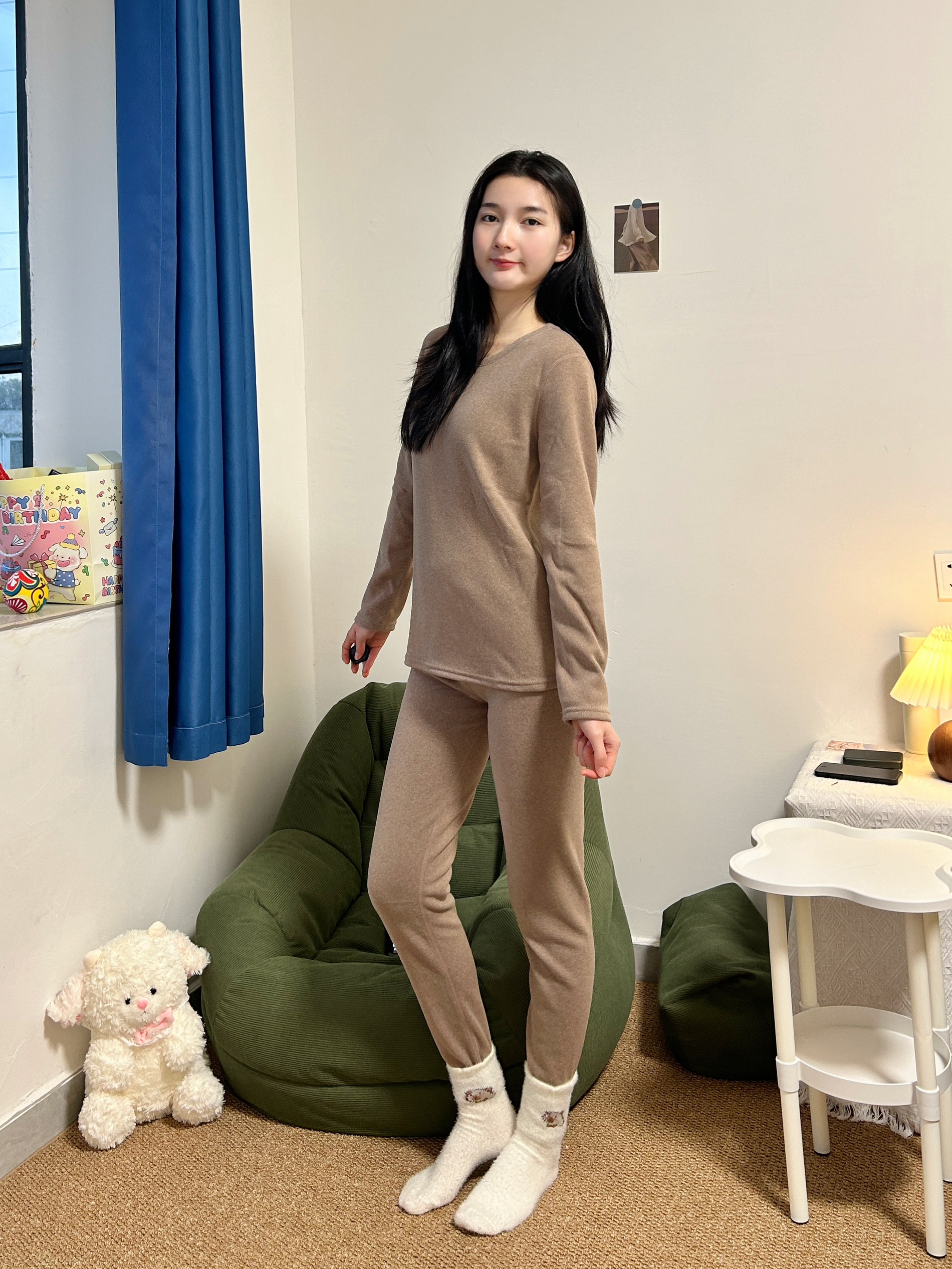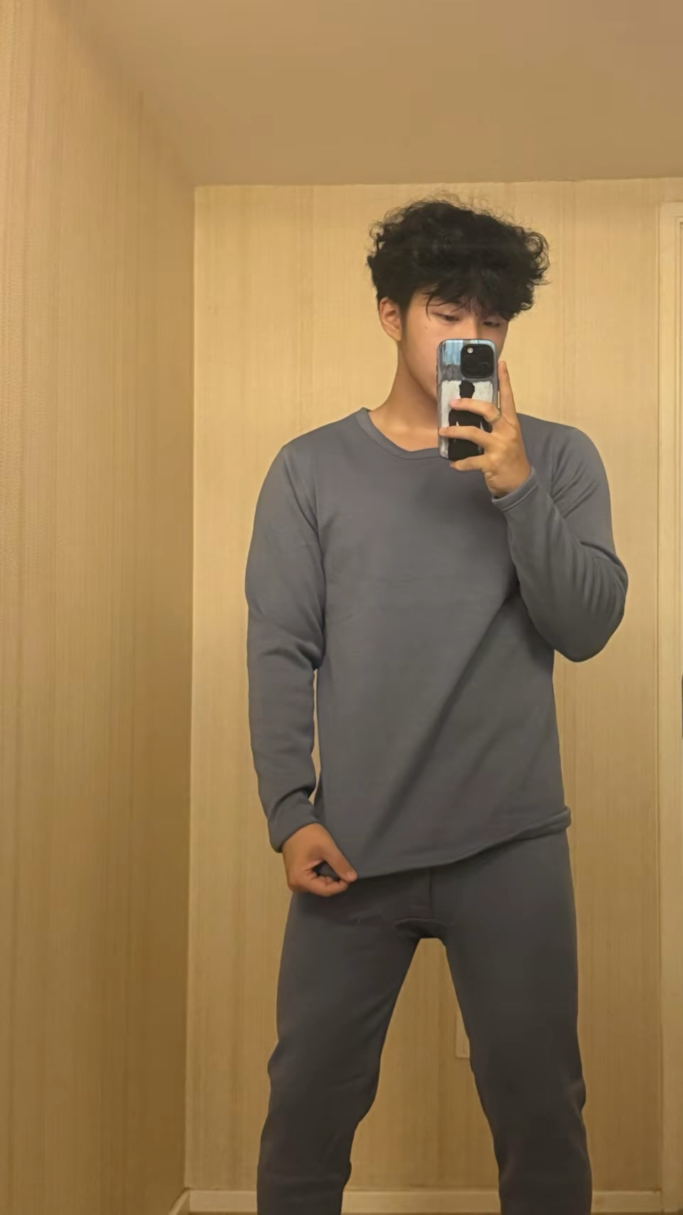 哈喽👋今天穿超暖和的保暖套装 里面是羊羔绒的 加绒加厚超级暖和❤️🔥 外面是磨毛质感 贴身穿巨舒服 弹力很大 又暖又不臃肿 圆领的设计 非常的百搭👍 居家单穿 当内搭都可以~ 我163/90斤穿的L码滴