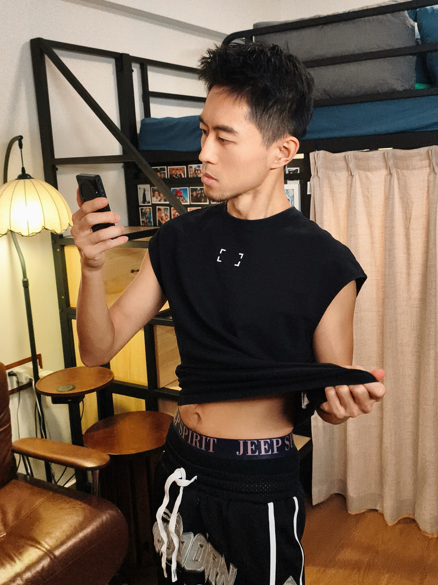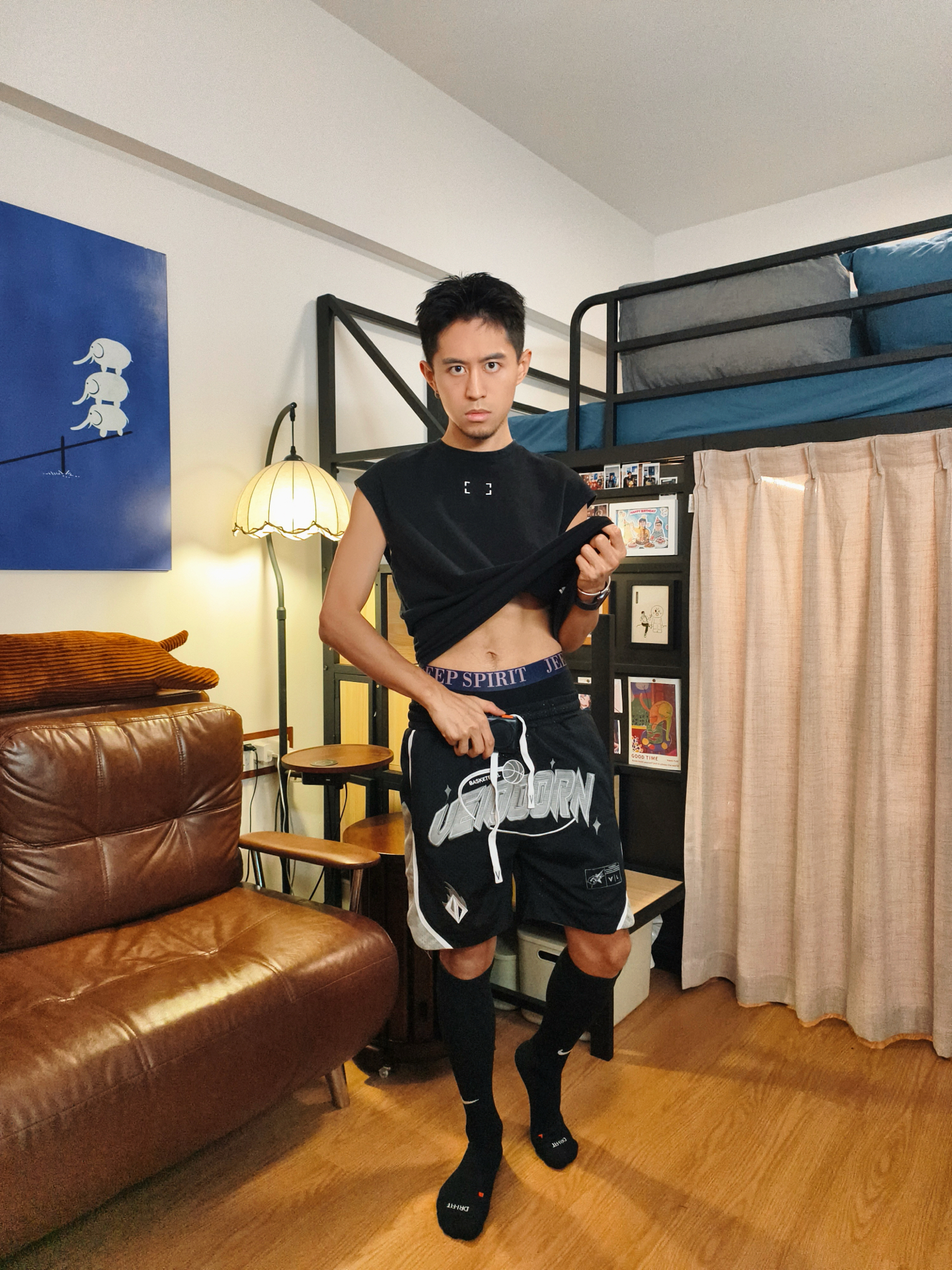 👕黑色无袖坎肩版型宽松随性,露肩设计自带清爽感,日常宅家或轻运动都不局促,随性又利落。 🩳拼色短裤的字母标识自带美式氛围,网眼面料透气度在线,活动起来完全无束缚,实用和颜值双拿捏。 🧦黑色足球袜贴合度刚好,和整套黑调穿搭适配度拉满,运动利落感一下就有了。 🩲内搭的JEEP SPIRIT平角裤是隐藏加分项——腰头标识低调显质感,面料亲肤透气,作为内搭贴合不勒,细节舒适感直接拉满✔️ – #高颜...