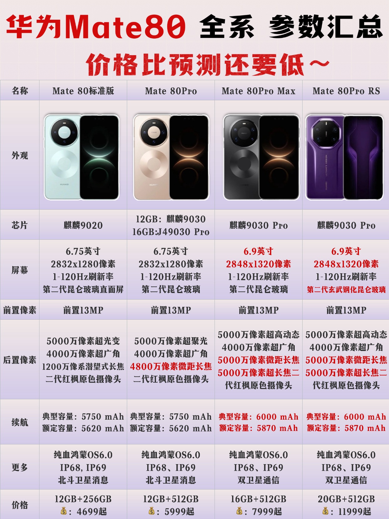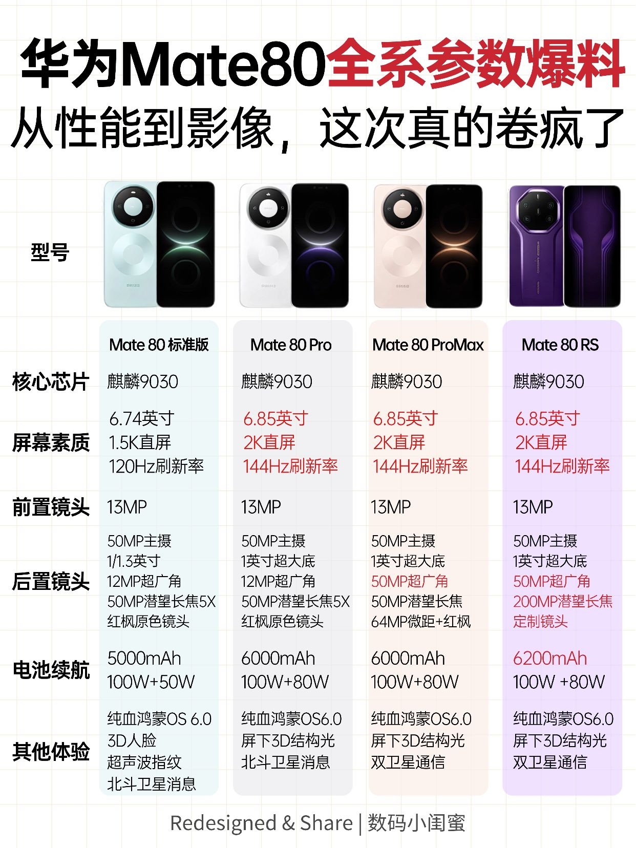 📱华为Mate80系列参数爆料前瞻! 麒麟9030+纯血鸿蒙6.0到底有多强? 四款机型怎么选?看完这篇你就懂了✨ 华为即将在11月25日发布的Mate80全系机型,这次能不能还是「遥遥领先」?提前给大家把新机爆料参数整理清楚!让大家参考参考 ▫️ Mate 80 👉🏻6.69英寸直屏回归,握持舒服,单手操作 👉🏻麒麟9030芯片+纯血鸿蒙6.0,系统流畅 👉🏻5800mAh大电池➕88W...