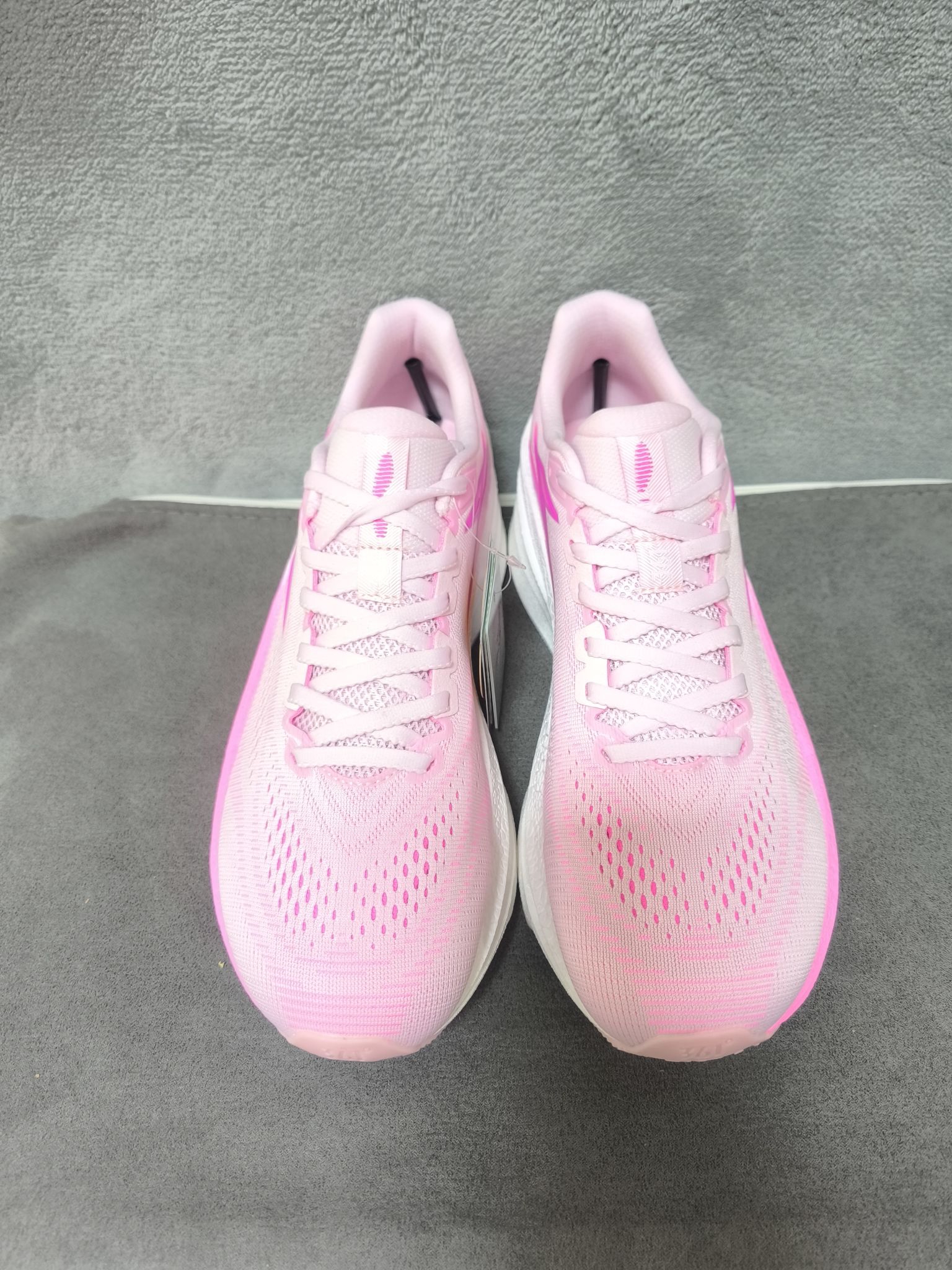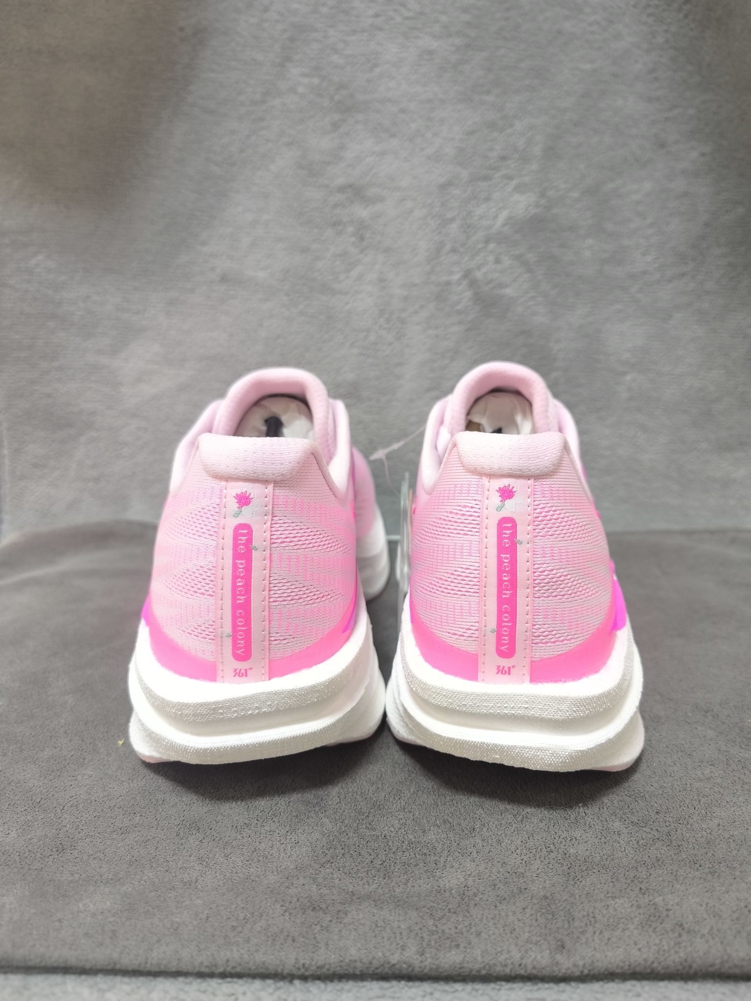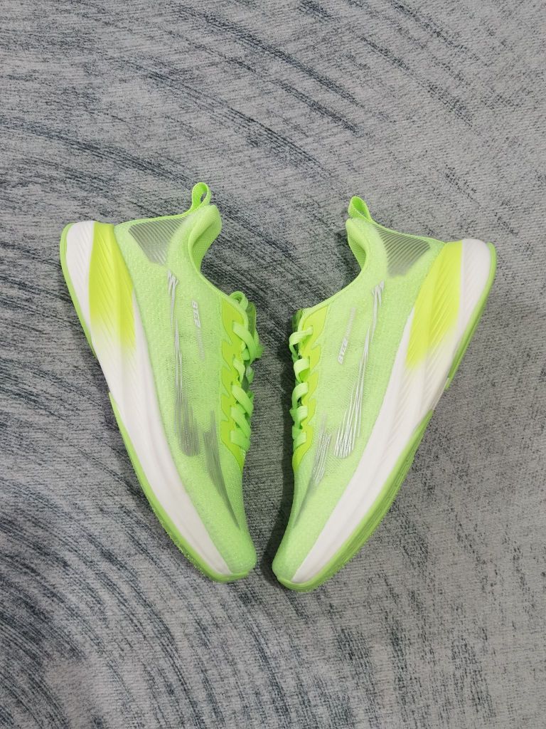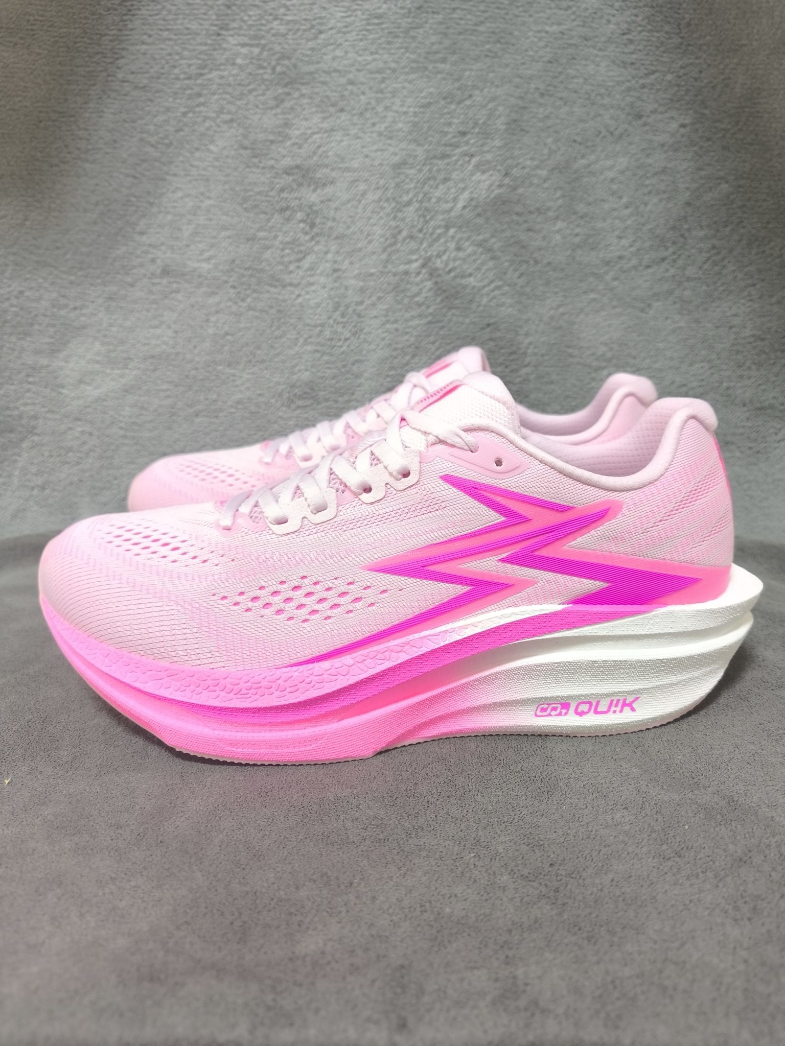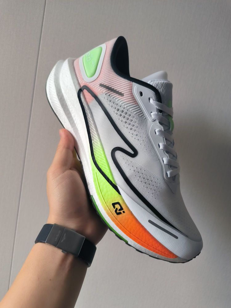 361°飞燃4.5mix,桃花韵配色,运用了,粉色白色的搭配,有一种很清新的感觉,鞋身很轻,中底有一块大碳板,刚性十足,搭配很好的缓震,真的很无敌,300价位就选它!