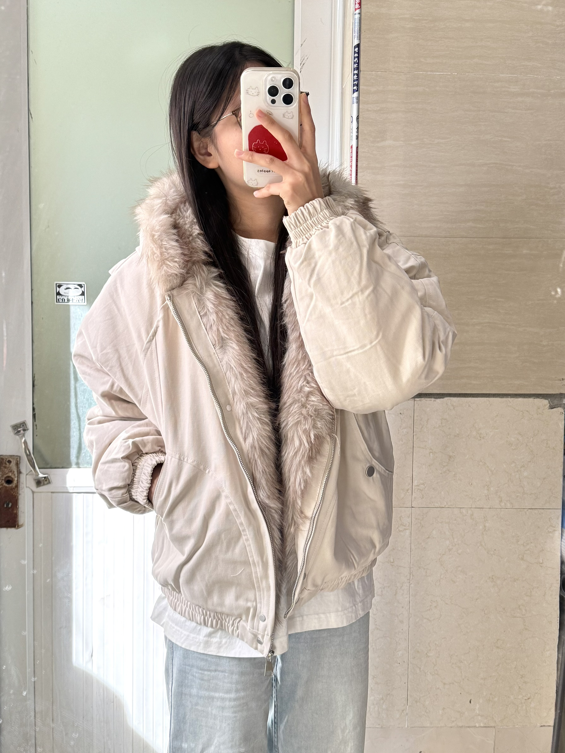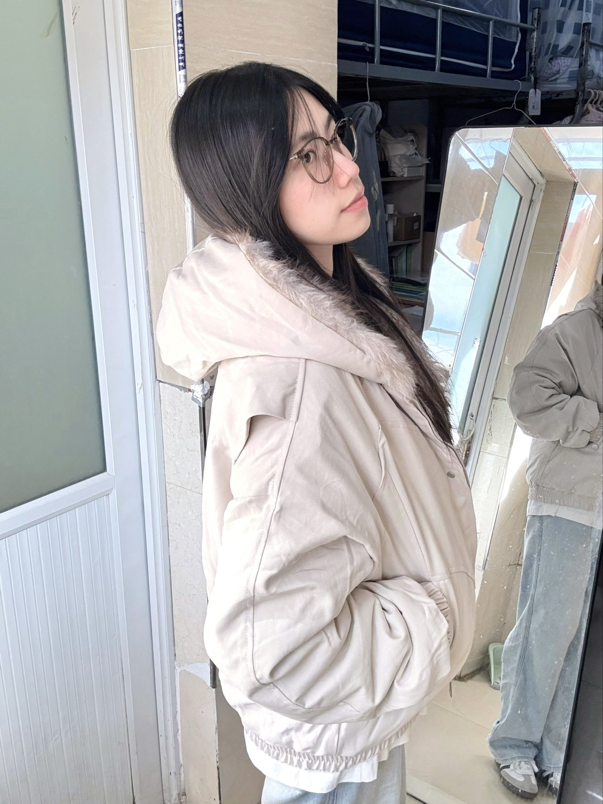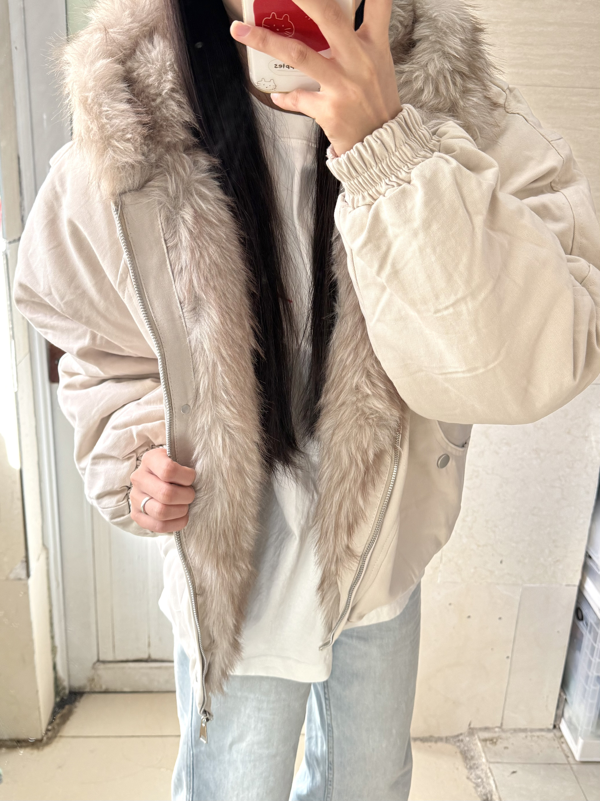 166 102穿的是M码 衣服内里也做了一圈毛领 把拉链扣开穿 也会显得很有层次感 而且帽子里面都是毛 上身暖和的不行!!!喜欢的宝宝可以参考一下哦