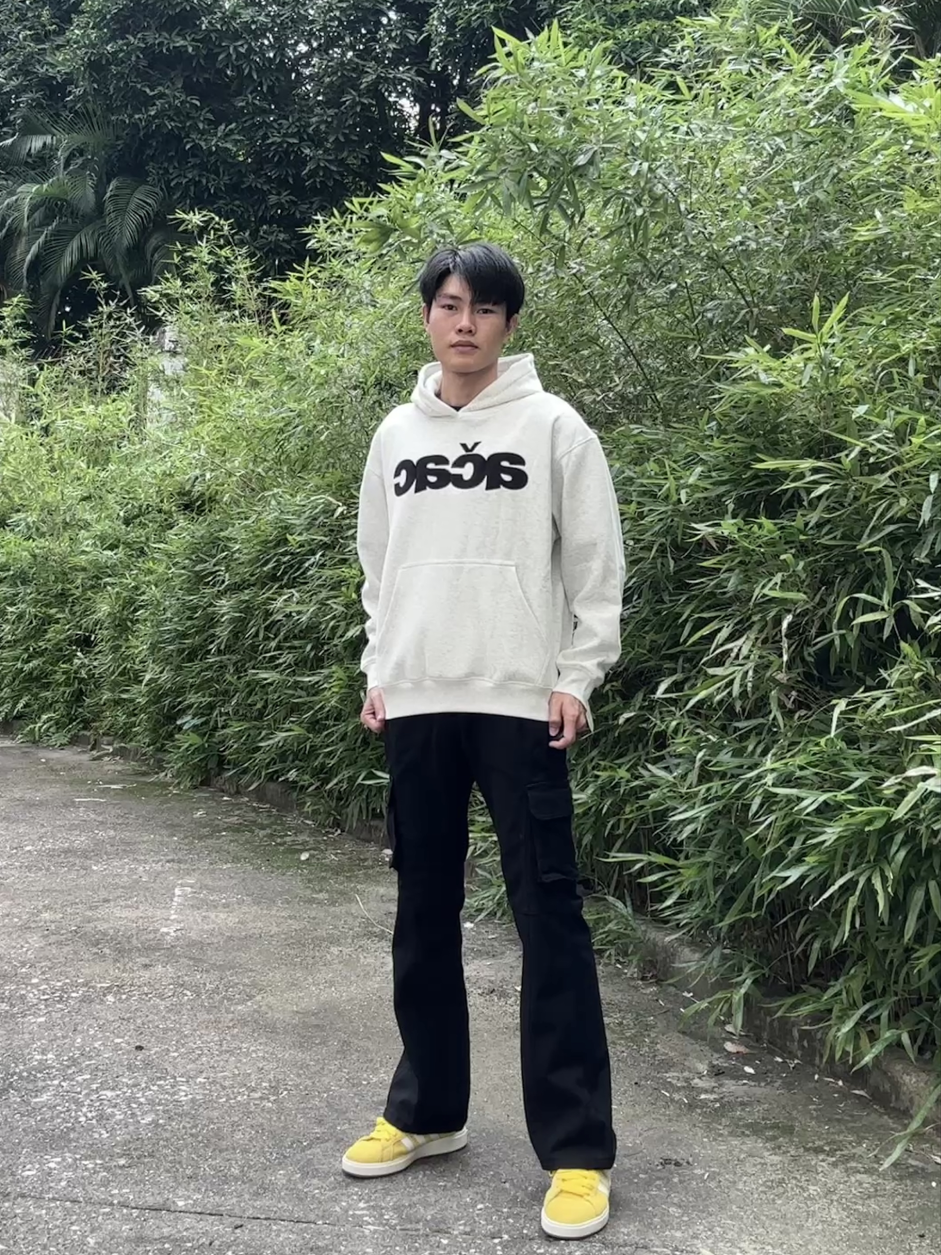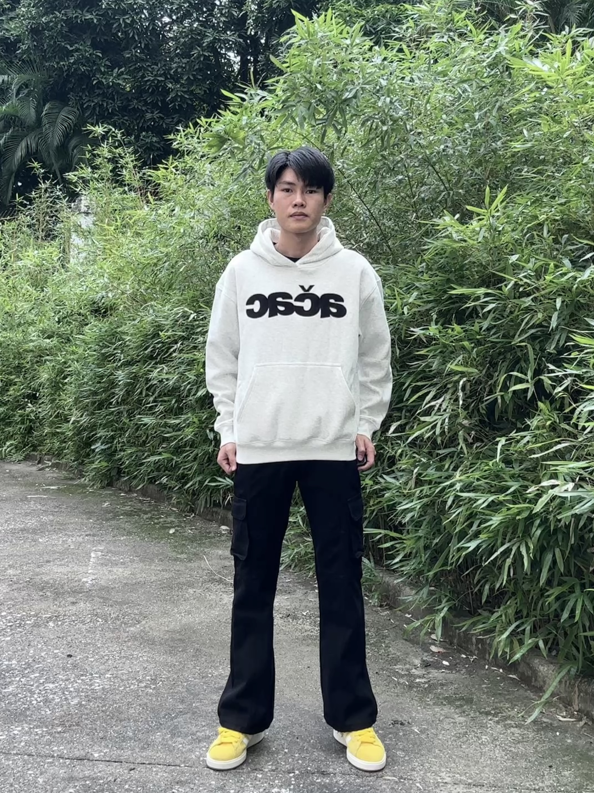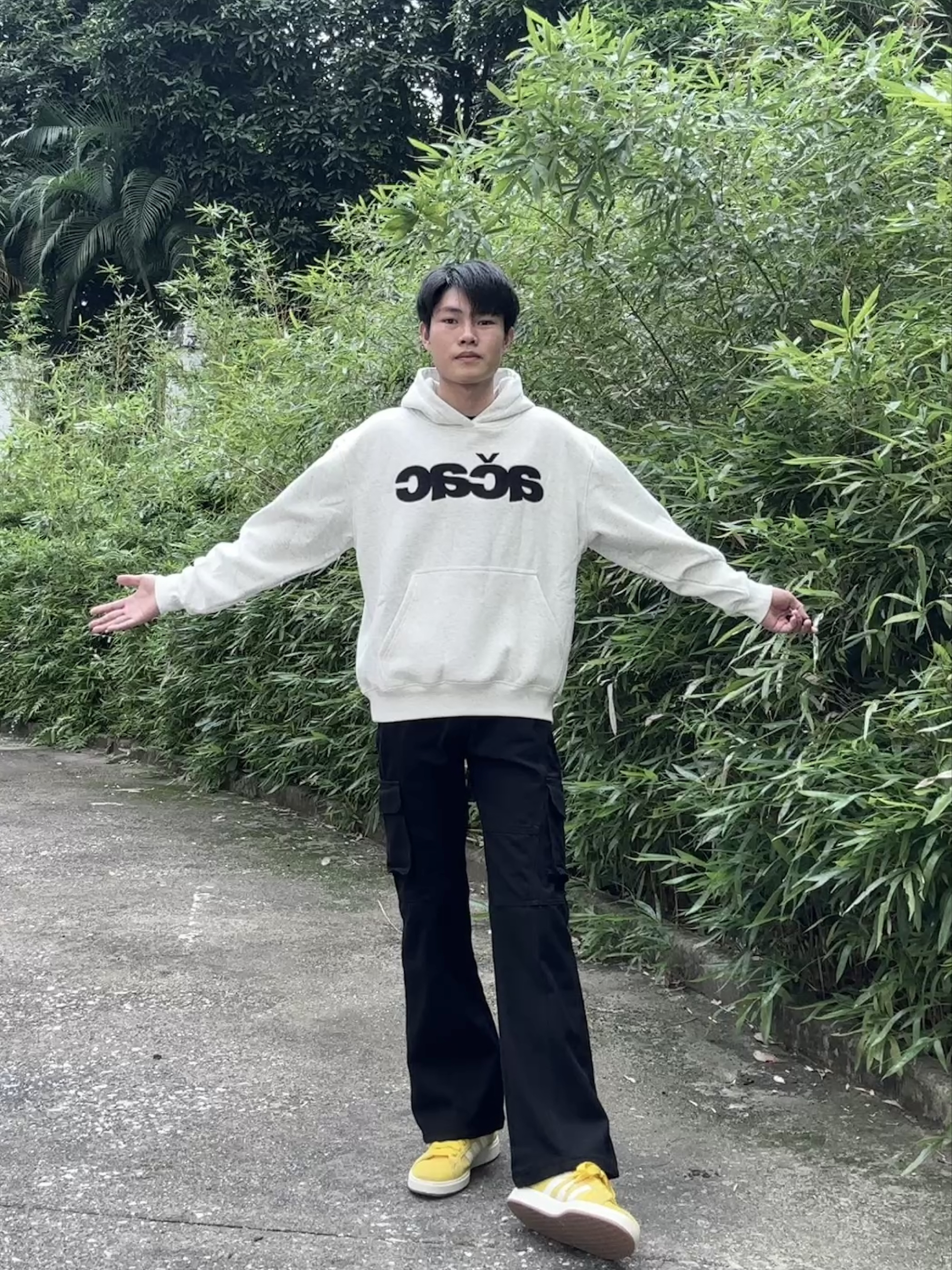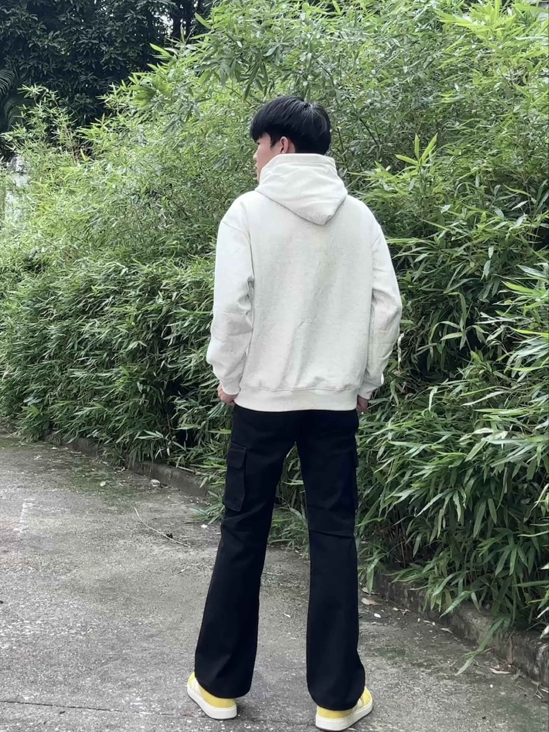👔:搭配一件浅灰色连帽卫衣 👖:搭配一条黑色的多口袋的工装牛仔裤黑色工装牛仔裤修身好看显腿长,和卫衣搭配利落又协调,秋冬穿保暖还干净,通勤休闲都能搭