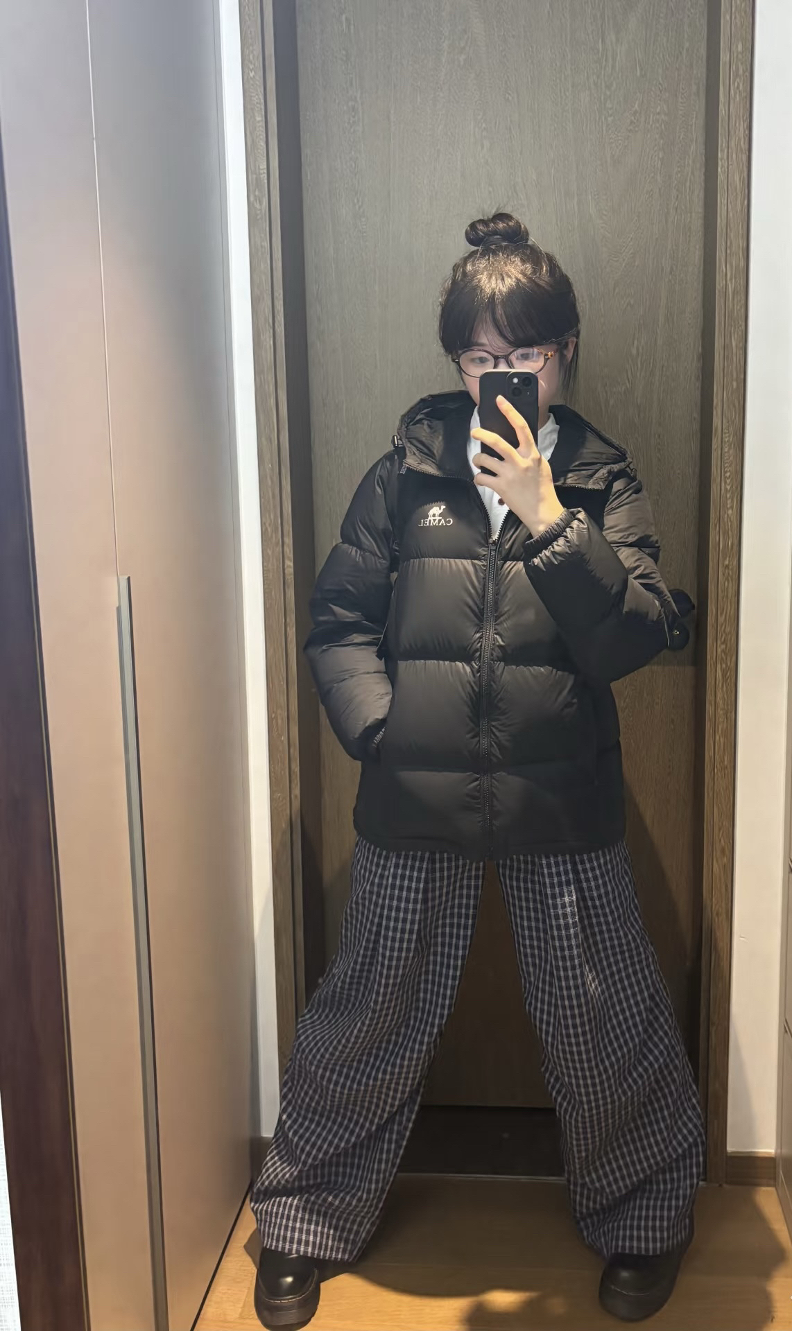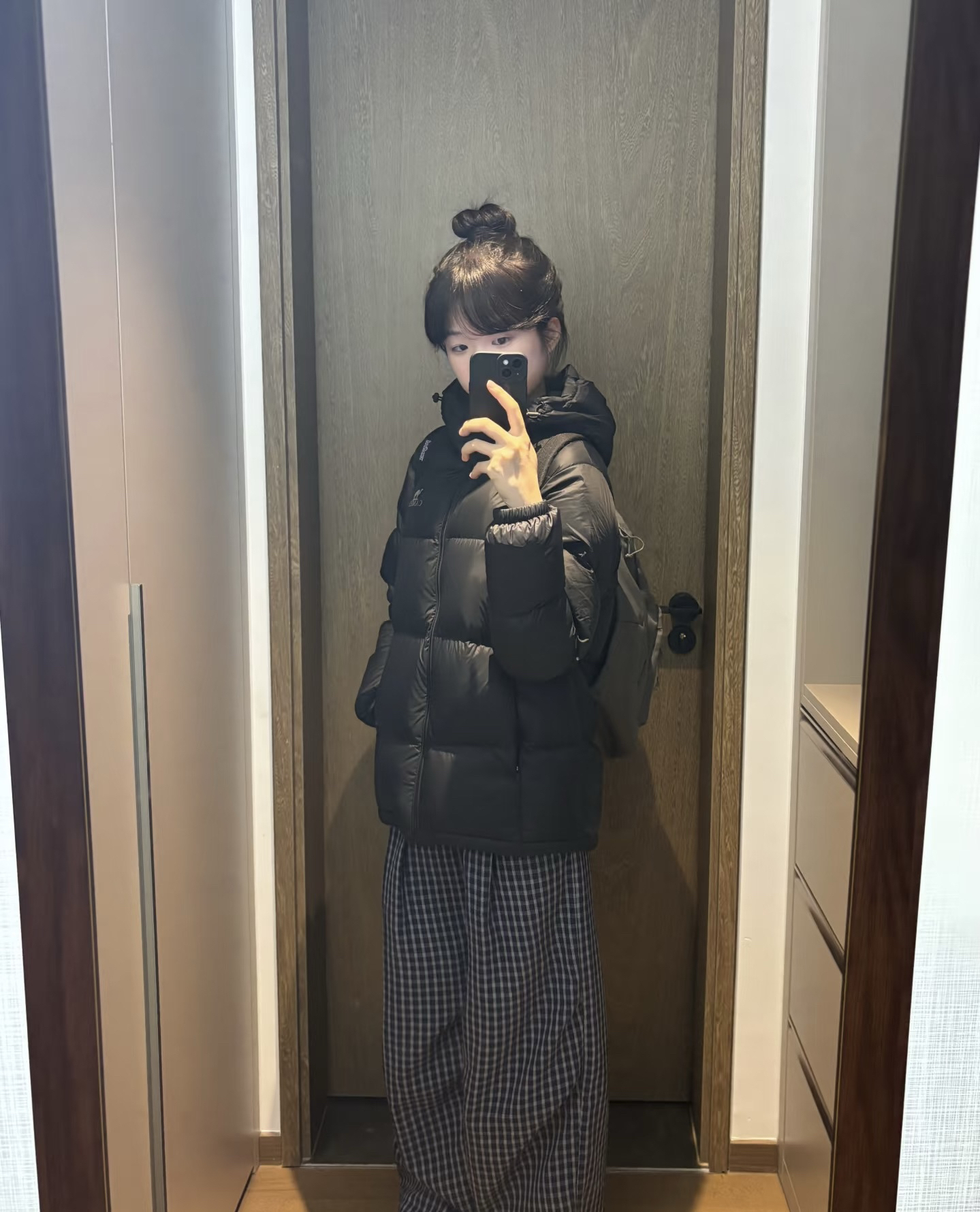 黑色短款连帽面包羽绒服➕花灰腰头撞色休闲卫裤 好喜欢这种简单休闲的感觉~