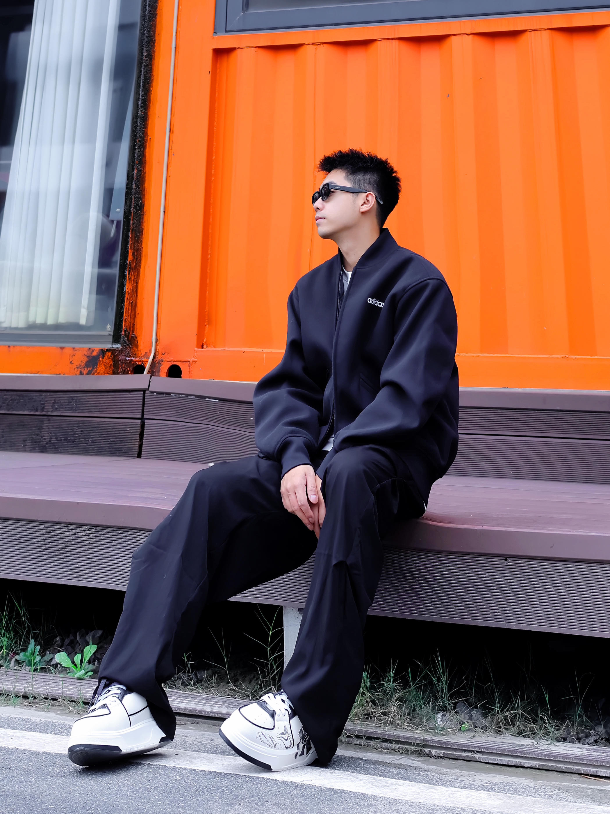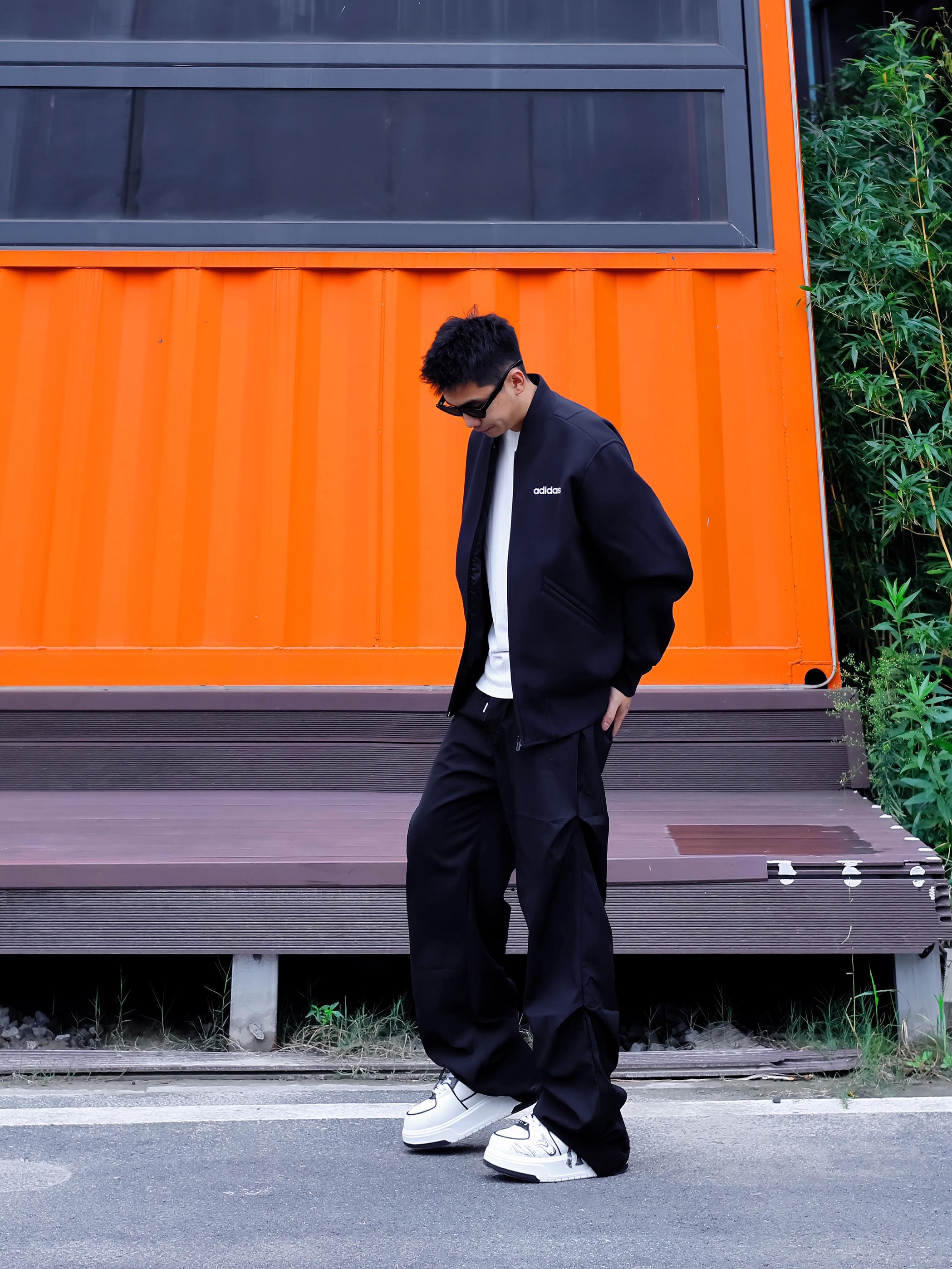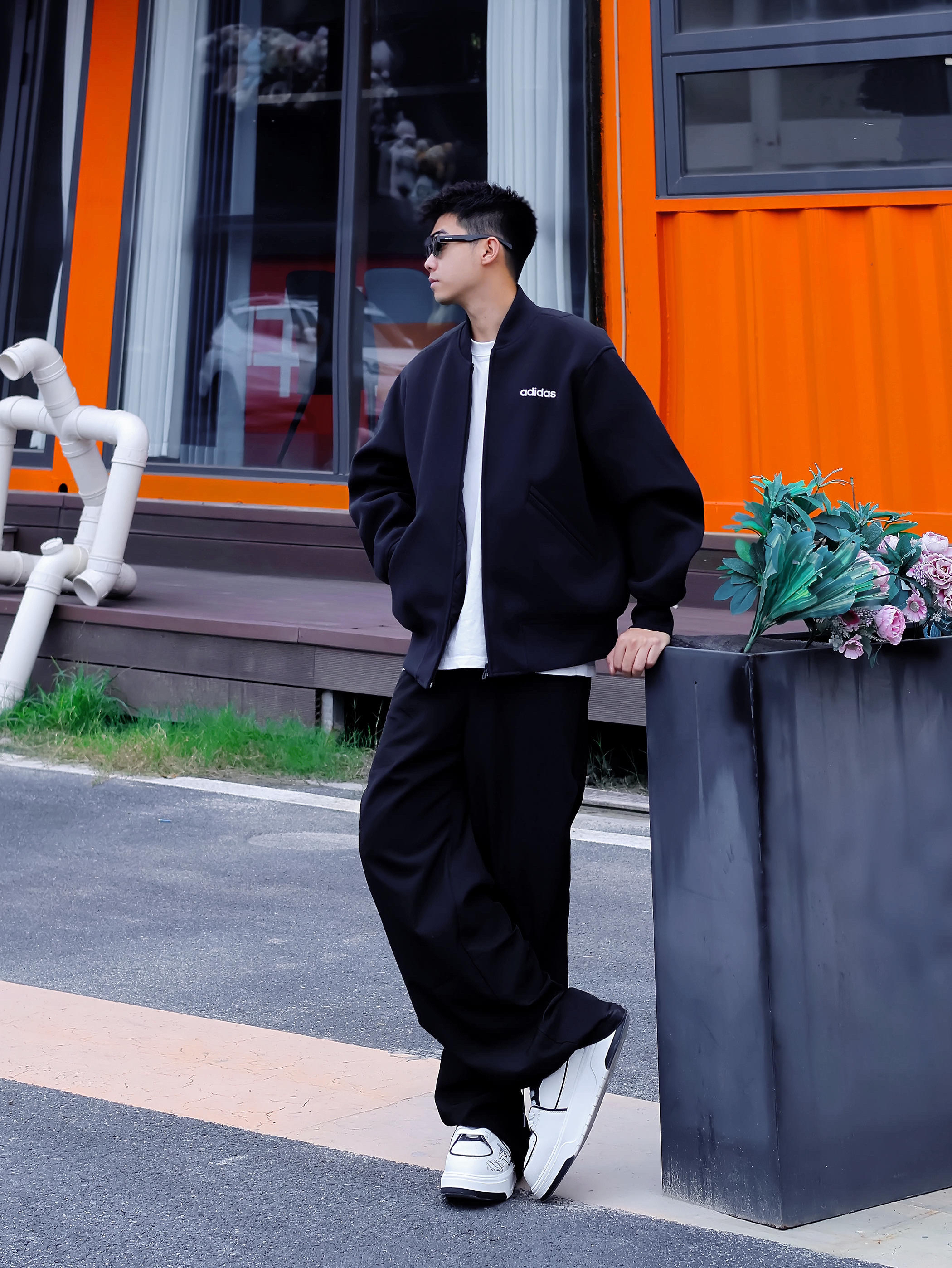今天给大家分享一套都市先锋主义vibe穿搭 上身选择一件黑色短款adidas夹克外套 ☘️ 内搭一件白色上衣作为点缀 下身搭配同色系休闲裤 上脚一双mlb 白灰板鞋 简约大气的质感尊滴爱 这样一套都市先锋主义vibe真的帅