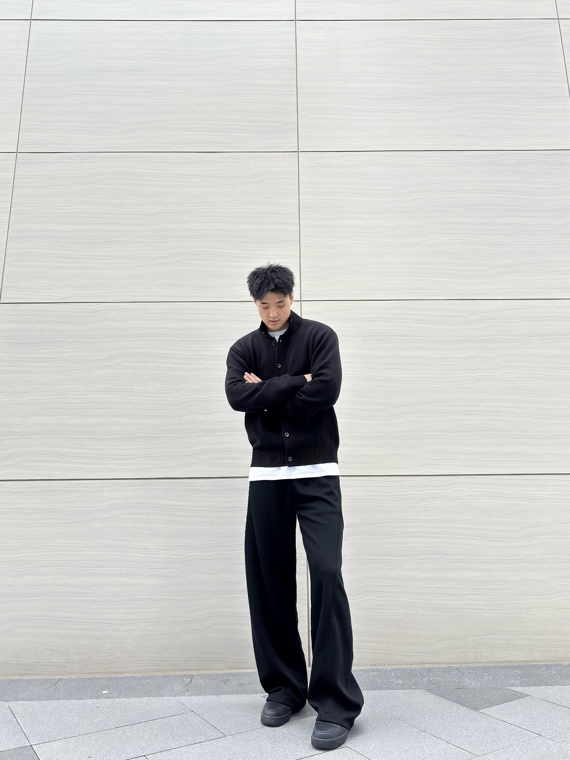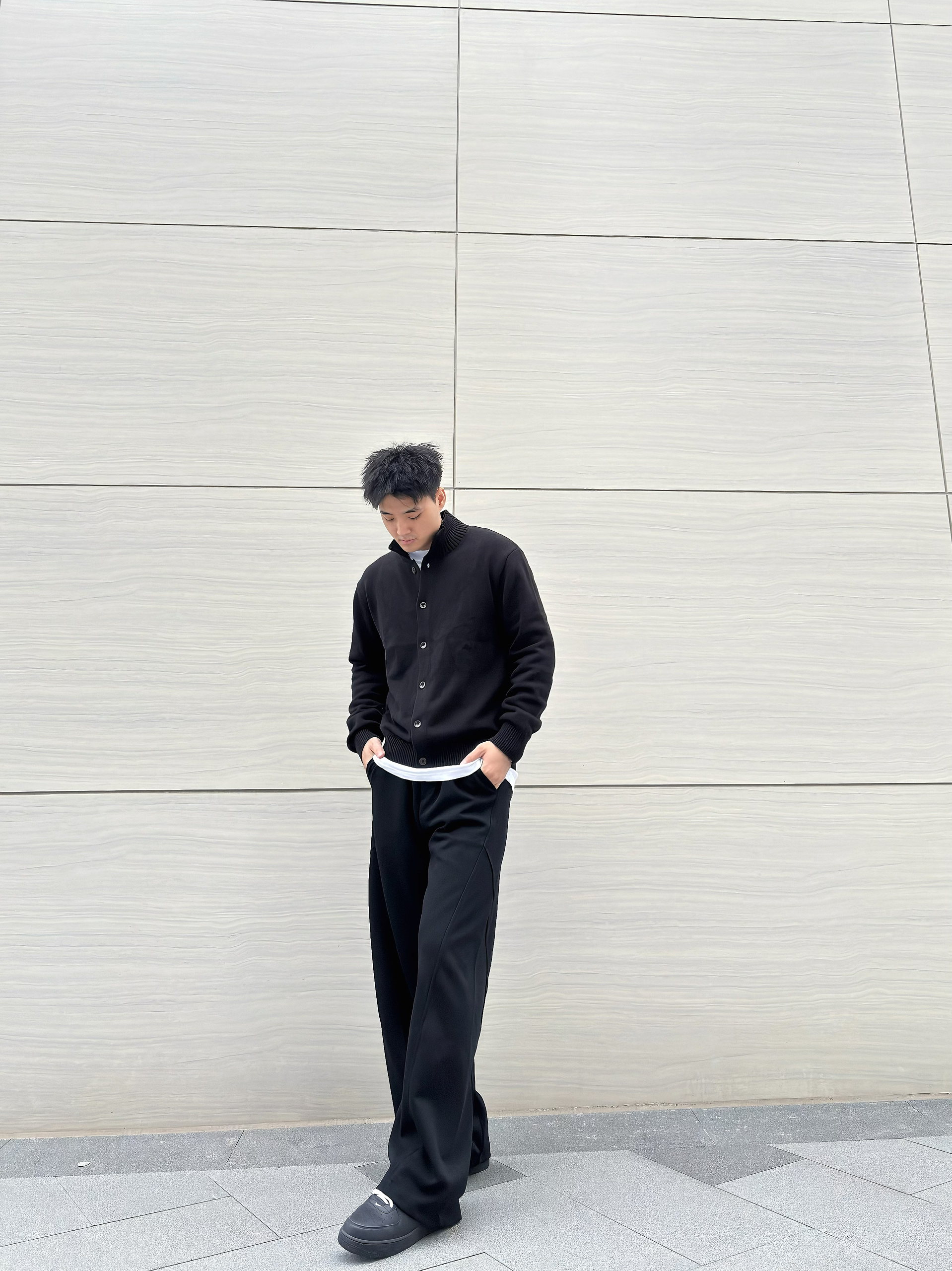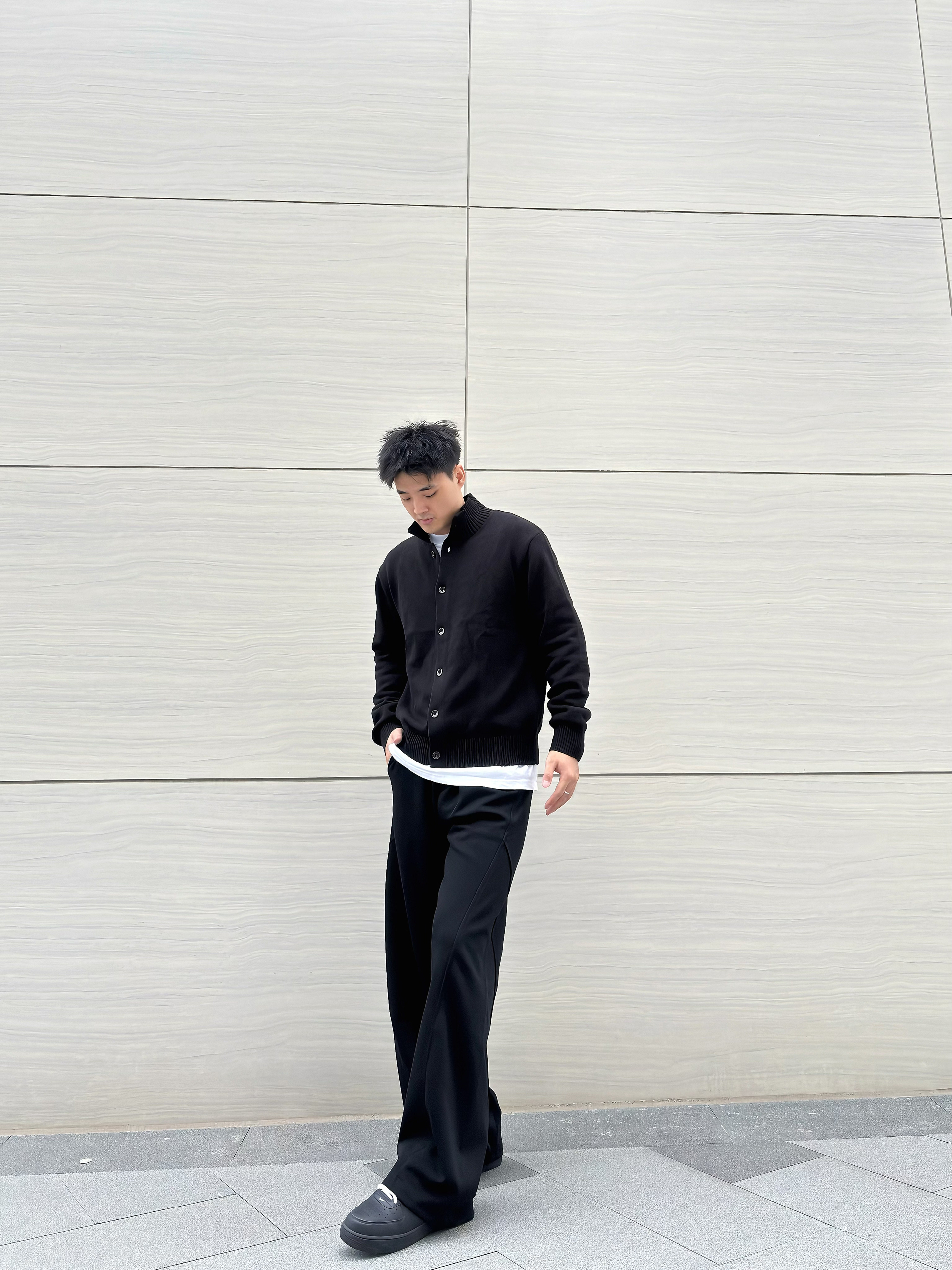 谁说男生穿搭一定要花里胡哨?一身黑也能穿出高级感拉满的松弛氛围~ 立领针织开衫简约又有质感,内搭白T做层次,再配上垂坠感爆棚的阔腿西裤,脚踩厚底鞋悄悄增高还显腿长! 这种不费力的极简风格,日常出街或通勤都很绝,主打一个随性又高级的穿搭小心机~
