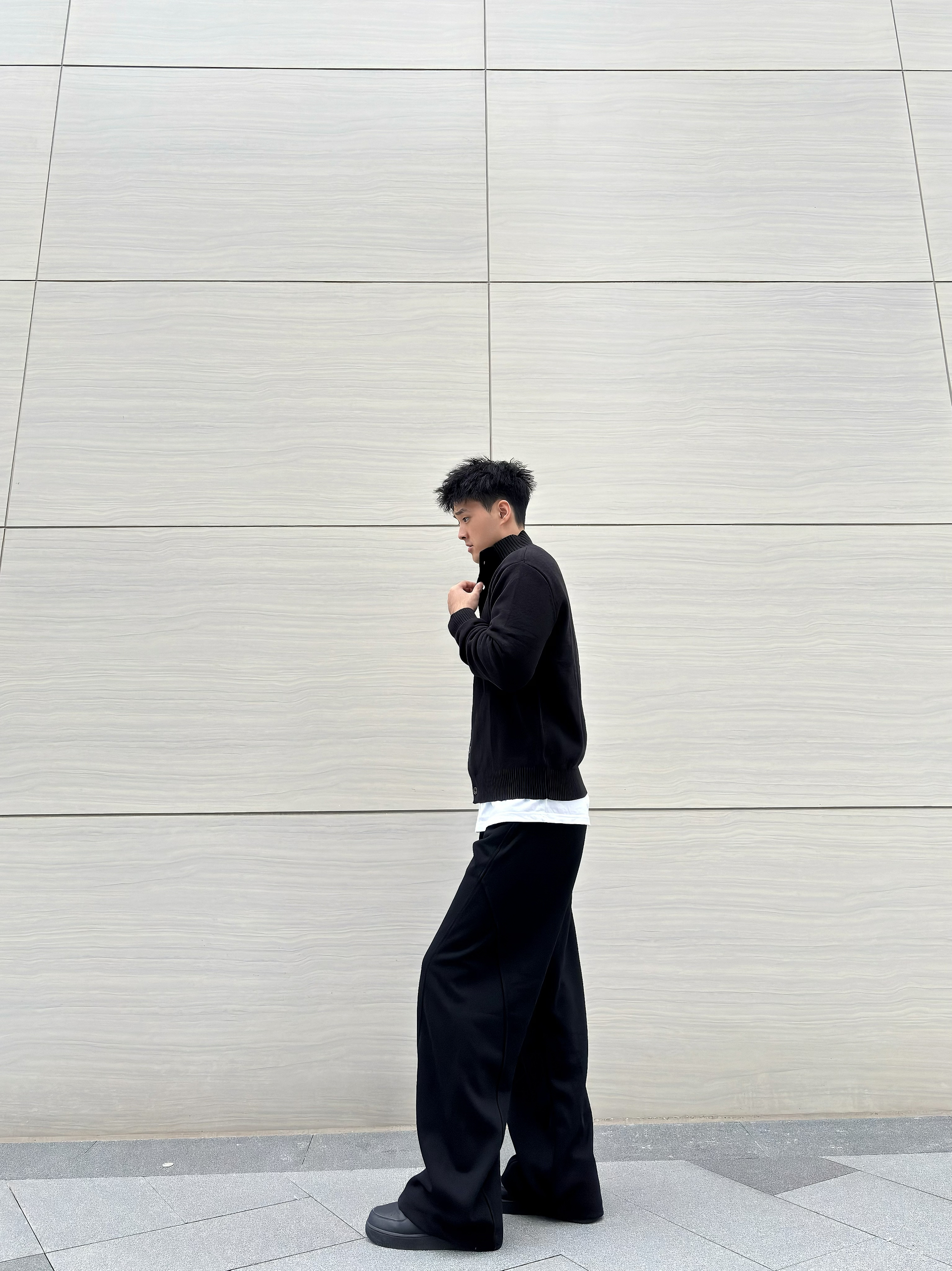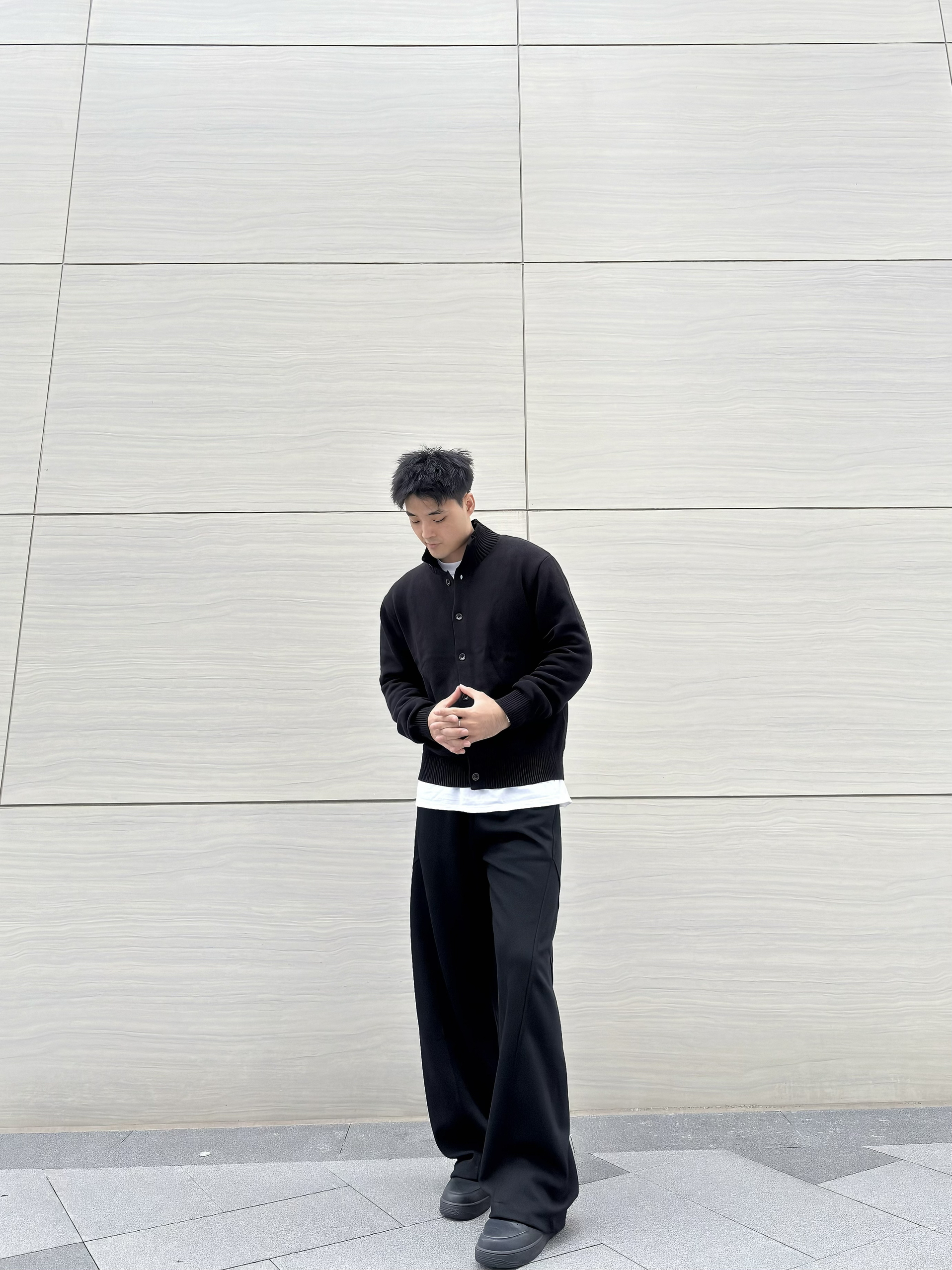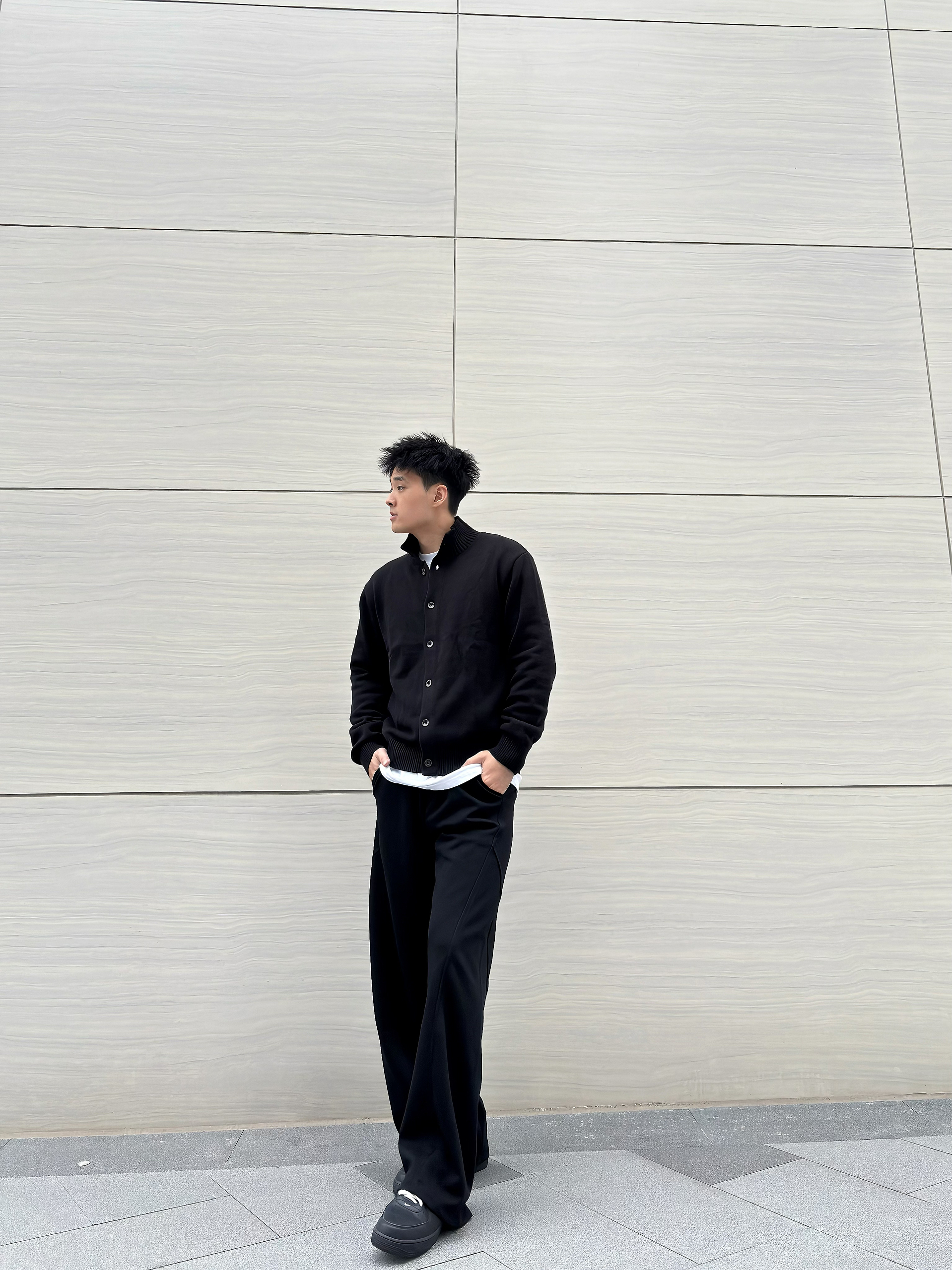 谁说男生穿搭一定要花里胡哨?一身黑也能穿出高级感拉满的松弛氛围~ 立领针织开衫简约又有质感,内搭白T做层次,再配上垂坠感爆棚的阔腿西裤,脚踩厚底鞋悄悄增高还显腿长! 这种不费力的极简风格,日常出街或通勤都很绝,主打一个随性又高级的穿搭小心机~