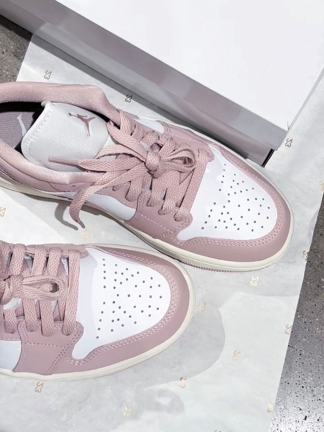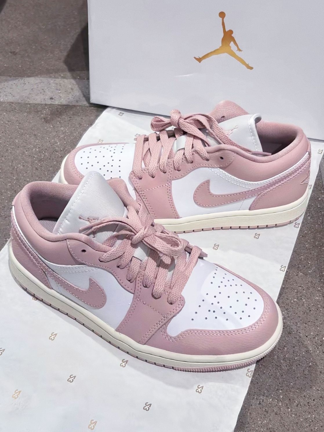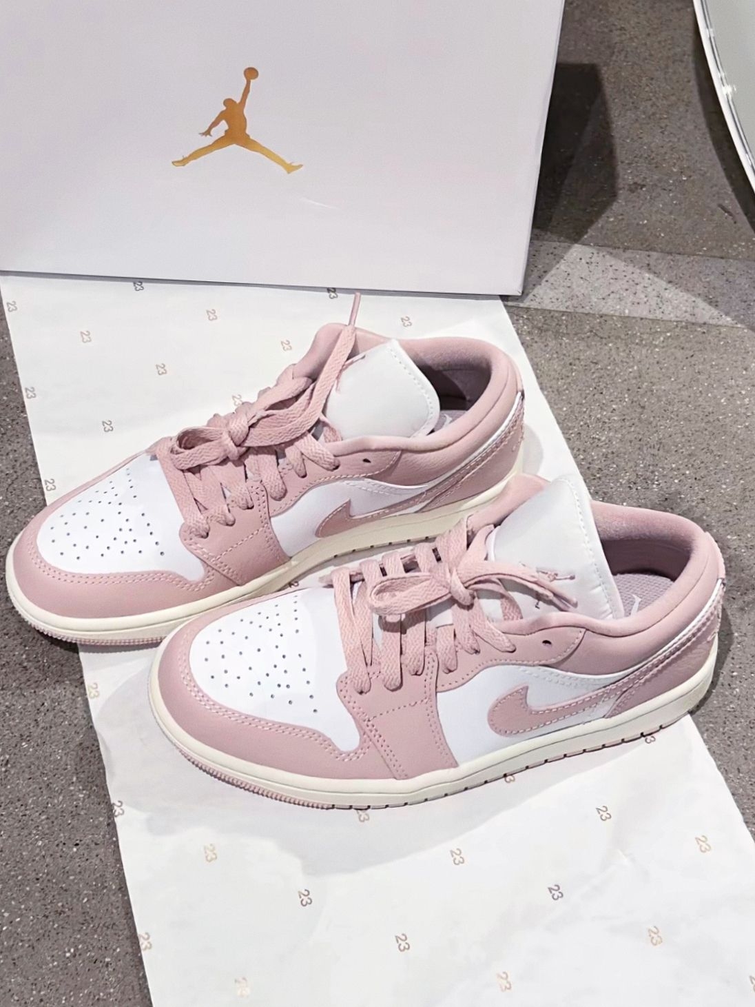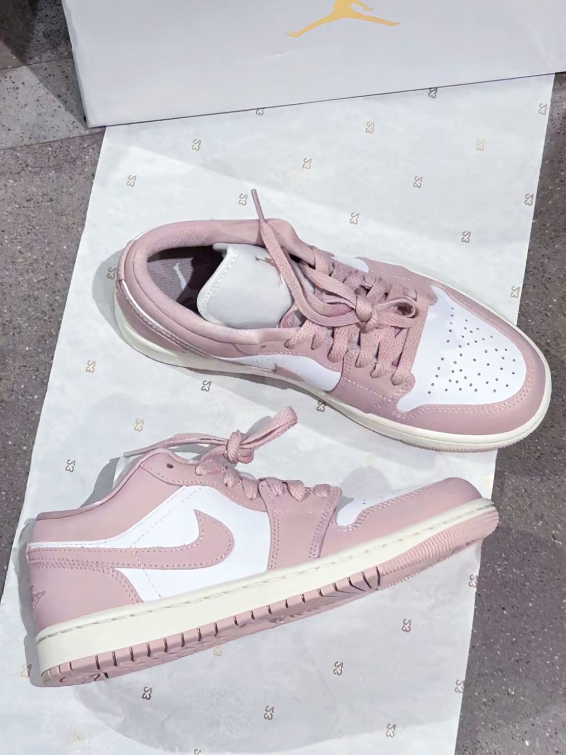 浅粉+奶白的配色像把淡樱花揉进了鞋子里,低饱和调调温柔到发光,配浅蓝牛仔裤是清爽日系感,搭连衣裙秒变甜妹,低帮鞋型完全不压个子,矮个子也能轻松驾驭,软皮革摸起来舒服,鞋头的透气孔,穿上也不闷脚,后跟的翅膀刺绣和鞋盒的金色飞人标,细节里全是精致感 缺点就是浅色系容易脏,一定要定时打理,不然灰尘积攒多了到了后面特别难清洗