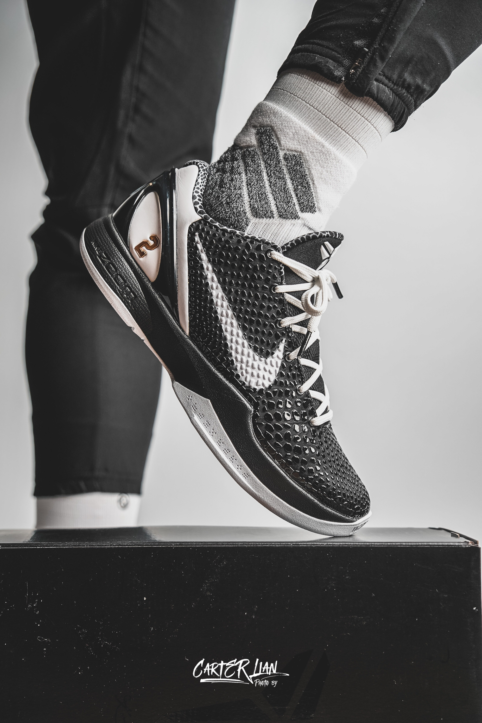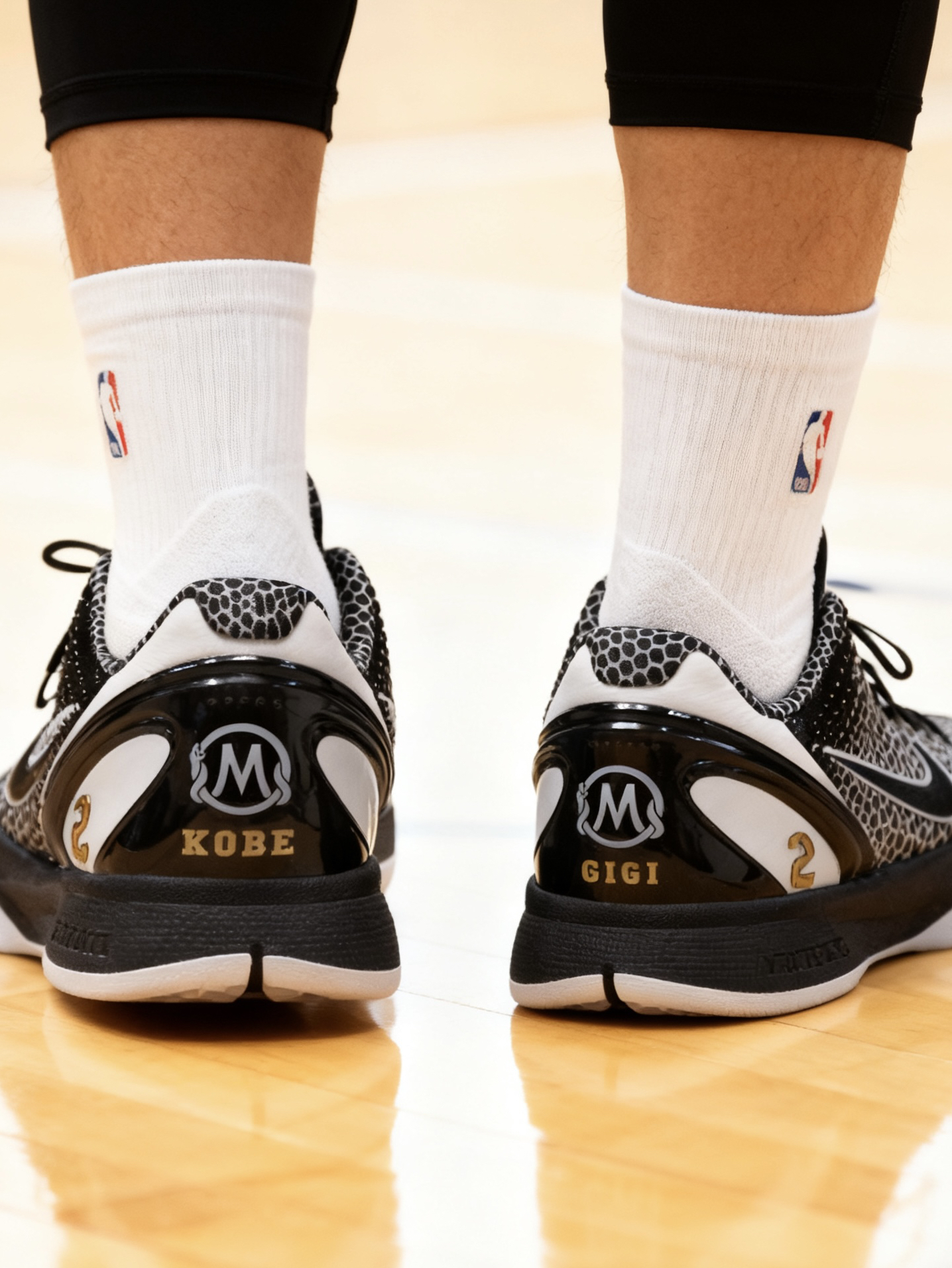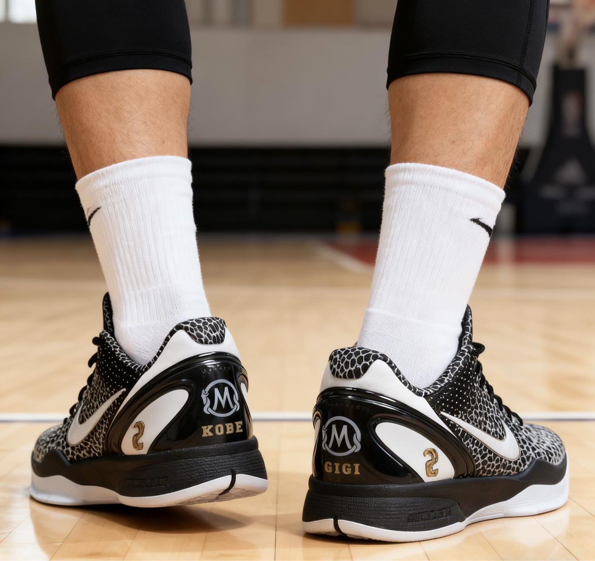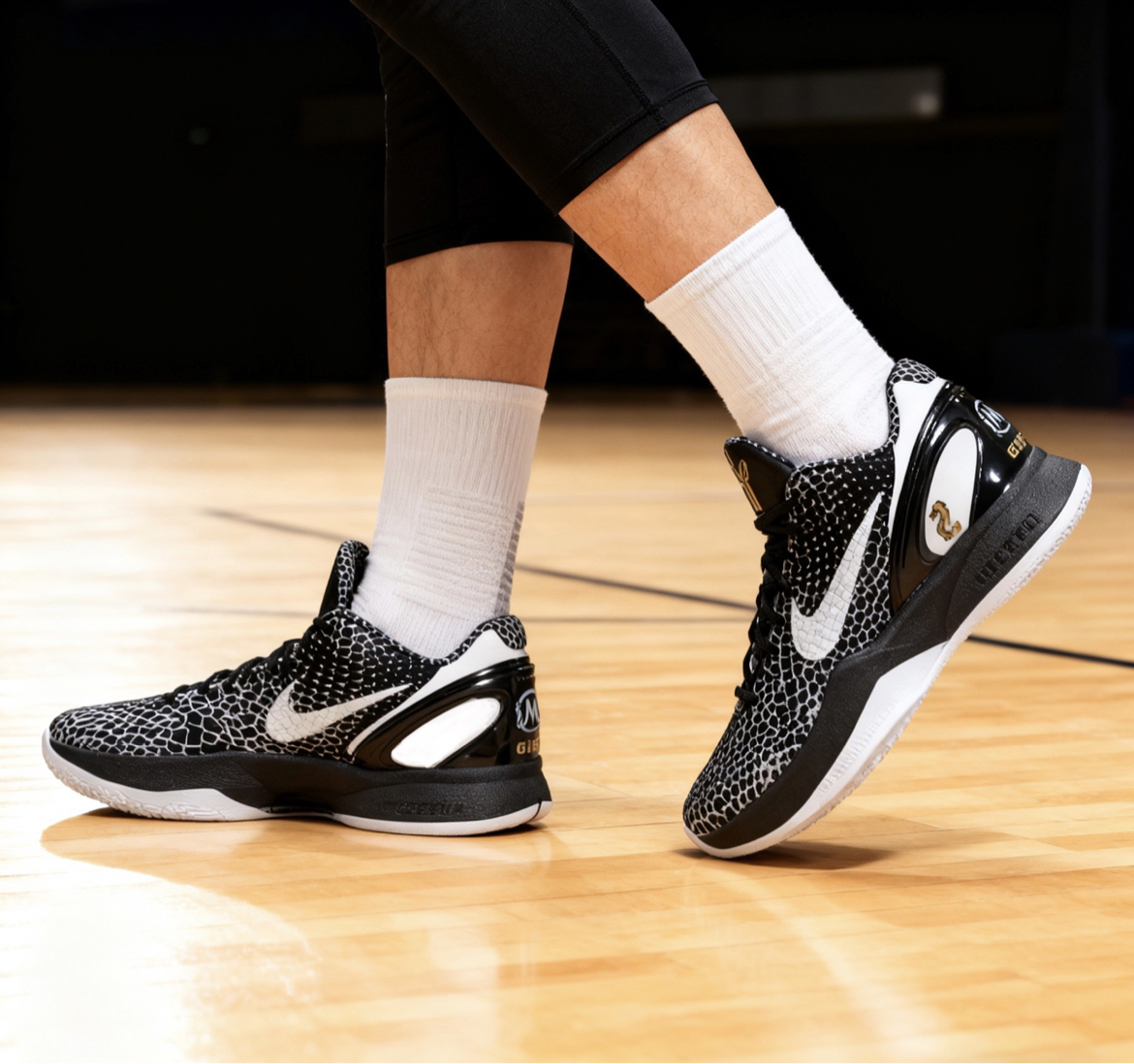 科比6 Gigi配色|情怀与实战真的能两全! 这双Kobe 6 Gigi配色真的自带纪念意义buff为了缅怀科比和Gigi打造的设计,两只鞋上都印着Gigi的球衣号码,黑白主调简约又大气,上脚自带一种肃穆又帅气的感觉,情怀党直接破防!实战党来唠点真实感受,不吹不黑:抓地力真的没话说!水波纹外底+生胶配方,室内场打球吱吱响,急停变向稳得一批,完全不拖沓;但灰尘多的场地会轻微打滑,得勤擦鞋底。缓震属...