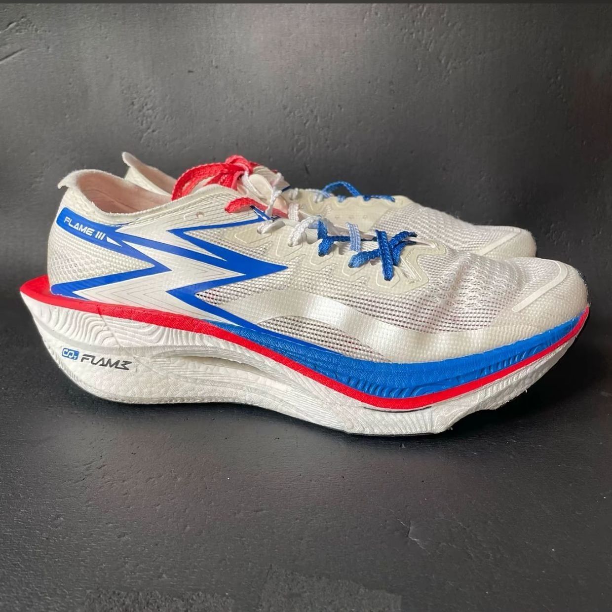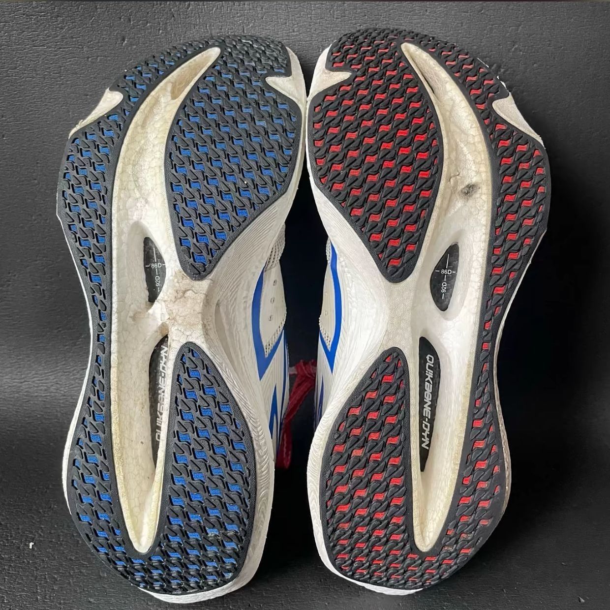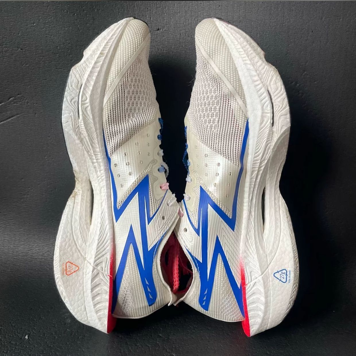 这双飞燃3的配色是白蓝红撞色,清新亮眼又有速度感,很适合日常穿搭+竞速场景。 - 鞋面:轻薄工程网纱,透气感拉满,配合动态鞋带系统,包裹贴合但不压脚; - 中底:全掌巭PRO泡棉+全掌碳板,软弹反馈直接,推进力强,配速5分配内脚感轻快; - 鞋底:纹路抓地稳,轻量化橡胶材质兼顾耐磨与减重。 优点:竞速属性拉满,重量轻(单只约180g)、推进力足,透气和颜值都在线; 缺点:大体重跑者(80k...