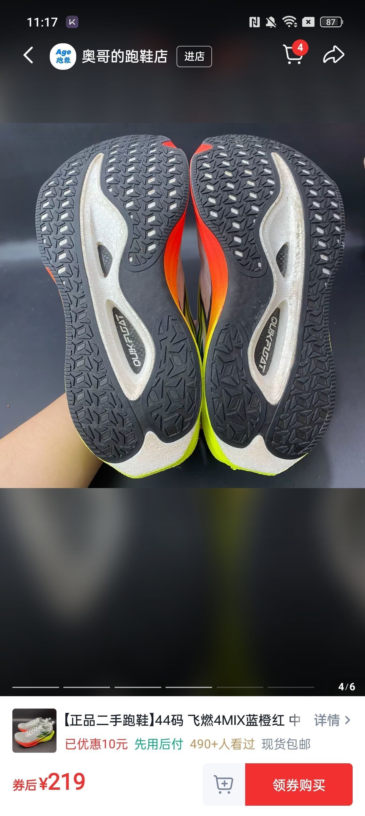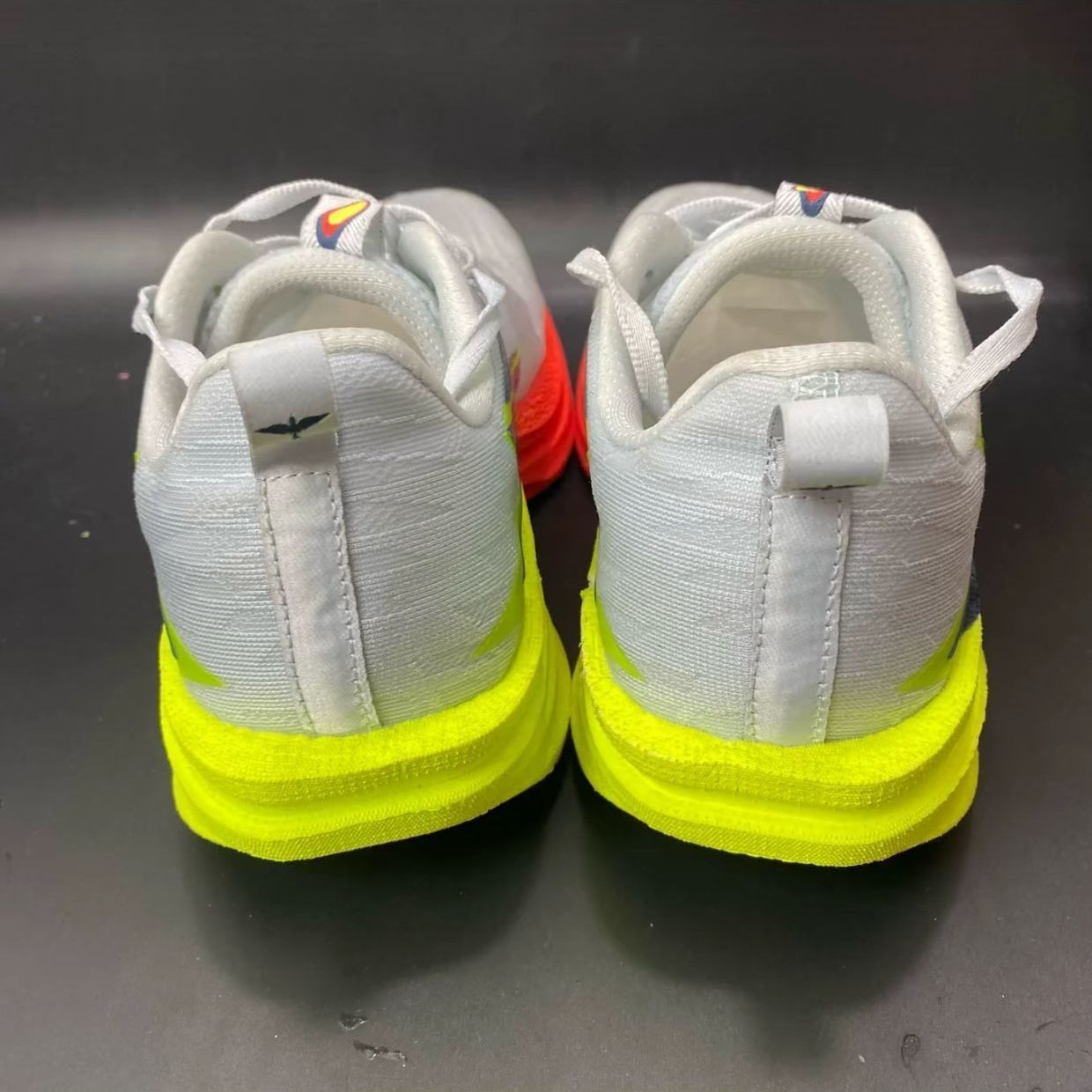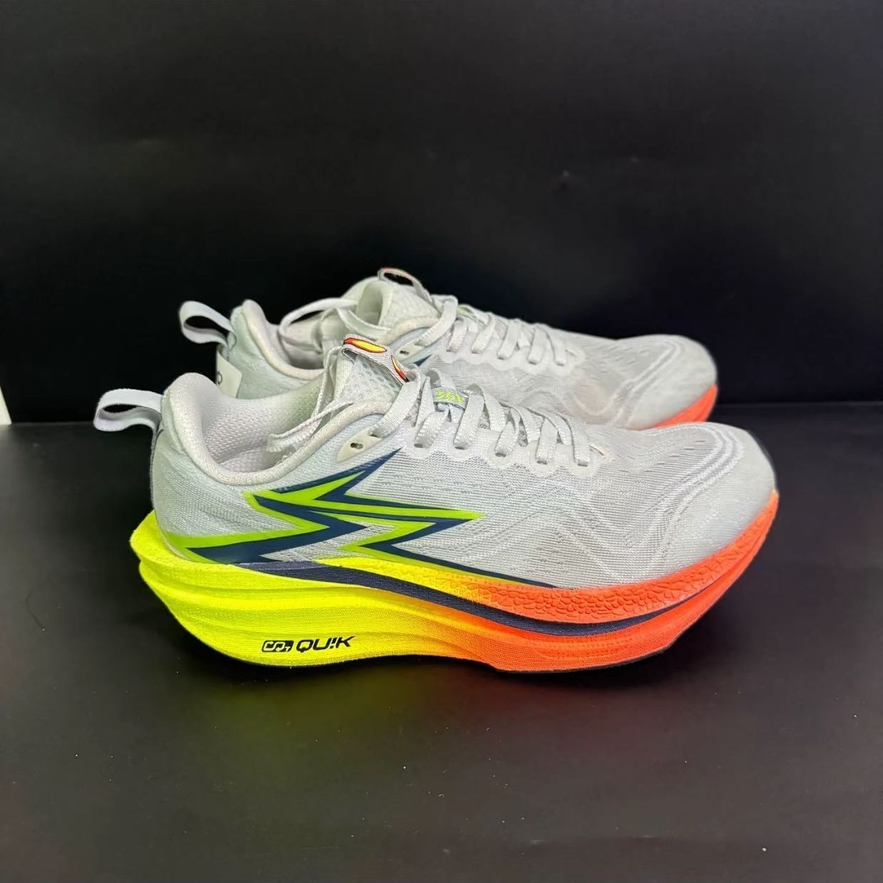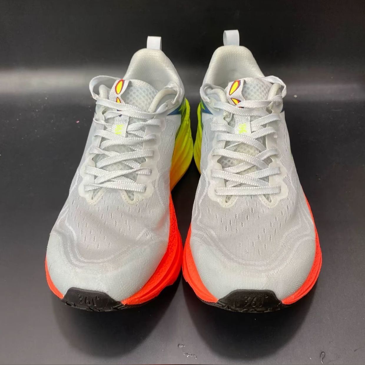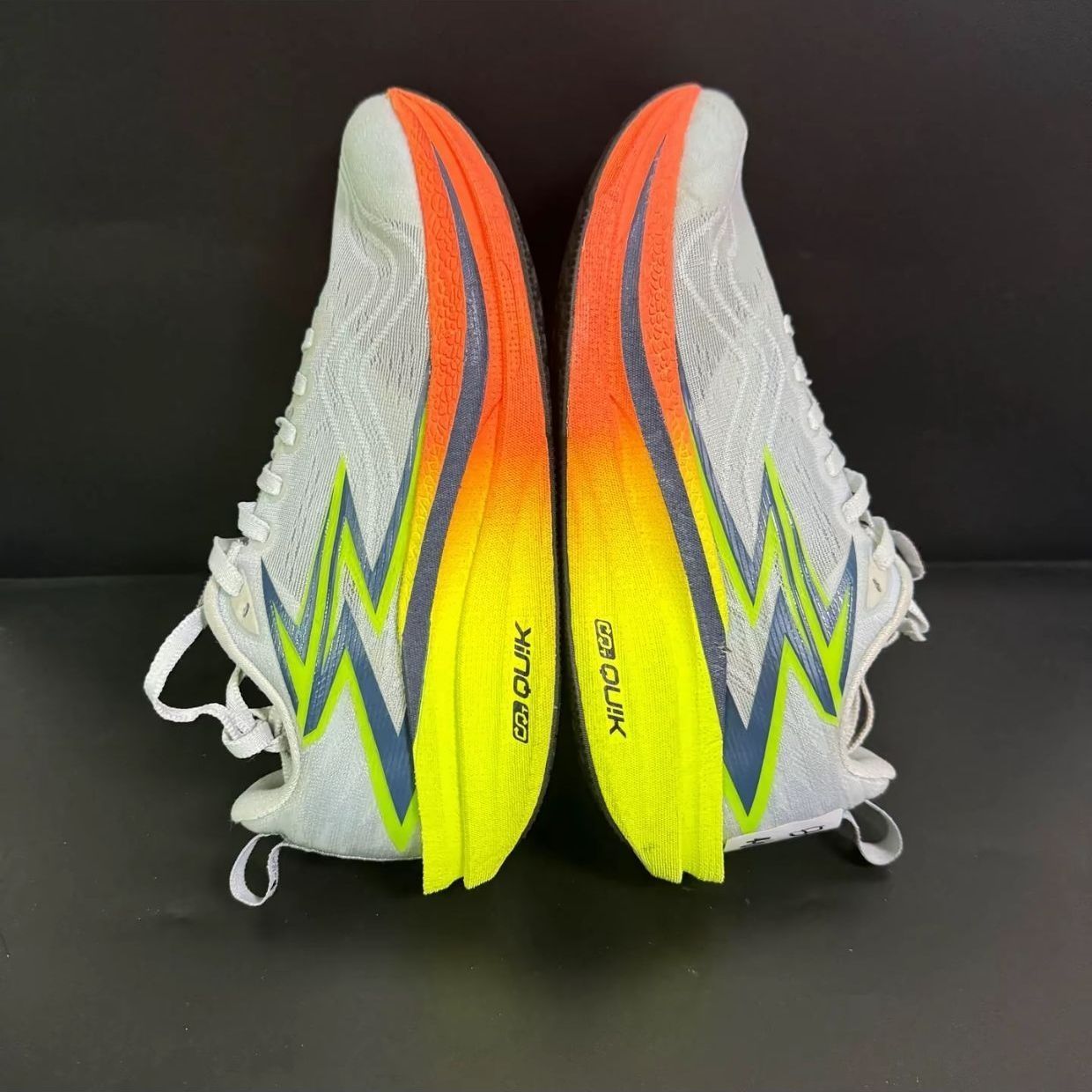 这双飞燃4MIX配色清爽亮眼: 鞋面是单层透孔贾卡,透气不闷脚但延展性一般; 中底是高弹发泡+柔性碳板,缓震回弹足但低配速下推进感弱; 鞋底RPU材质耐磨抓地强。 优点是轻量零驾驭门槛、适配多种脚型, 缺点是宽脚需选大半码、高足弓支撑不足。