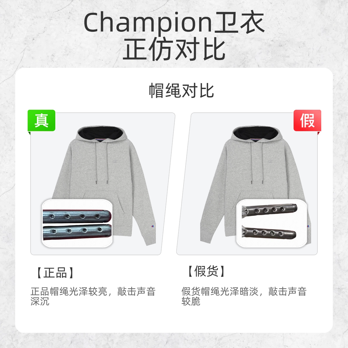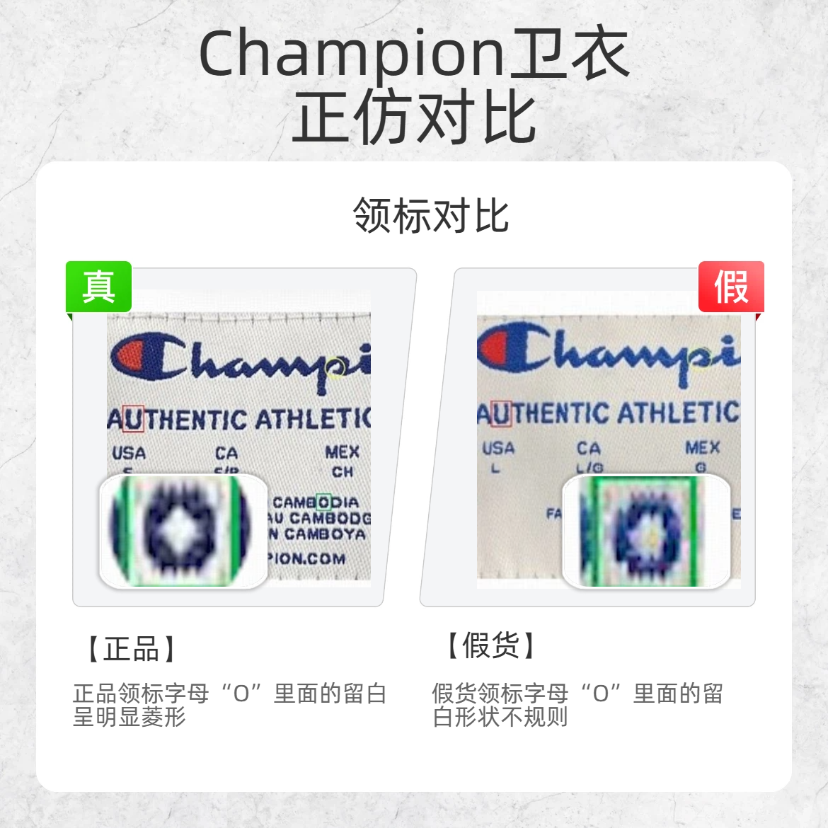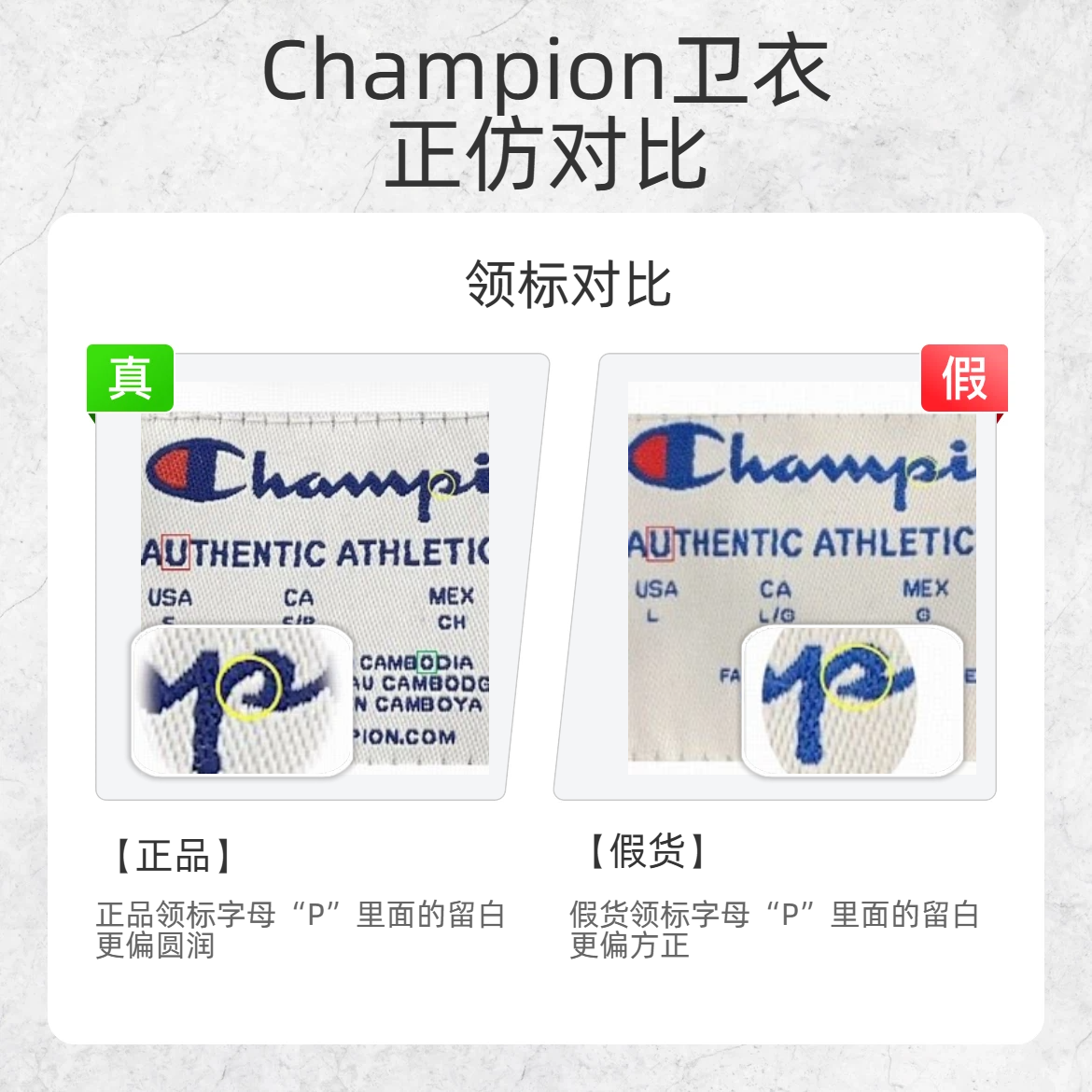 买 Champion 卫衣怕踩雷?掌握这几点,假货瞬间现形! 🔍帽绳对比 正品帽绳光泽较亮,敲击声音深沉 假货帽绳光泽暗淡,敲击声音较脆 🔍领标字母 “P” 对比 正品领标字母 “P” 里面的留白更偏圆润 假货领标字母 “P” 里面的留白更偏方正 🔍领标字母 “O” 对比 正品领标字母 “O” 里面的留白呈明显菱形 假货领标字母 “O” 里面的留白形状不规则 速速收藏转发这条鉴别帖,再也不...