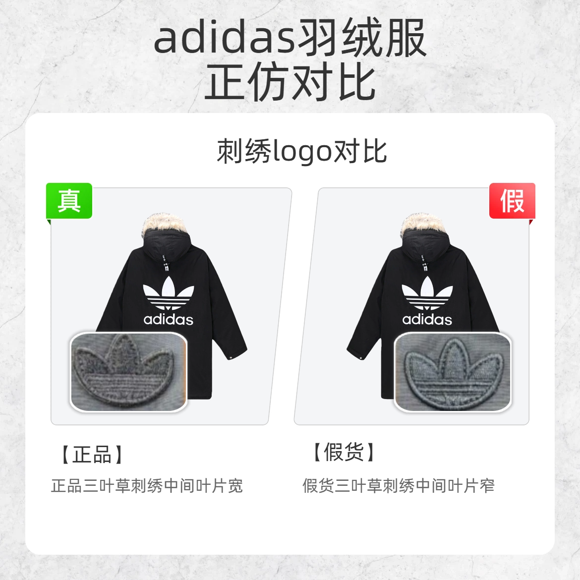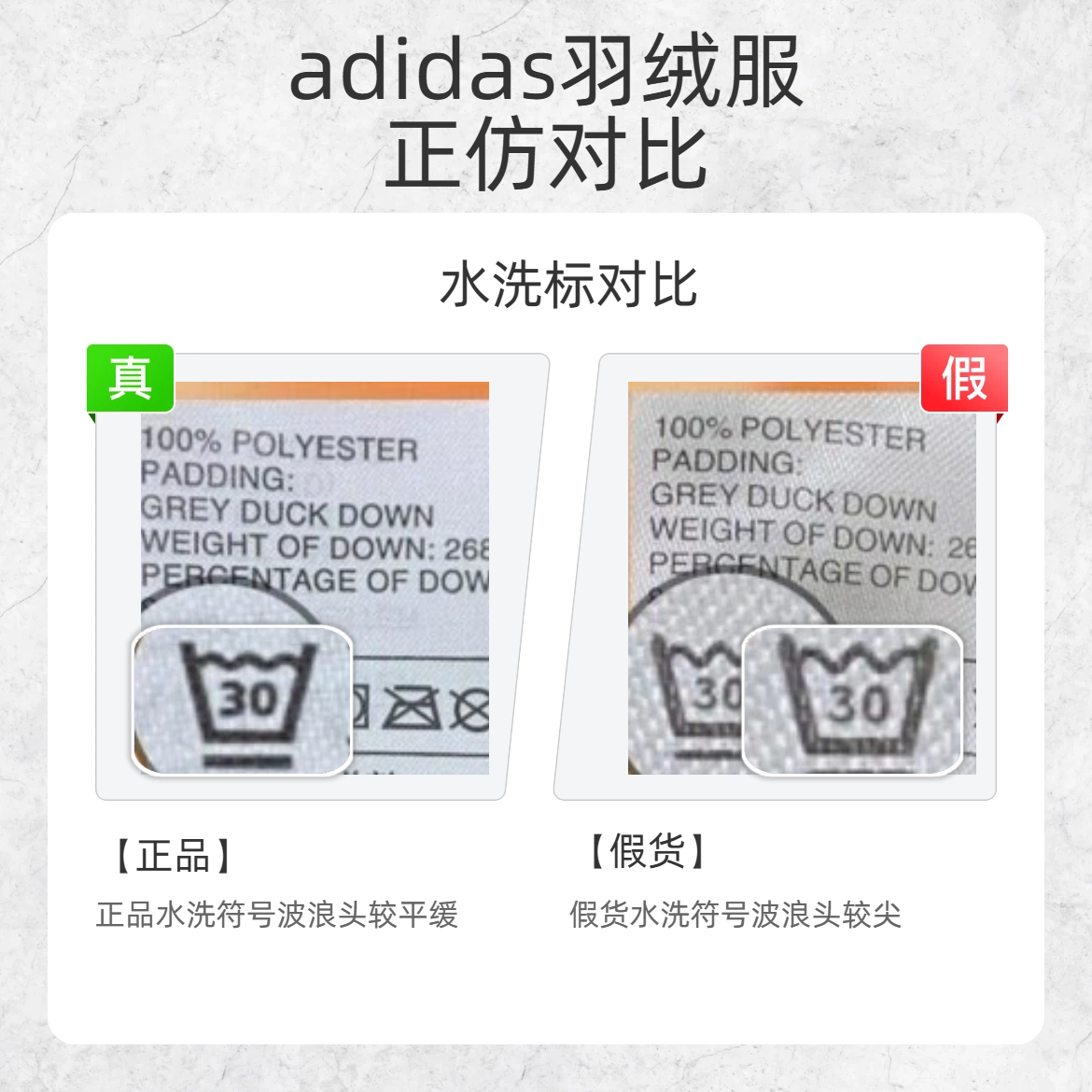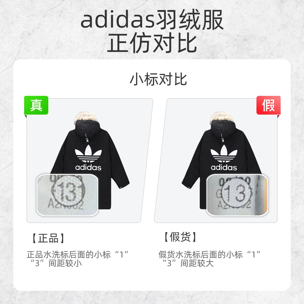 宝子们买 adidas 羽绒服别盲目冲!假货套路深,这几个鉴别点必须码住! 🔍刺绣 logo 对比 - 正品三叶草刺绣中间叶片宽 - 假货三叶草刺绣中间叶片窄 🔍水洗标对比 - 正品水洗符号波浪头较平缓 - 假货水洗符号波浪头较尖 🔍小标对比 - 正品水洗标后面的小标 “1”“3” 间距较小 - 假货水洗标后面的小标 “1”“3” 间距较大 看完这波鉴别,再也不怕被假 adidas 羽绒服...