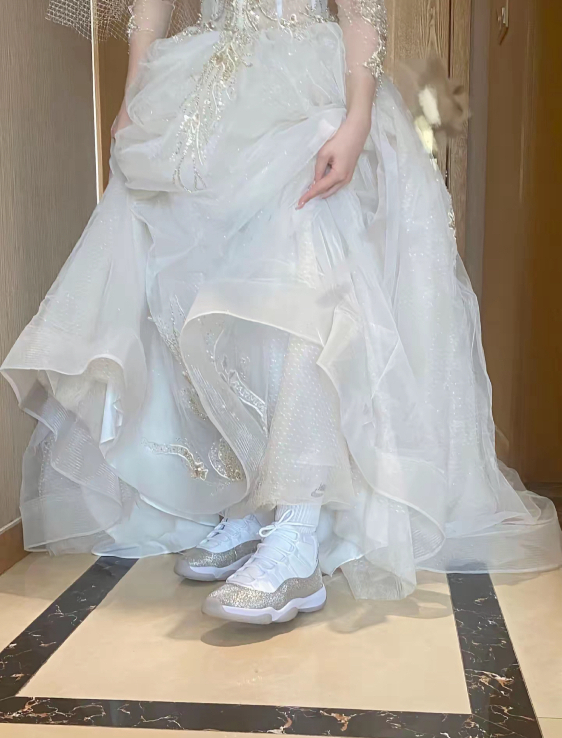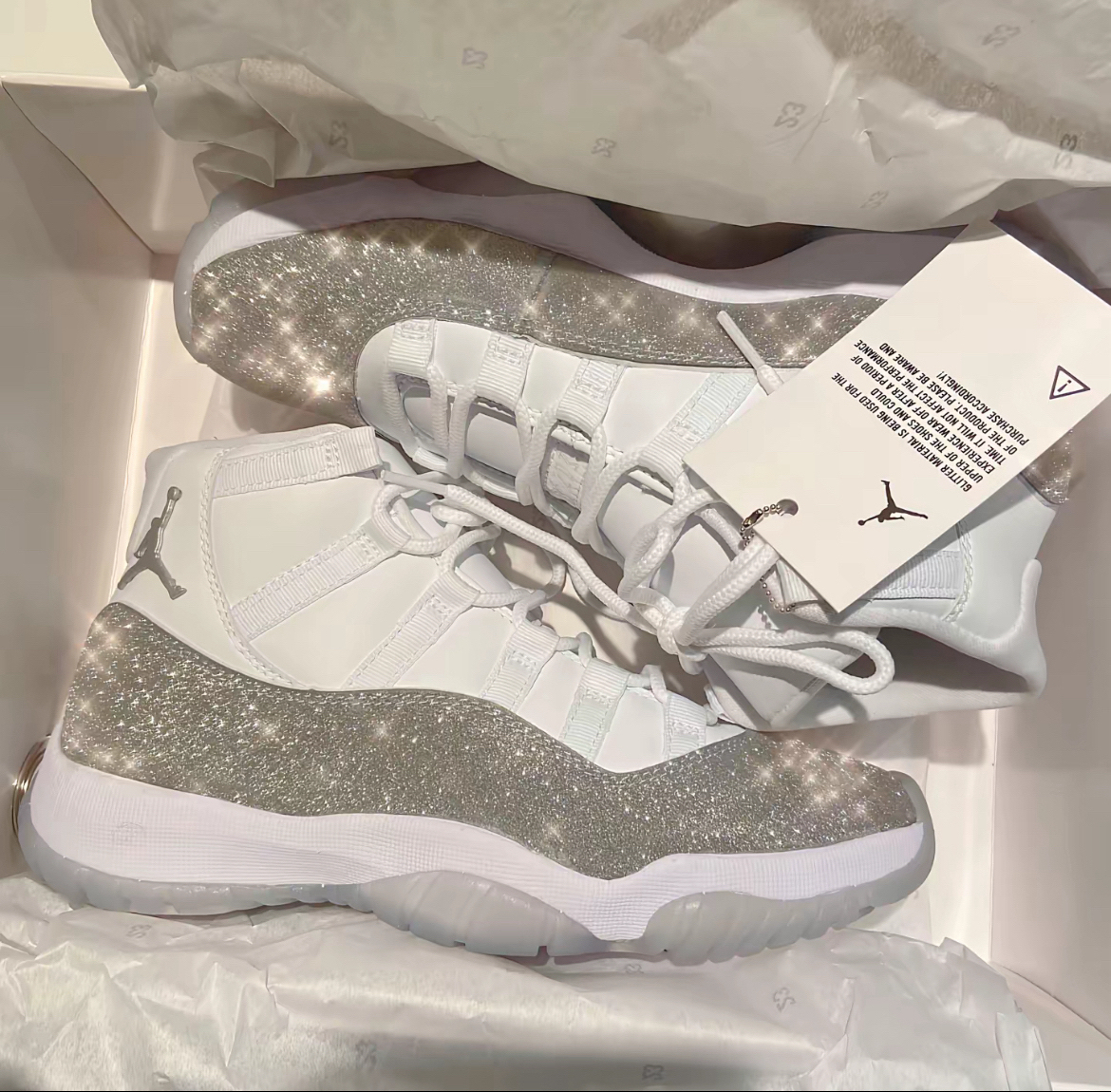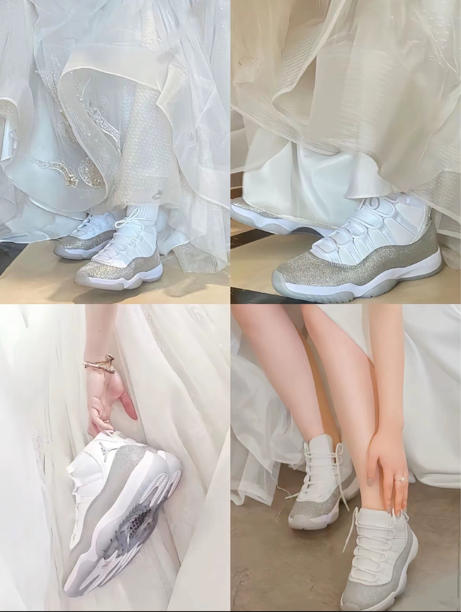 1. 视觉冲击 闪银满天星设计:鞋身以白色为基底,传统漆皮部分替换为珠光银闪粉涂层,光线照射下呈现璀璨的“满天星”效果,宛如银河倾泻。 - 细节奢华感:后跟银线刺绣“23”、鞋侧银色金属Jumpman Logo、半透明浅灰水晶外底,整体银白配色清爽高级。 2. 工艺与配置 - 碳板支撑:中底嵌入真碳纤维板,提供抗扭转稳定性,延续AJ11的实战基因。 - 材质...