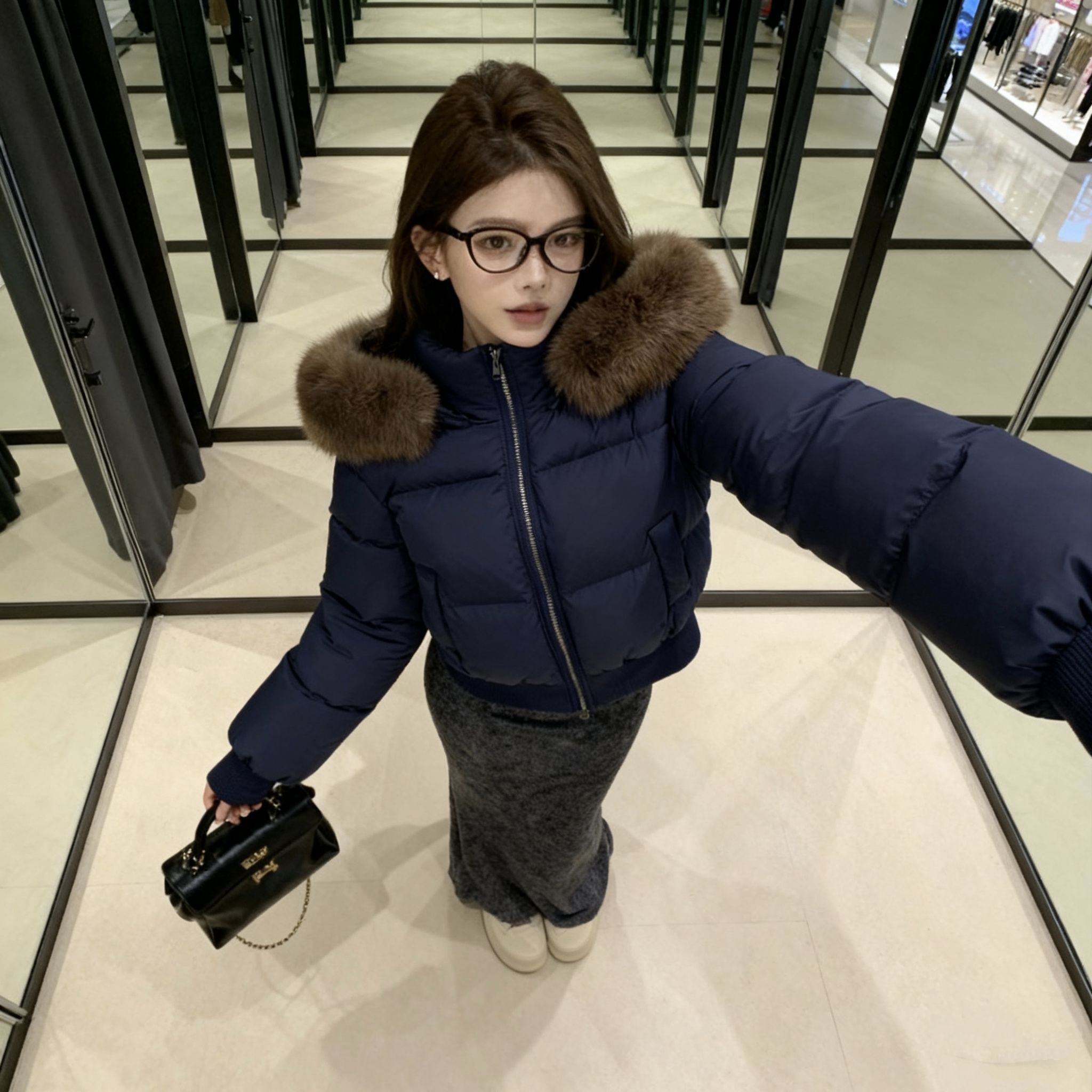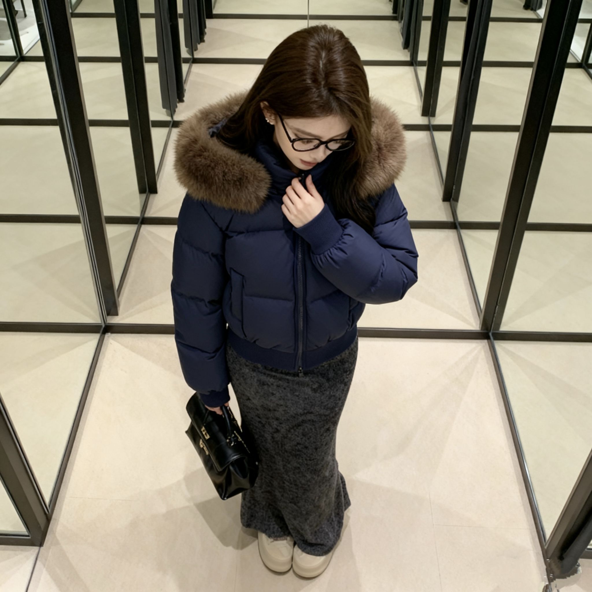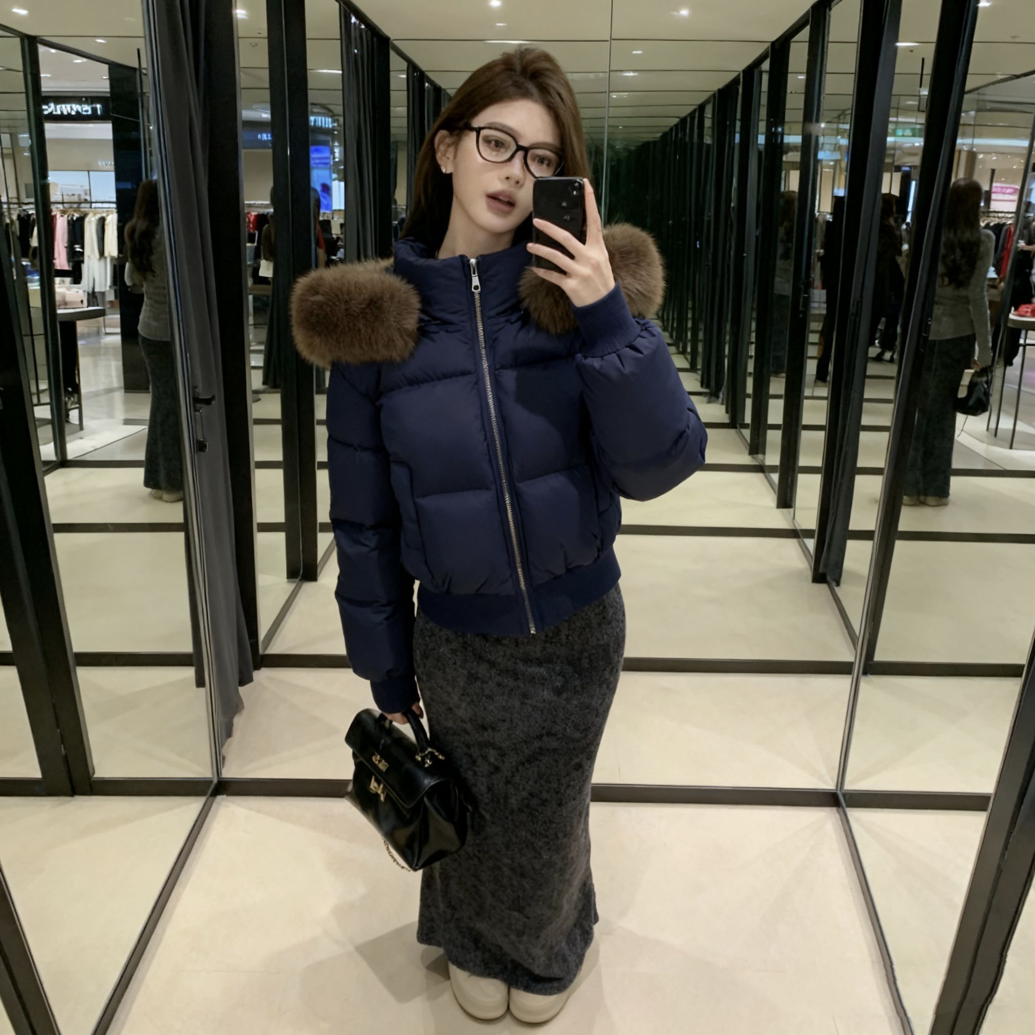 终于等到降温能穿这件羽绒服了!藏蓝色巨显白,肩颈处的毛领是真狐狸毛,摸起来软乎乎的一点不廉价~短款版型对163的我太友好,配高腰鱼尾裙刚好露脚踝,显高又不臃肿!面料是那种防泼水的,昨天逛商场溅到奶茶擦一下就没了。内搭穿修身针织衫刚好,南方初冬单穿完全够暖,北方加个毛衣也不挤。鞋子搭的厚底面包鞋,走一下午脚不疼,包包选了小香风款,整体就是韩系温柔姐姐感,今天被三个路人问链接了!