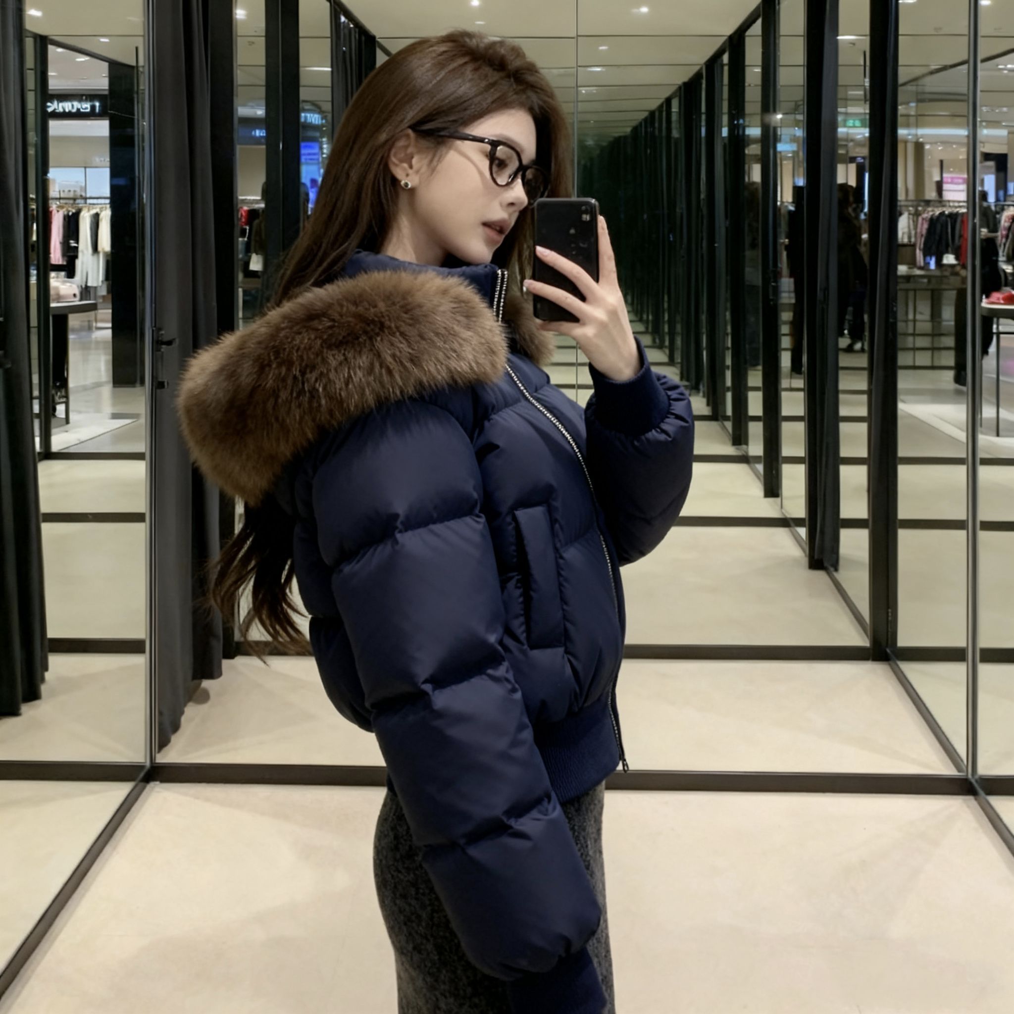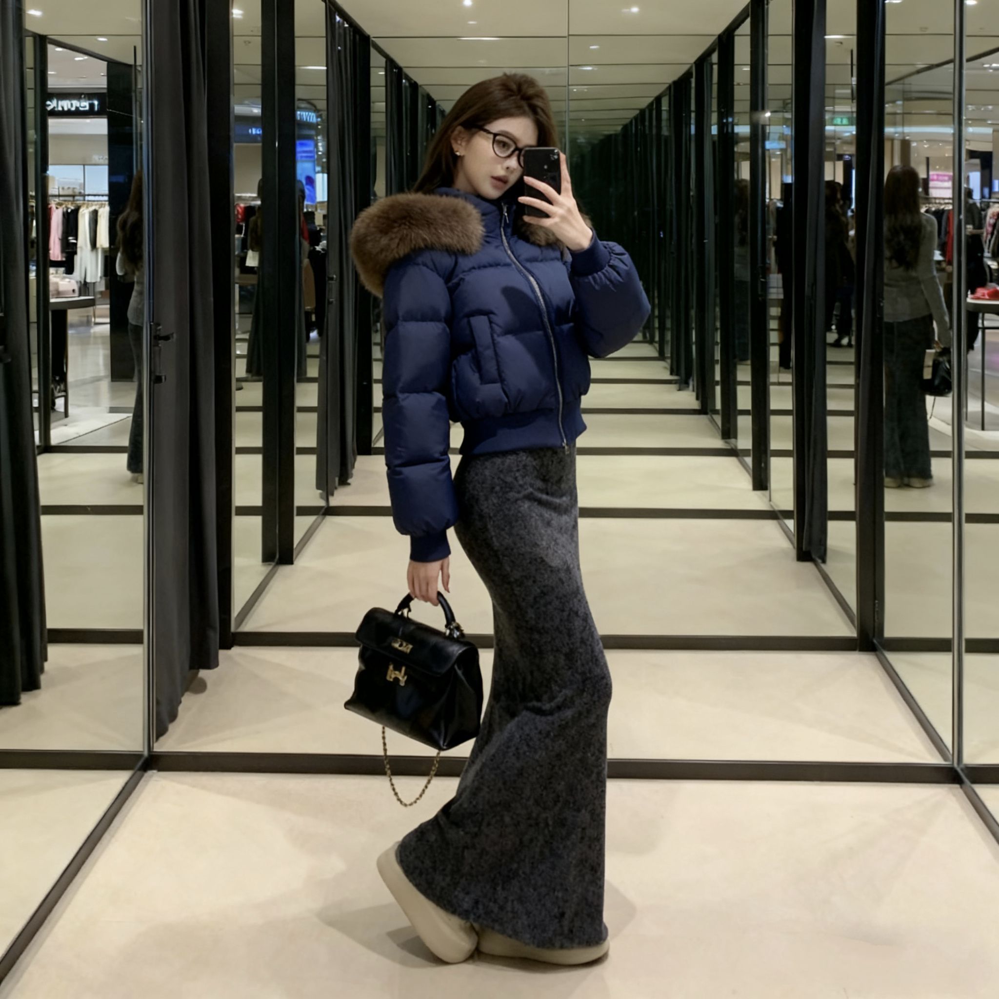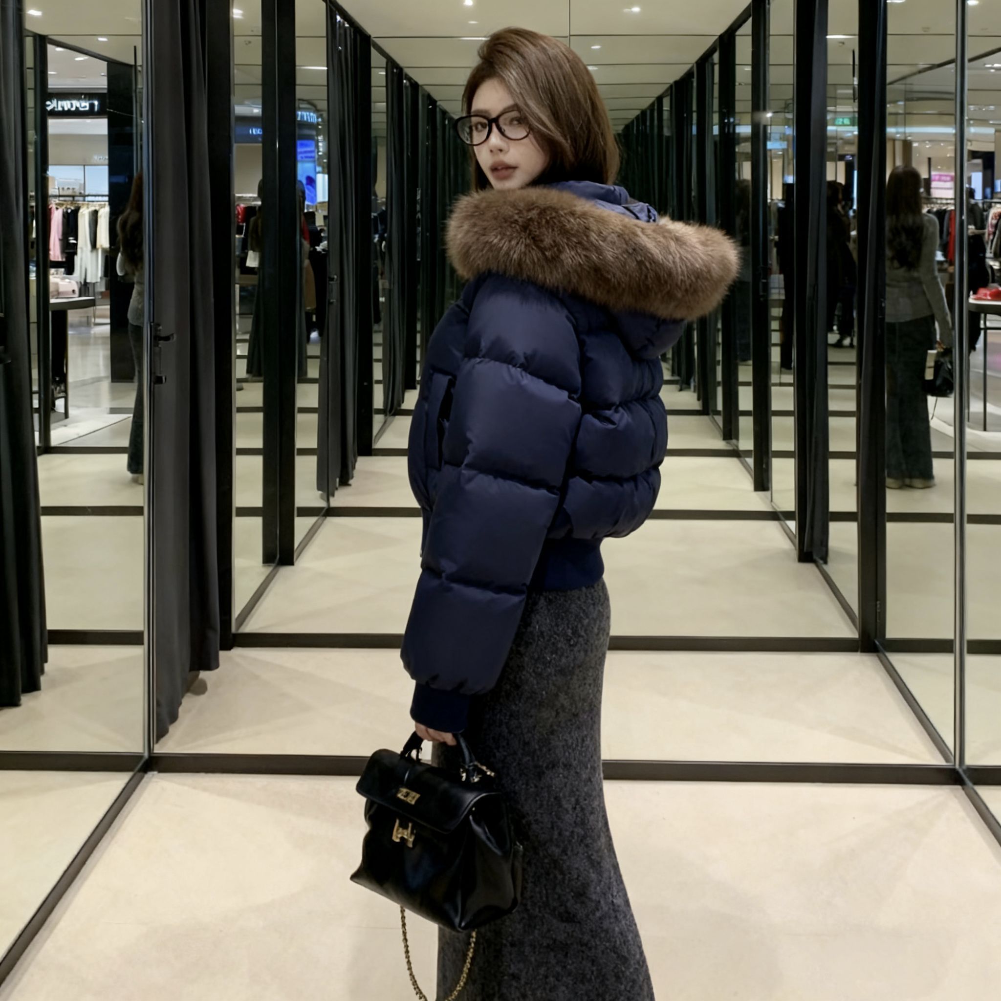 终于等到降温能穿这件羽绒服了!藏蓝色巨显白,肩颈处的毛领是真狐狸毛,摸起来软乎乎的一点不廉价~短款版型对163的我太友好,配高腰鱼尾裙刚好露脚踝,显高又不臃肿!面料是那种防泼水的,昨天逛商场溅到奶茶擦一下就没了。内搭穿修身针织衫刚好,南方初冬单穿完全够暖,北方加个毛衣也不挤。鞋子搭的厚底面包鞋,走一下午脚不疼,包包选了小香风款,整体就是韩系温柔姐姐感,今天被三个路人问链接了!