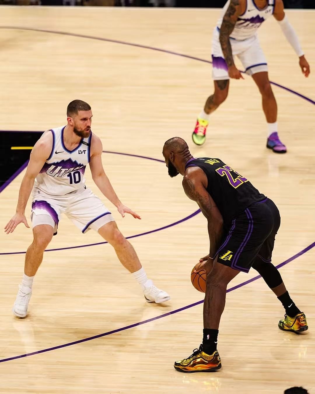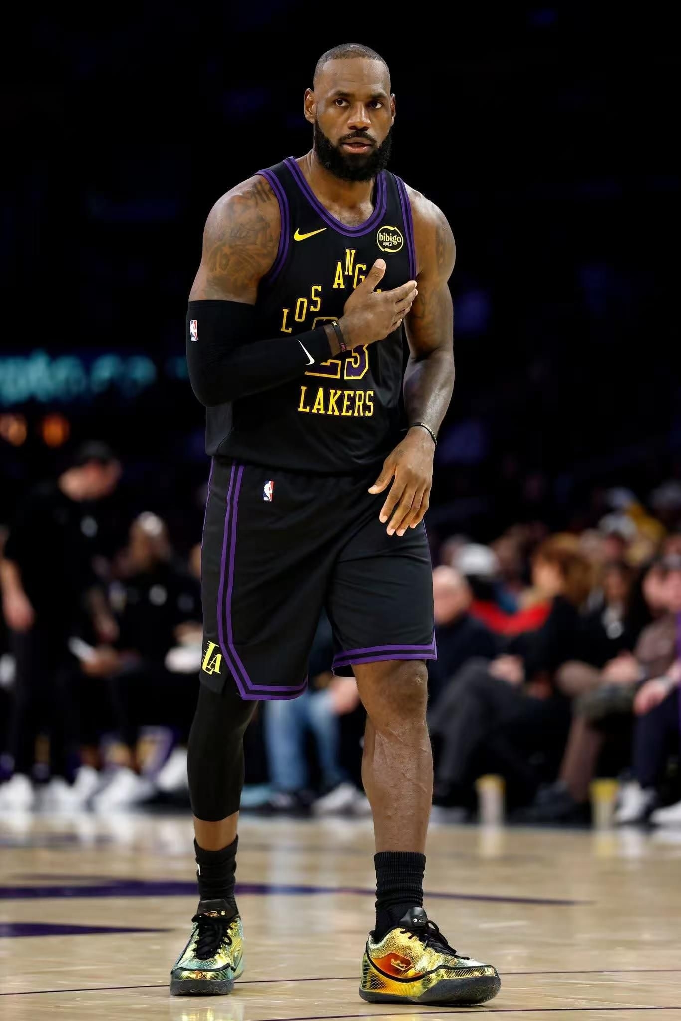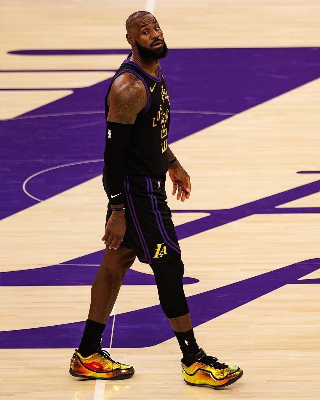 当镜头定格在这片熟悉的木地板上,23号的背影里藏着太多故事——从克利夫兰的少年意气,到迈阿密的热血沸腾,再到如今身披紫金战袍的从容笃定。 黑色球衣上的金色字样泛着光,像他职业生涯里那些被反复提及的高光时刻,每一道纹路都印着“不服输”的倔强。脚下的战靴闪着金属质感的光泽,踩过的是二十多年的汗水与掌声,也是无数个凌晨四点的坚持,更是把“不可能”变成“我做到了”的底气。