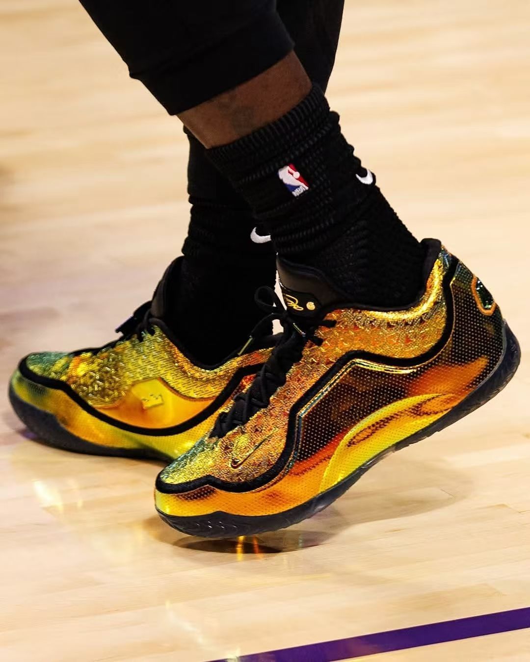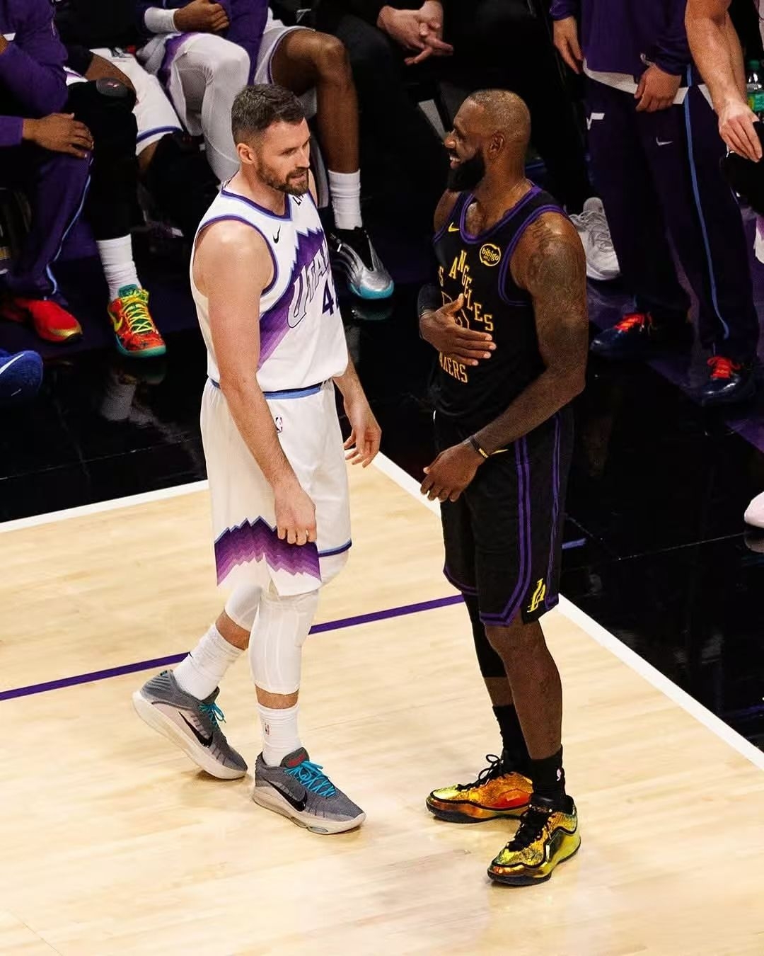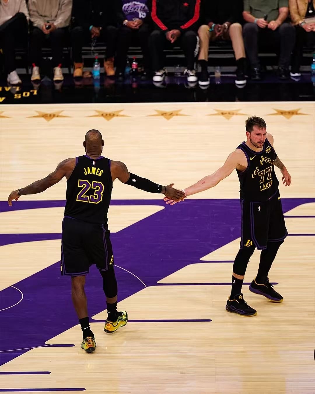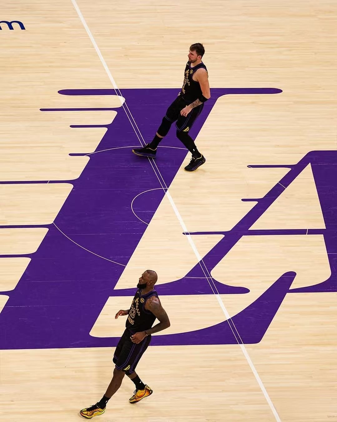 当镜头定格在这片熟悉的木地板上,23号的背影里藏着太多故事——从克利夫兰的少年意气,到迈阿密的热血沸腾,再到如今身披紫金战袍的从容笃定。 黑色球衣上的金色字样泛着光,像他职业生涯里那些被反复提及的高光时刻,每一道纹路都印着“不服输”的倔强。脚下的战靴闪着金属质感的光泽,踩过的是二十多年的汗水与掌声,也是无数个凌晨四点的坚持,更是把“不可能”变成“我做到了”的底气。