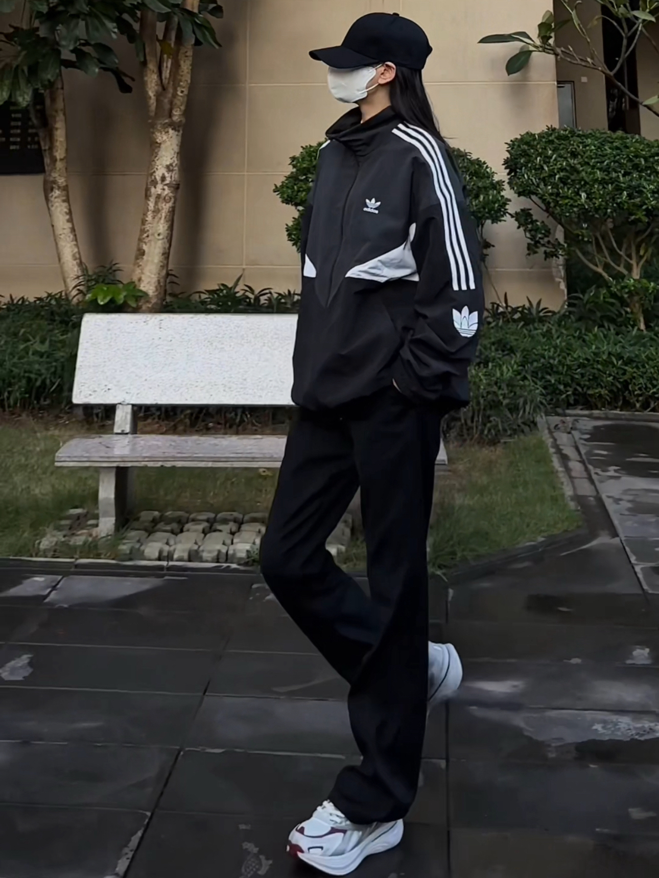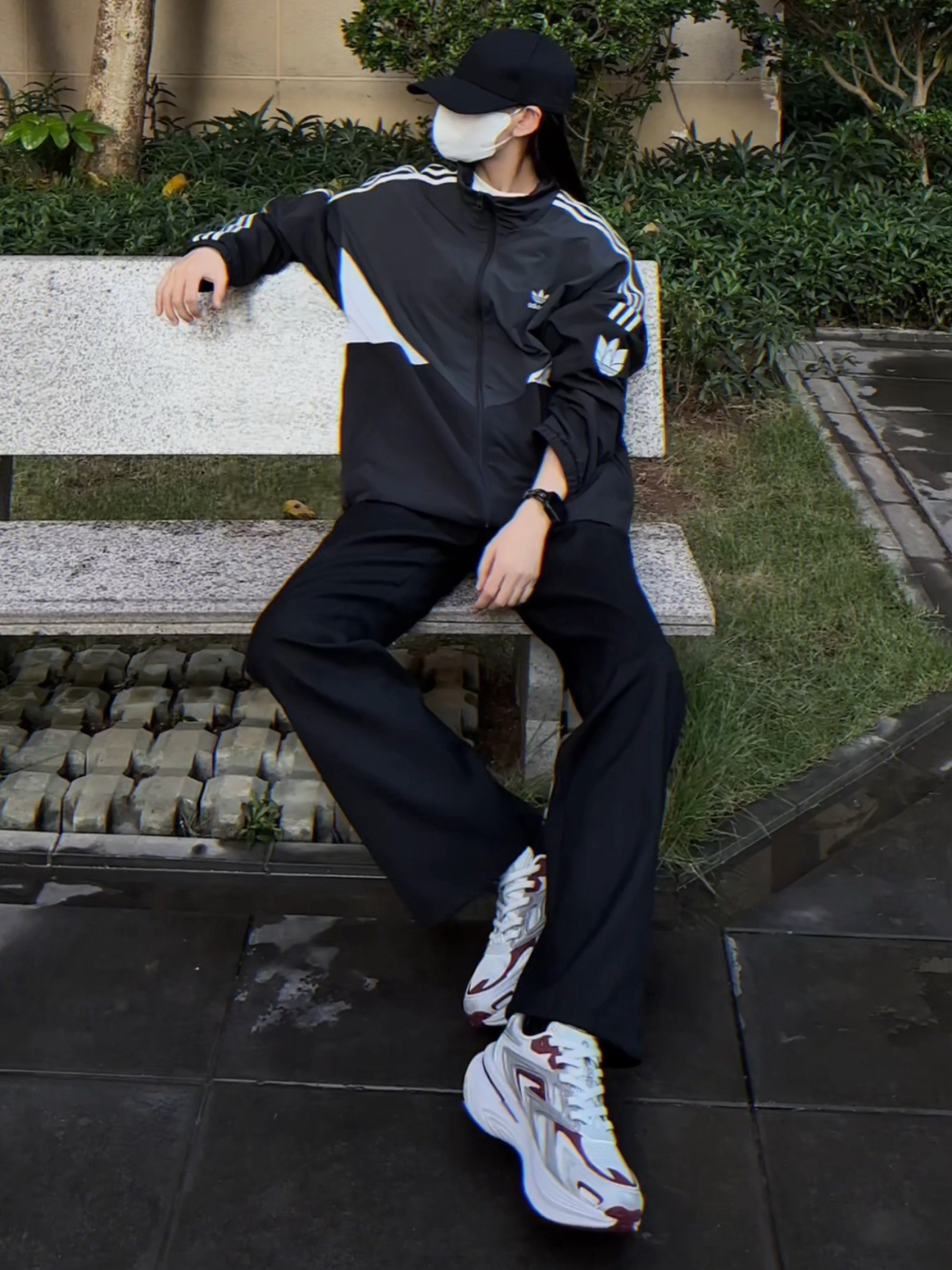 阿迪三叶草的拼接款外套,黑白撞色,复古又有辨识度 踩一双厚底老爹鞋,既增高又和整体风格呼应 配饰用黑帽+口罩做“氛围神器”,低调又有酷感,日常出街/公园闲逛穿都舒服又好看~