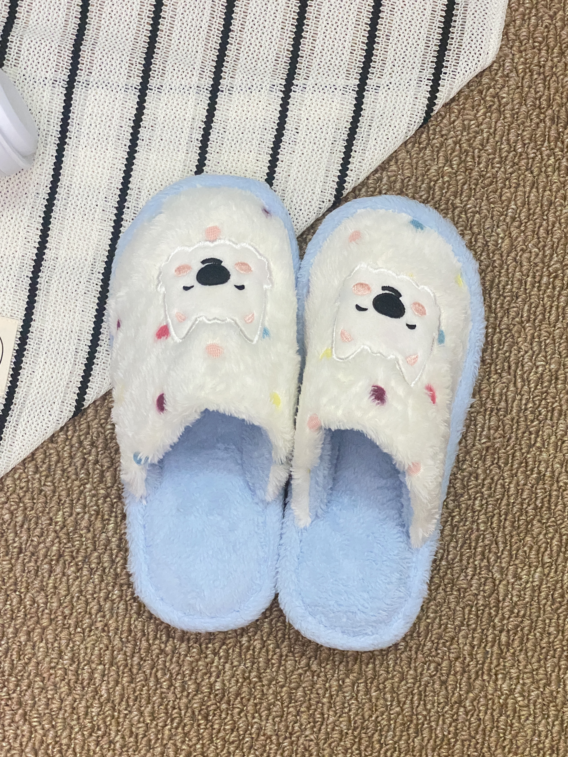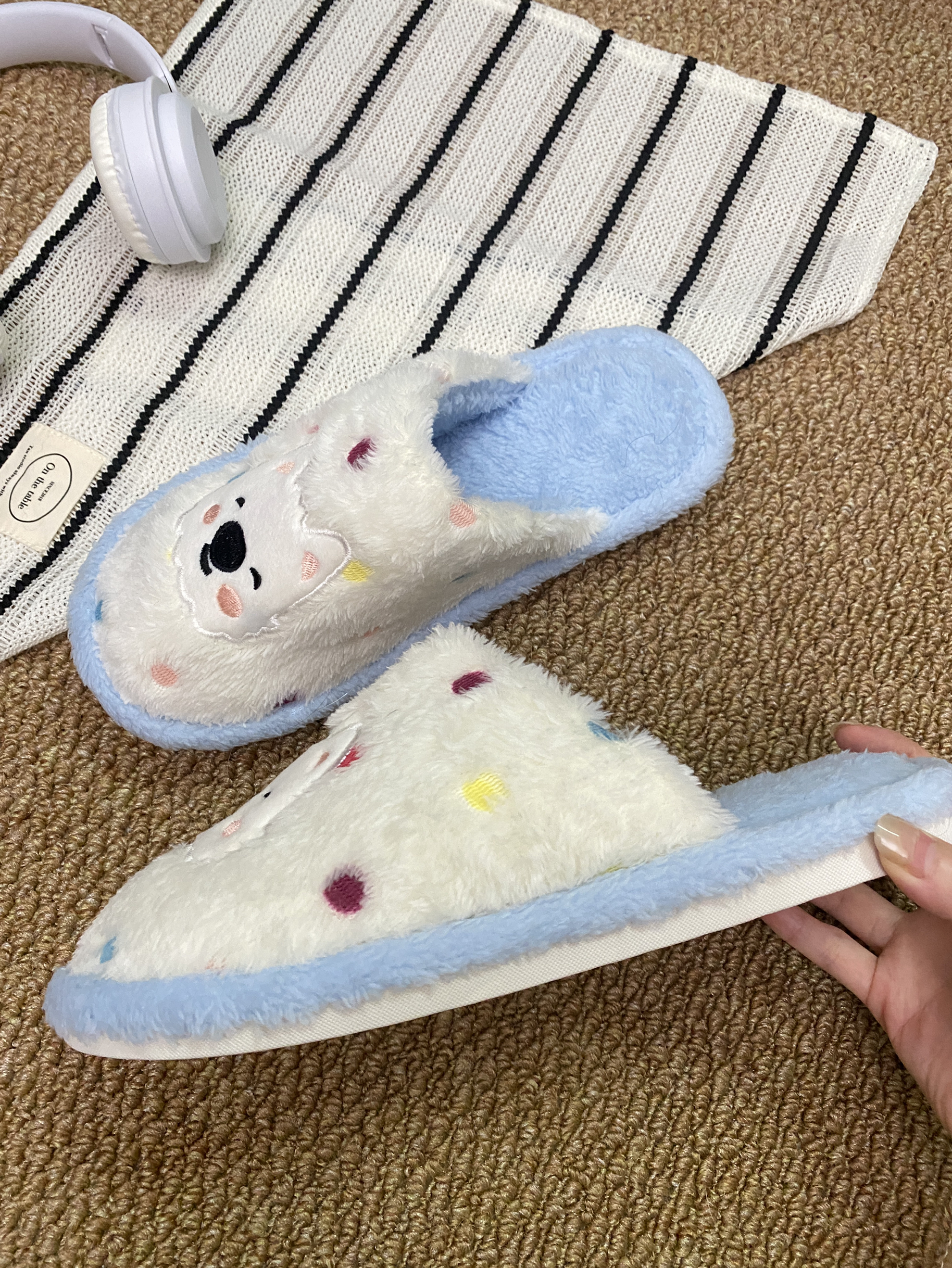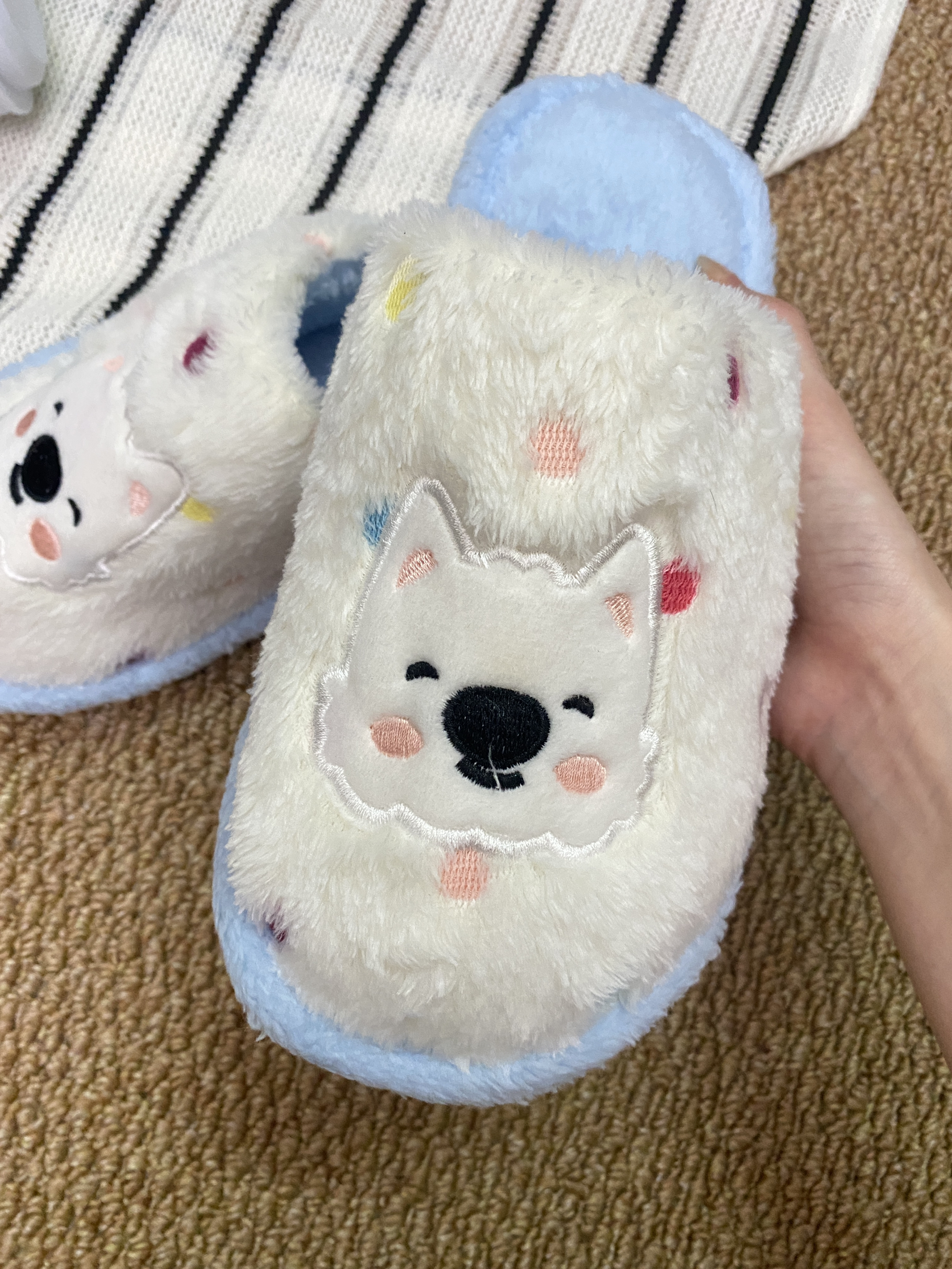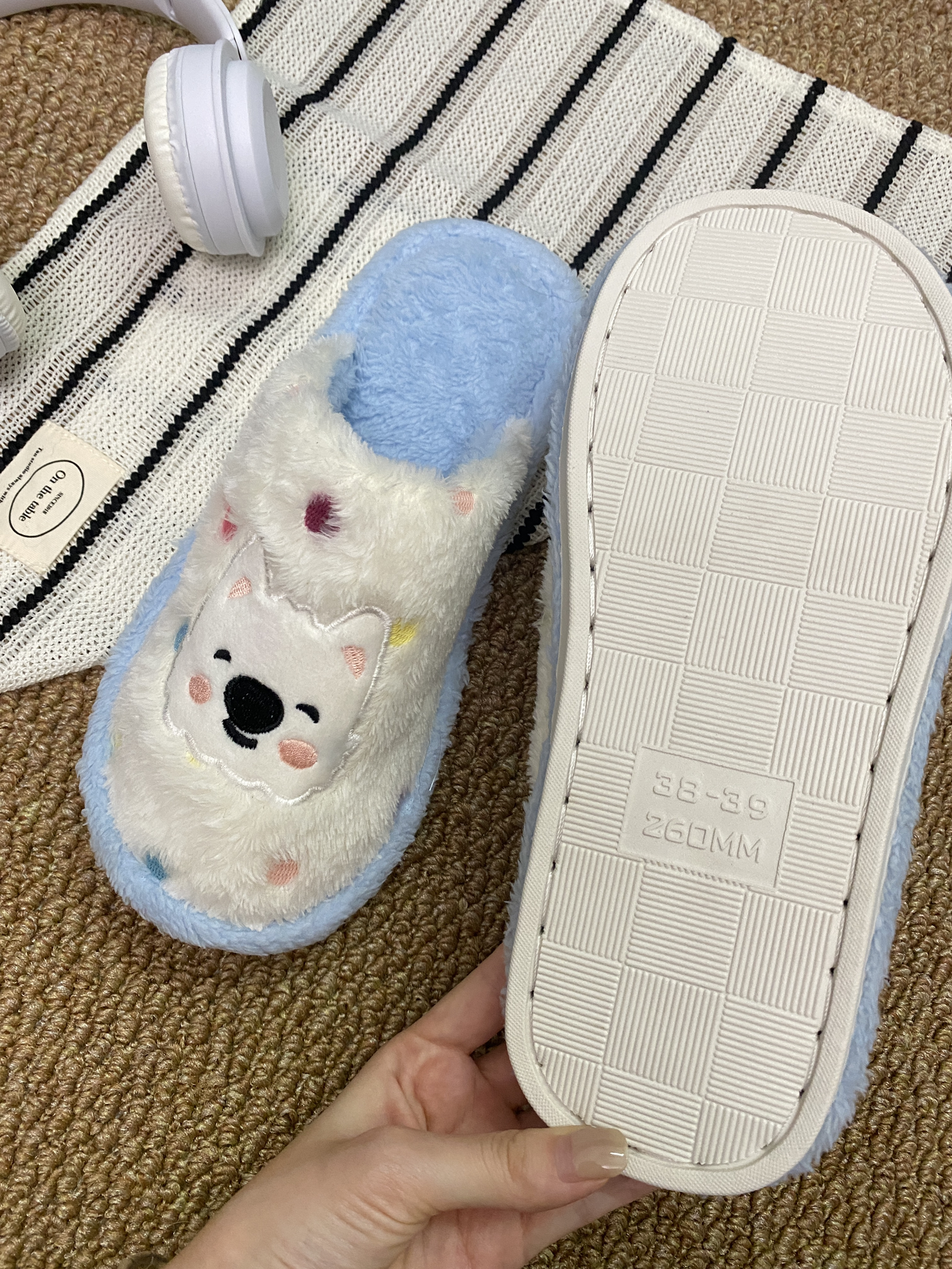 这个蓝白配色的小狗棉拖真的是我的心头好! 就是穿久了有点热! 其他的细节还是很不错的! 哦对了!还有就是不增高介意的再重新考虑一下哦